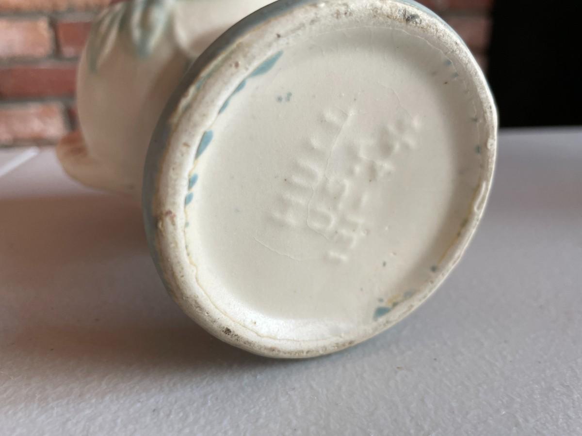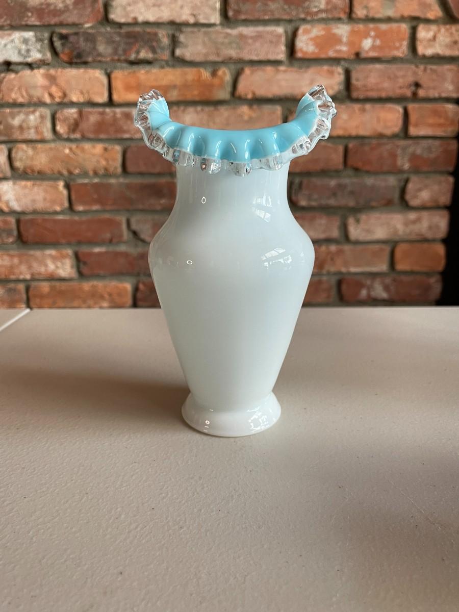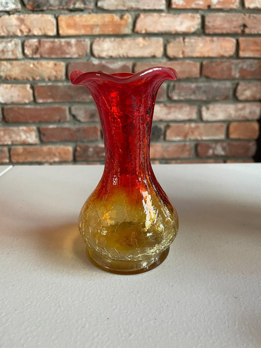 Vintage Hull open rose art pottery. Fenton Aqua Crest double crimp vase. Vintage Roseville pottery green peony vase. Vintage Amberina crackle glass vase.Blue and white: 3 1/2W x 6h