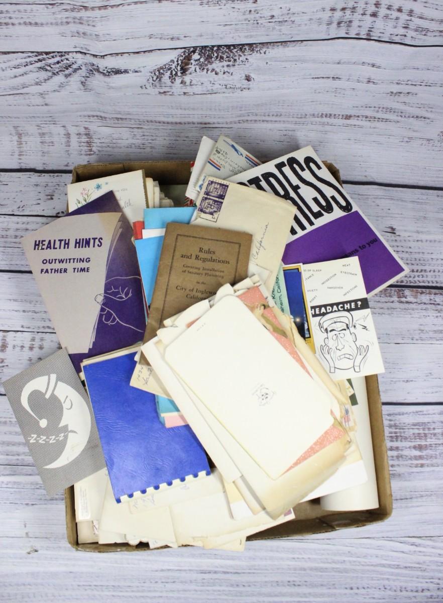 Lot of vintage post cards, handwritten letters, flyers, and some photos. There are no significant rips or tears to any of the cards or photos.
