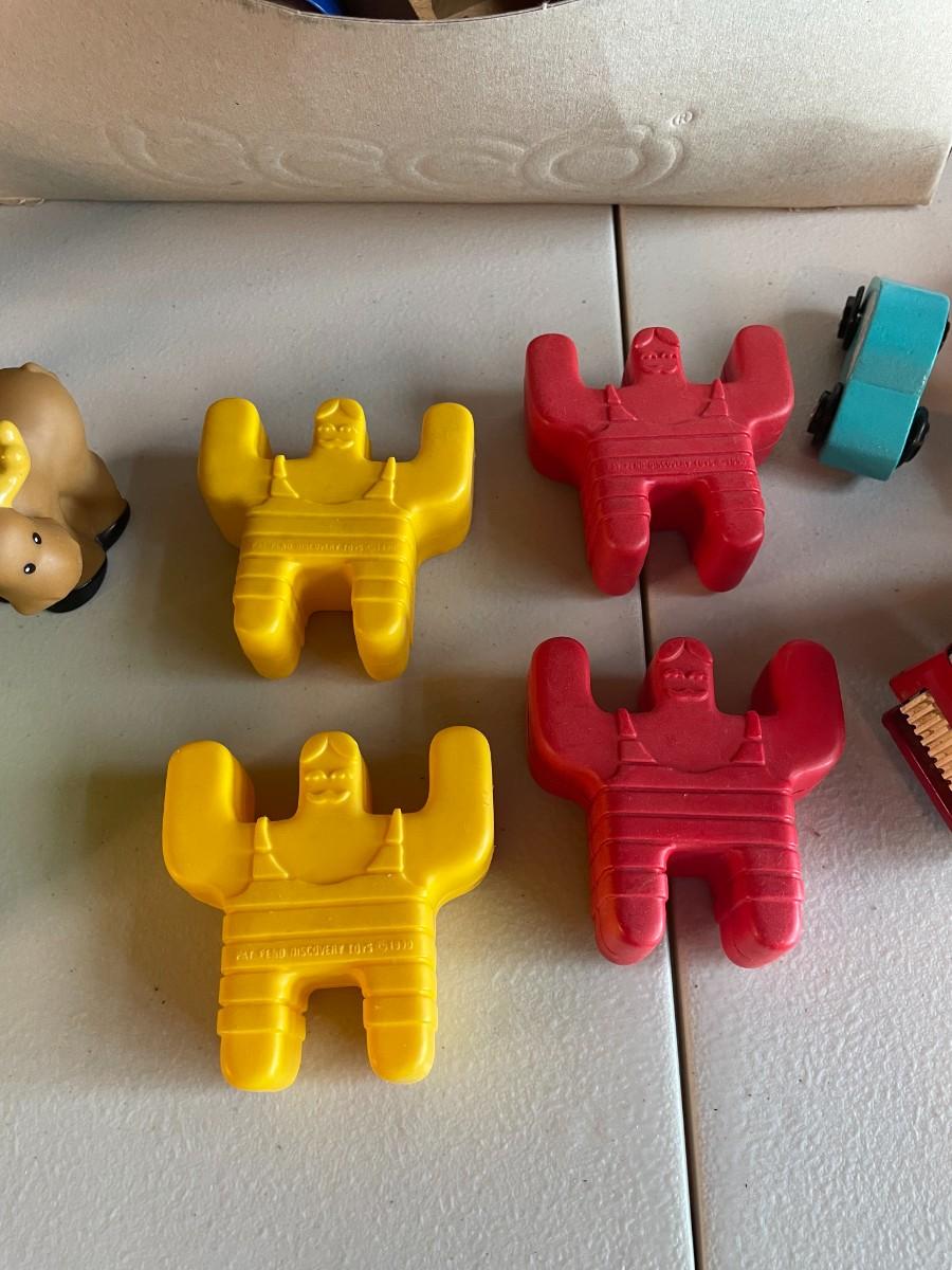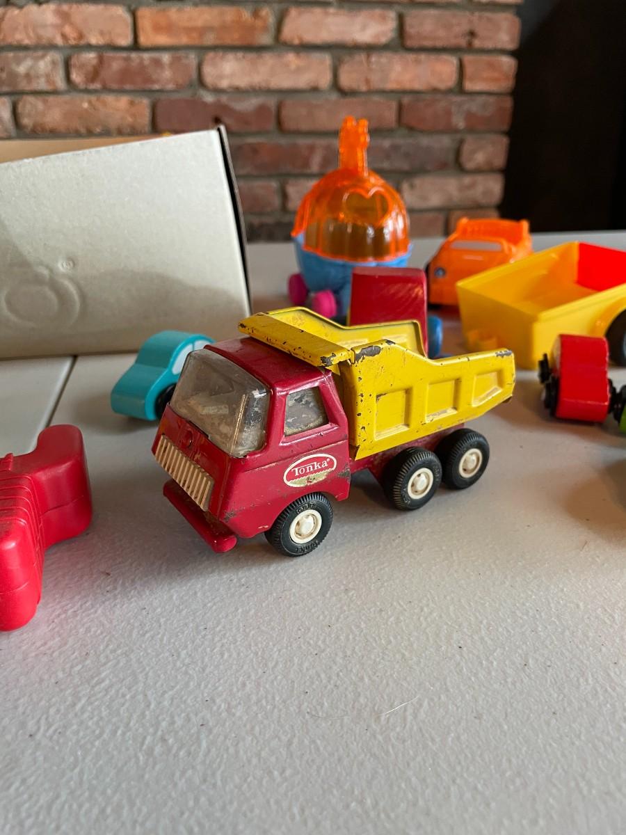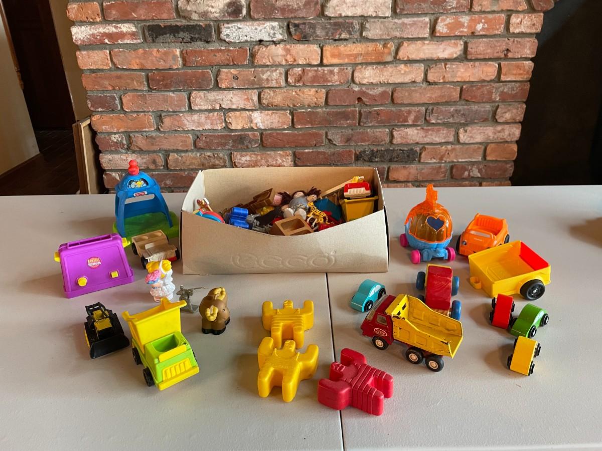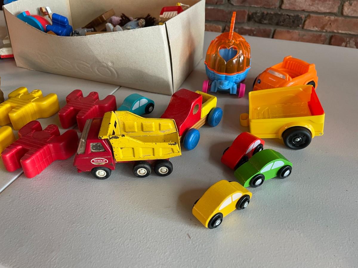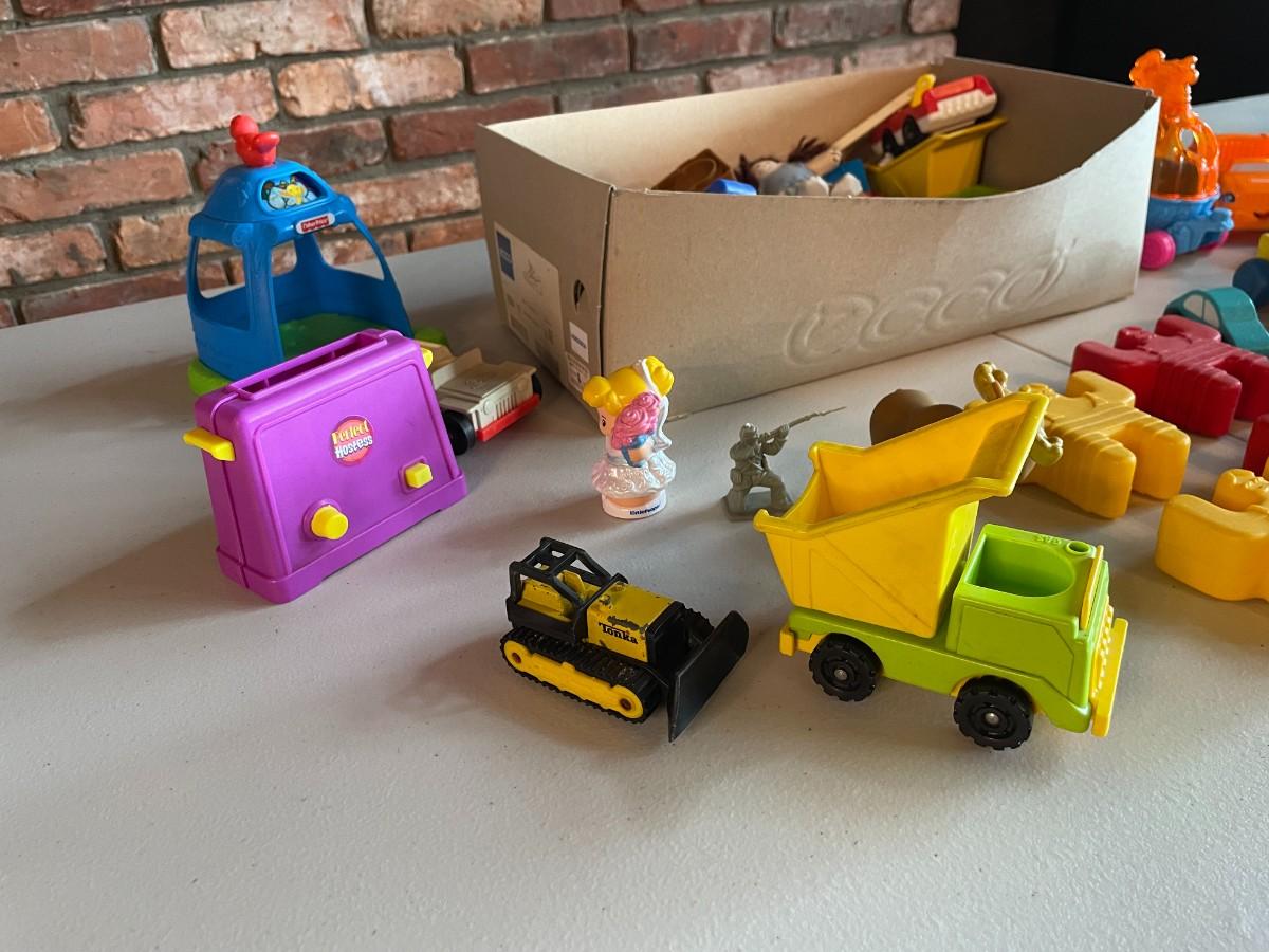 Lot features assorted kid toys like trucks, cars, and figurines.