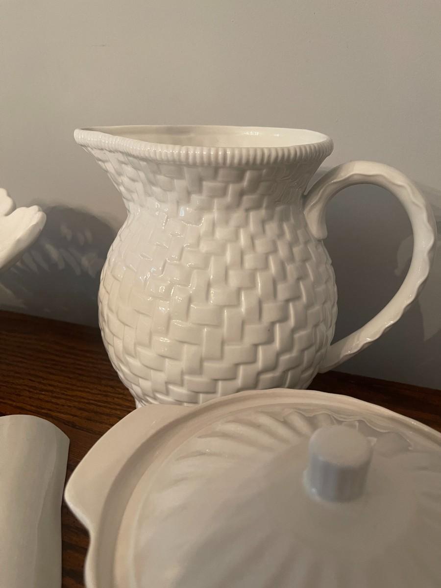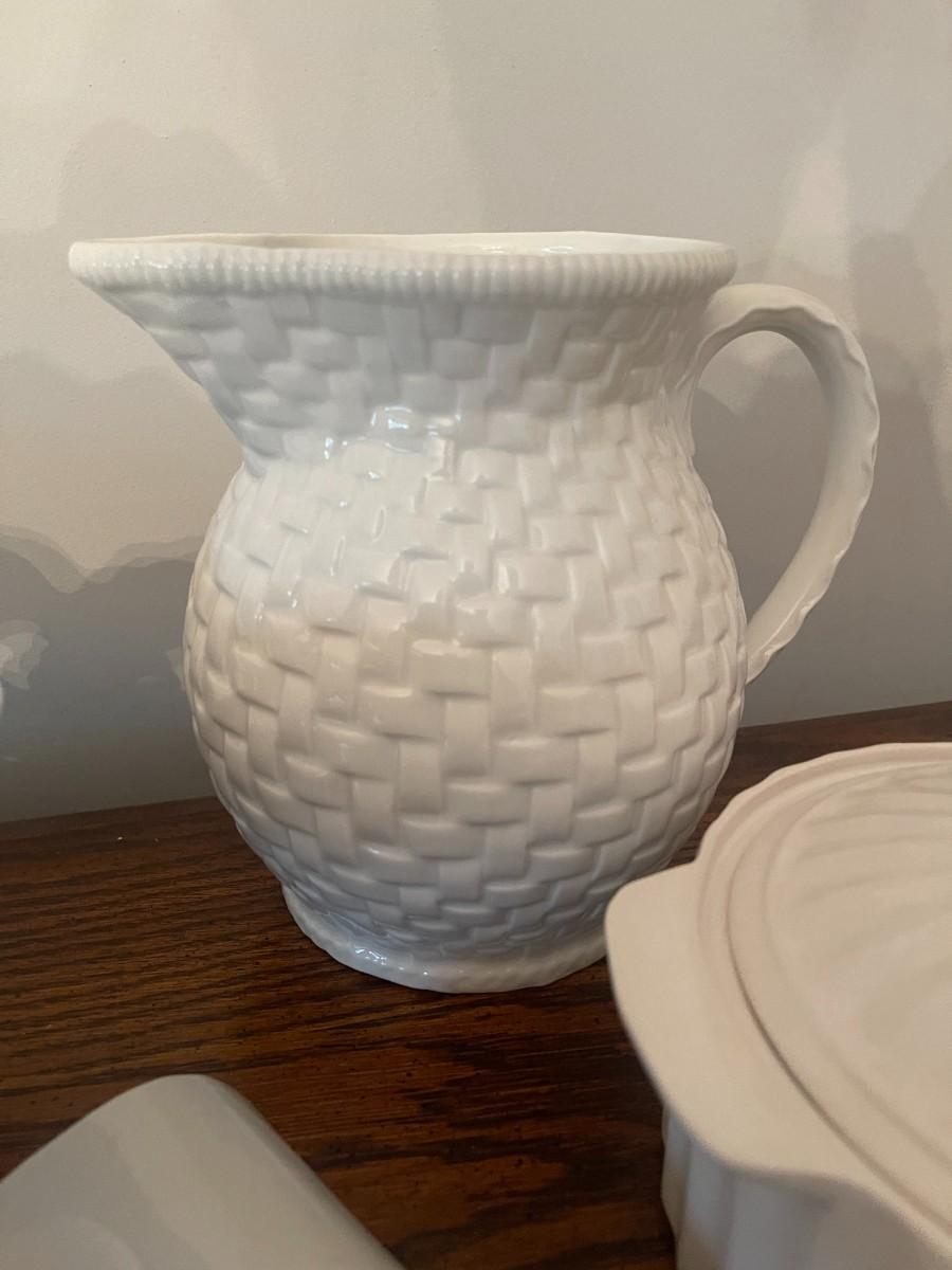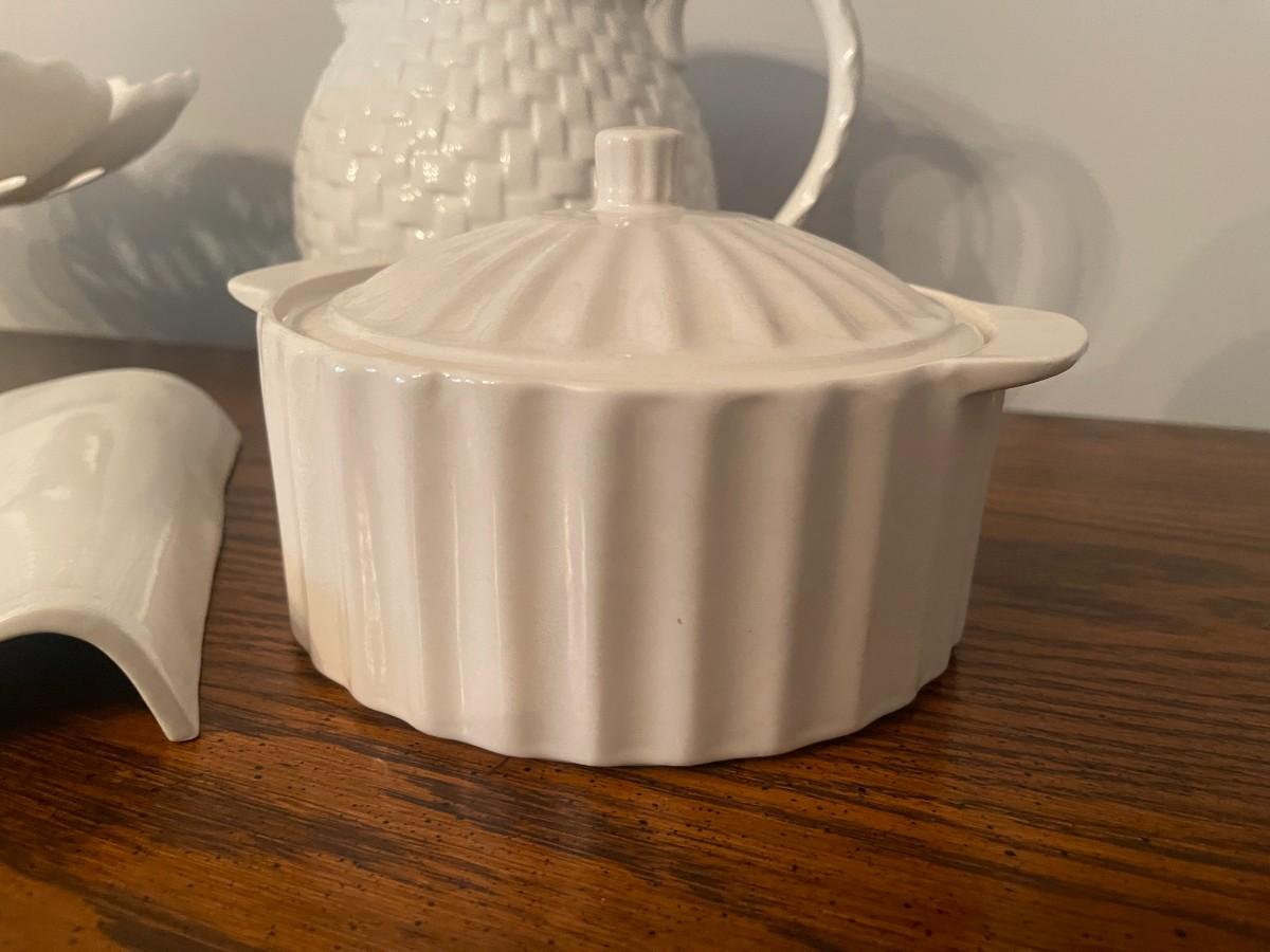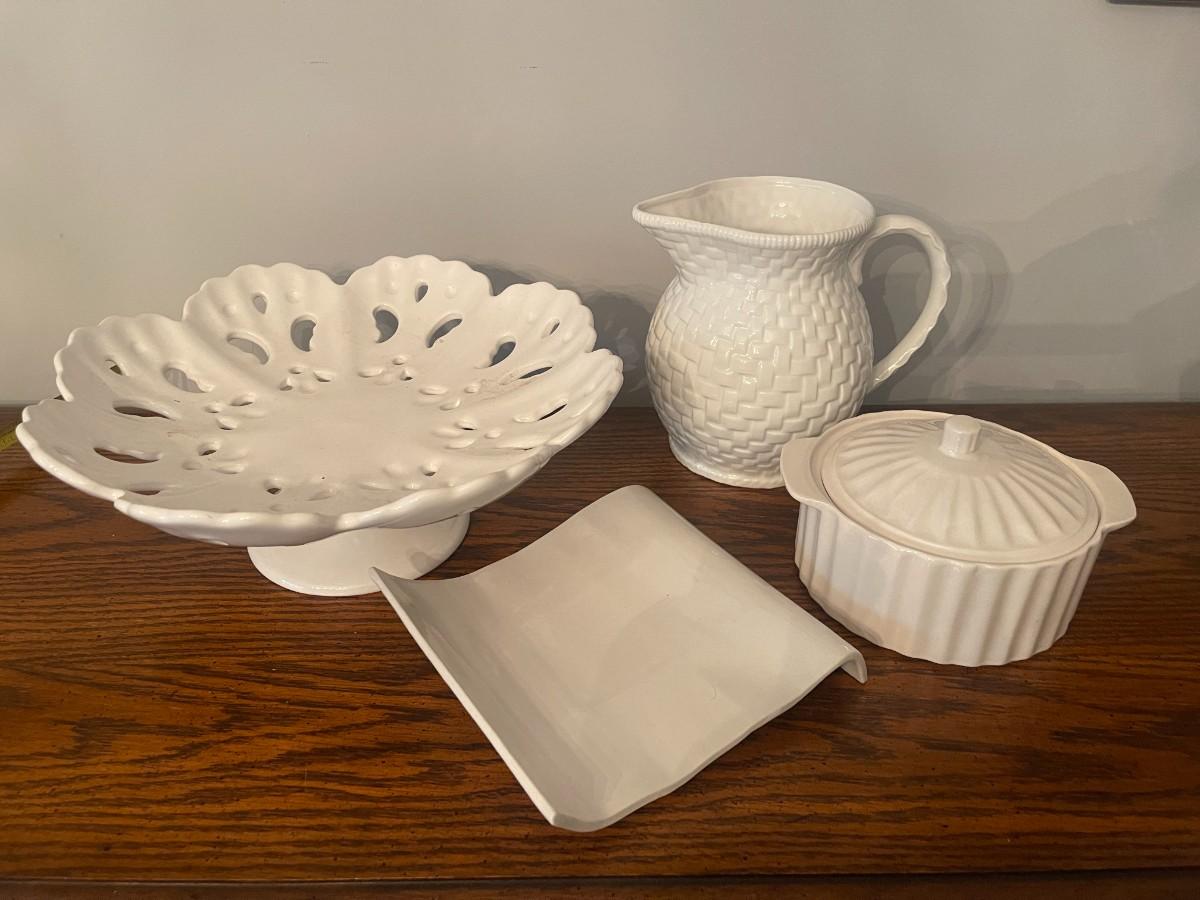 Lot of Assorted White Serving Dishes - Pitcher, Cake Plate, Bowl with Lid & Platter