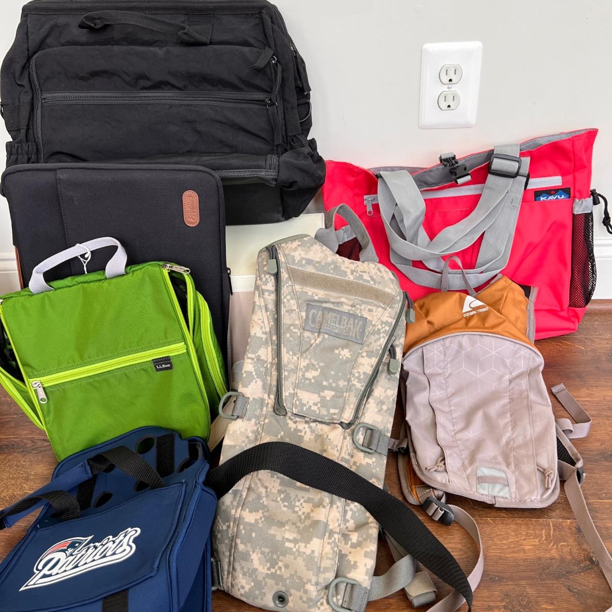Large lot of bags totes laptop cases backpacks including L.L. Bean, Camelback, Ozark Trail, Kavu.