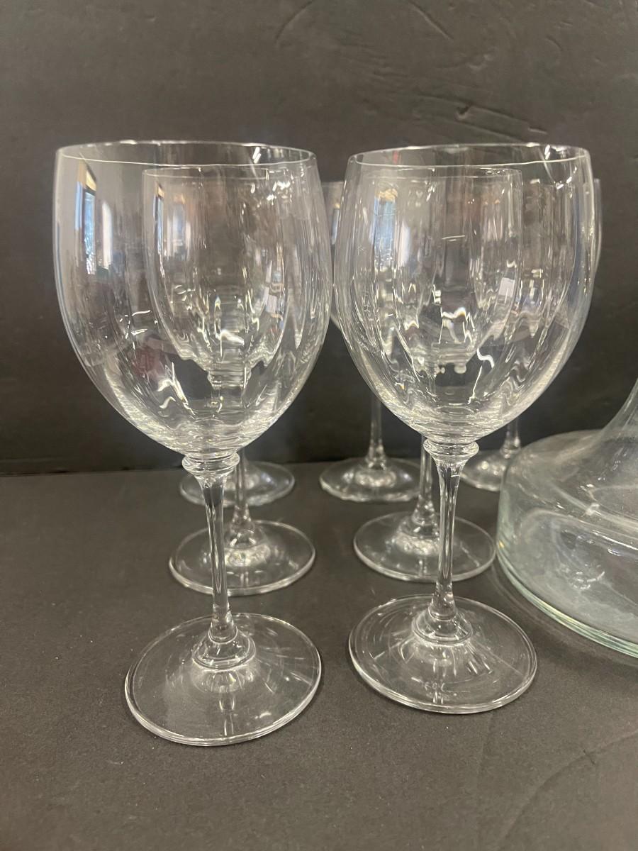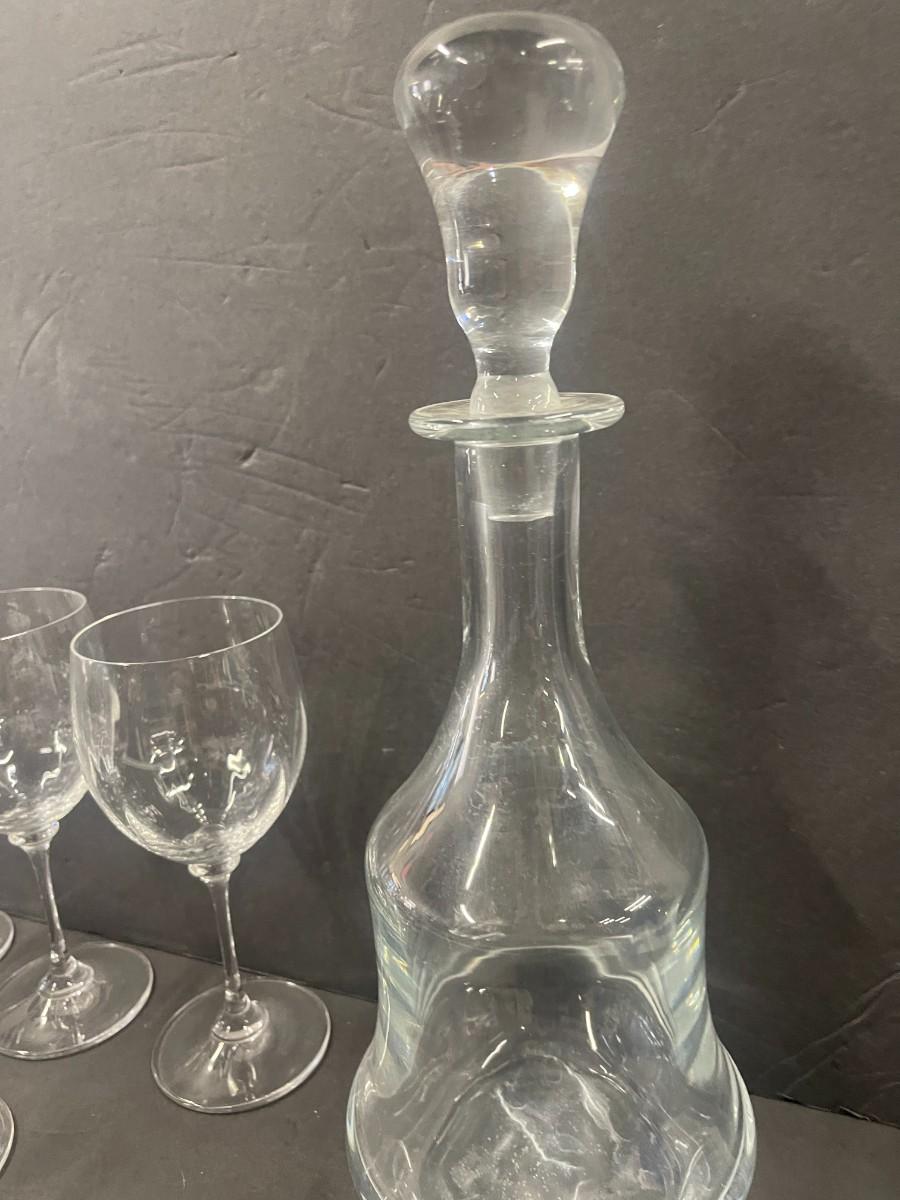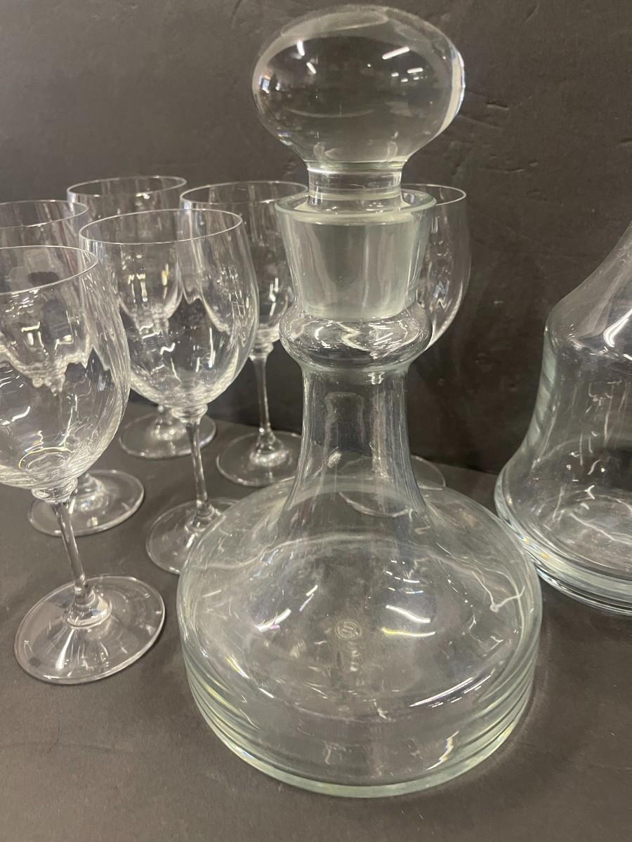 Includes 2 heavy, clear glass decanters (stoppers may not be original to the decanters) and 7 wine glasses in excellent condition.