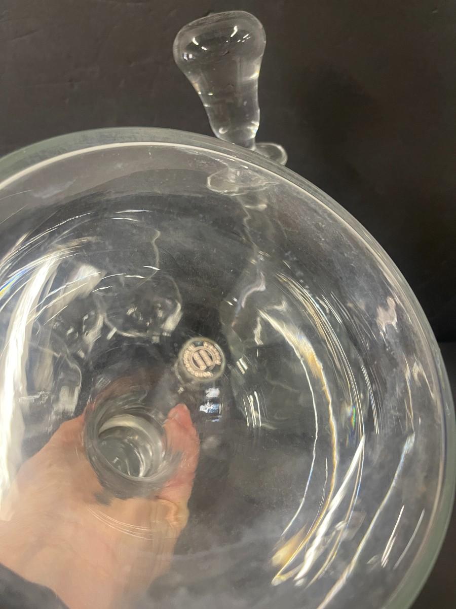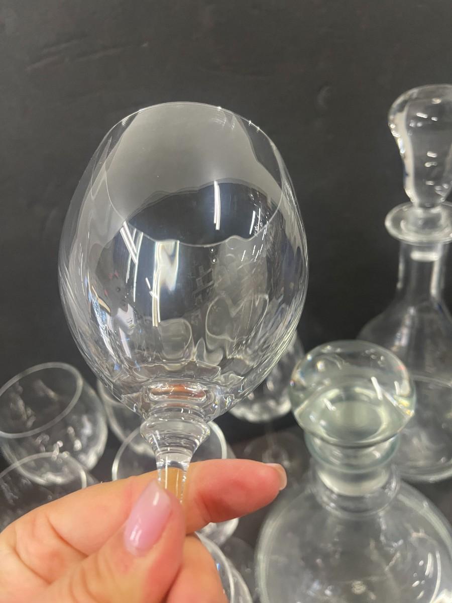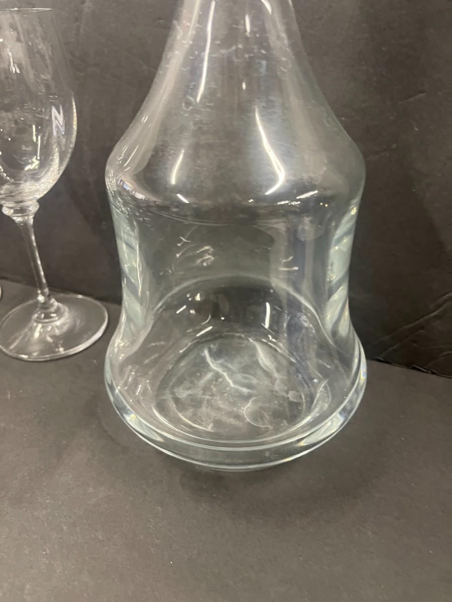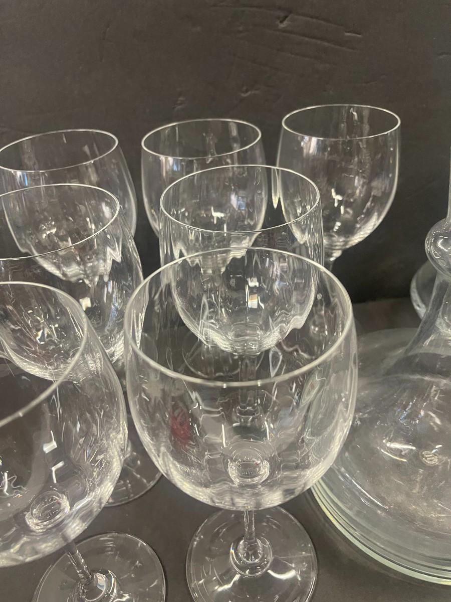 Includes 2 heavy, clear glass decanters (stoppers may not be original to the decanters) and 7 wine glasses in excellent condition.