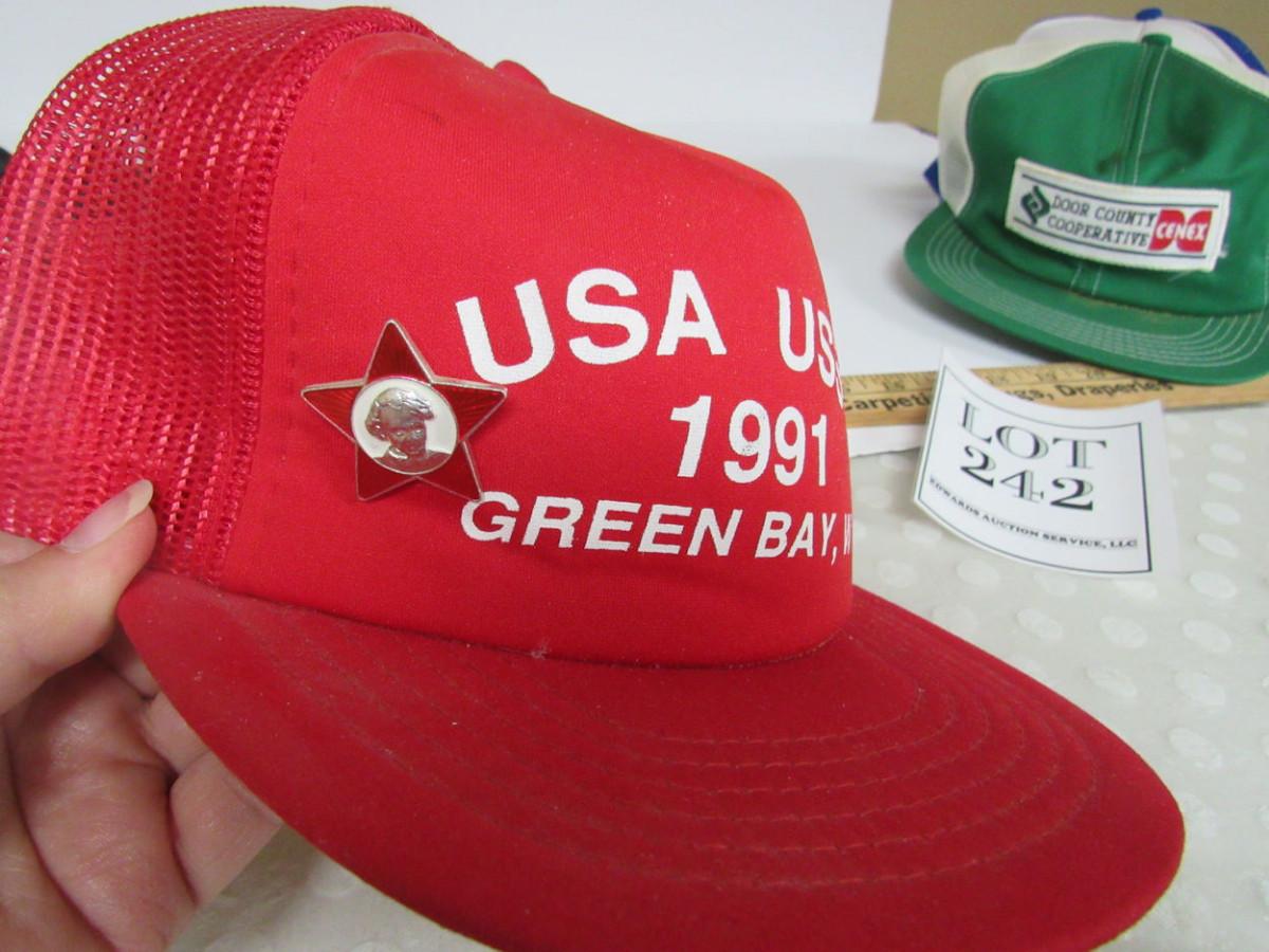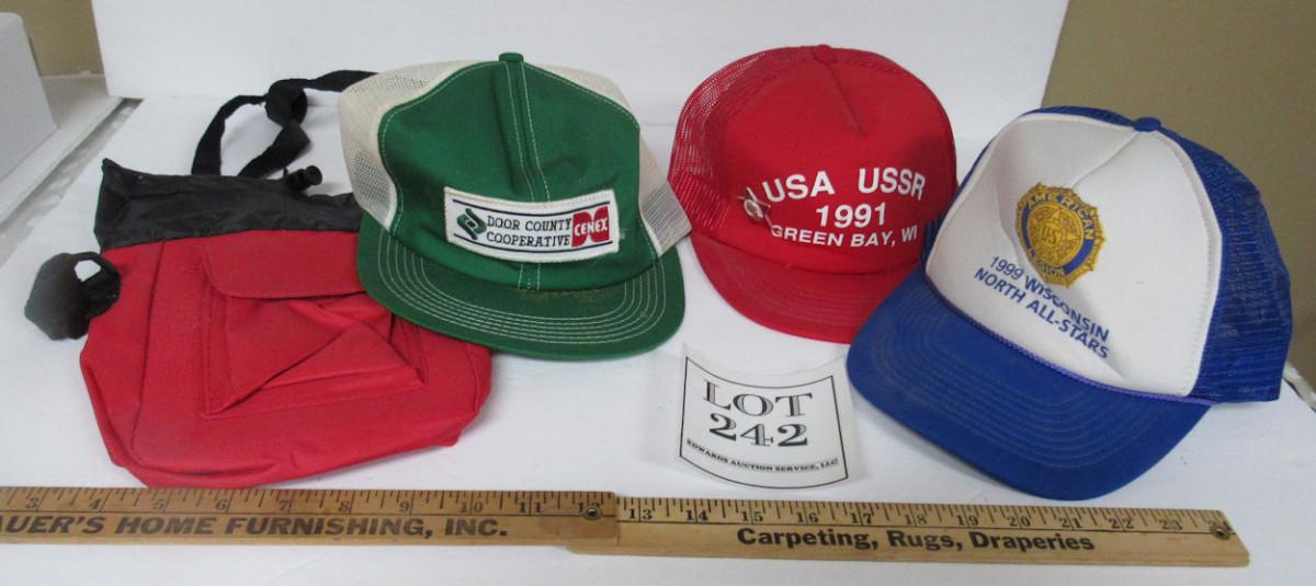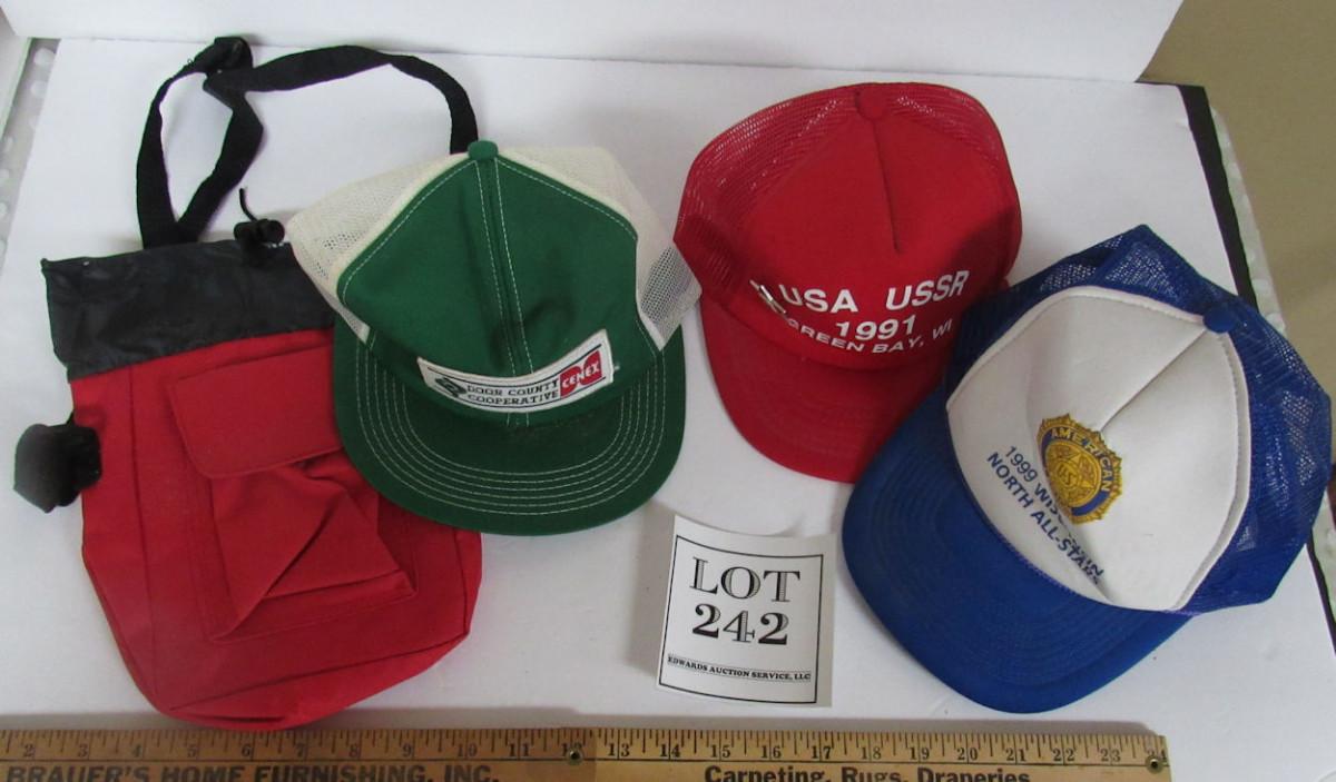 Lot of Baseball Caps, One With Pin, and Red Carrying Bag