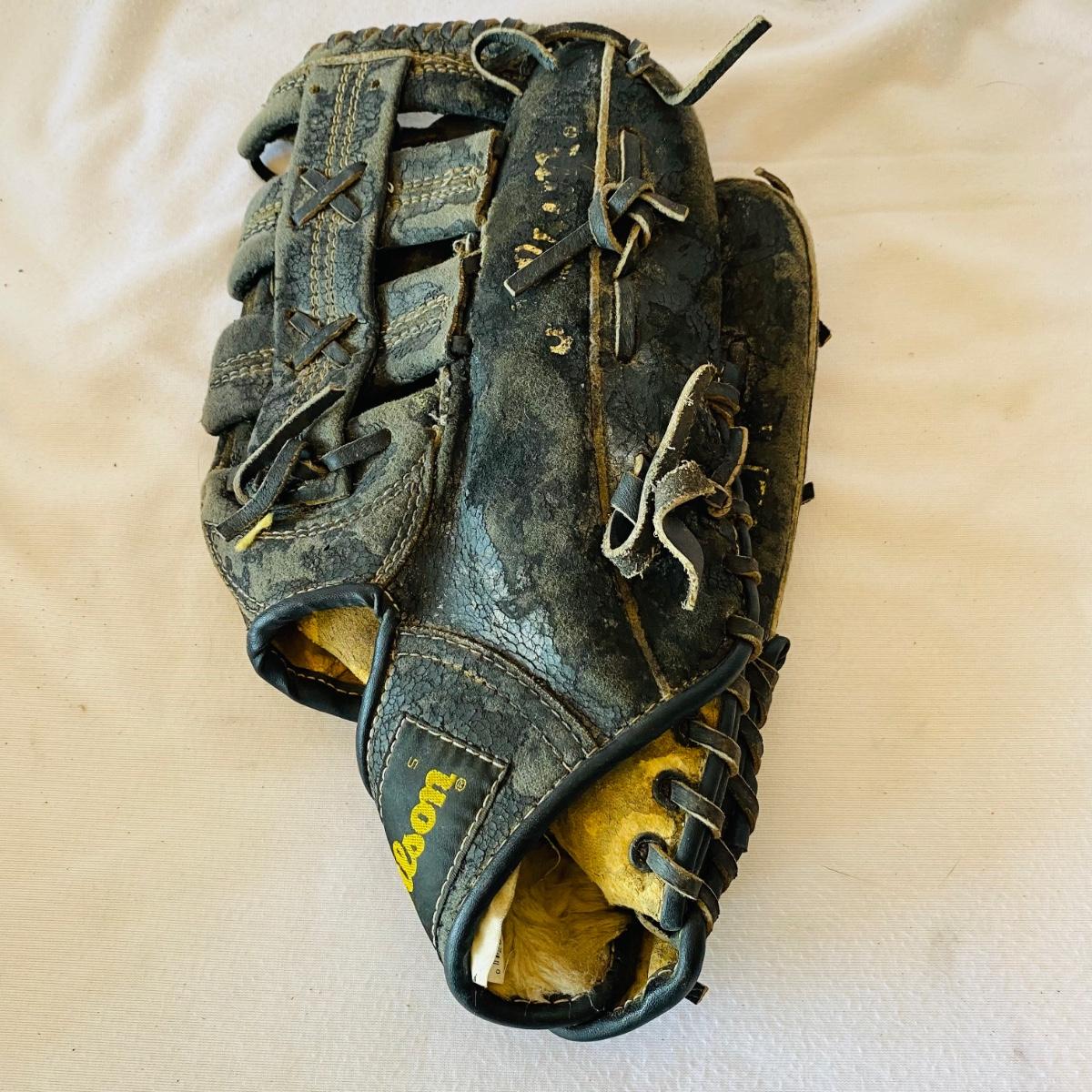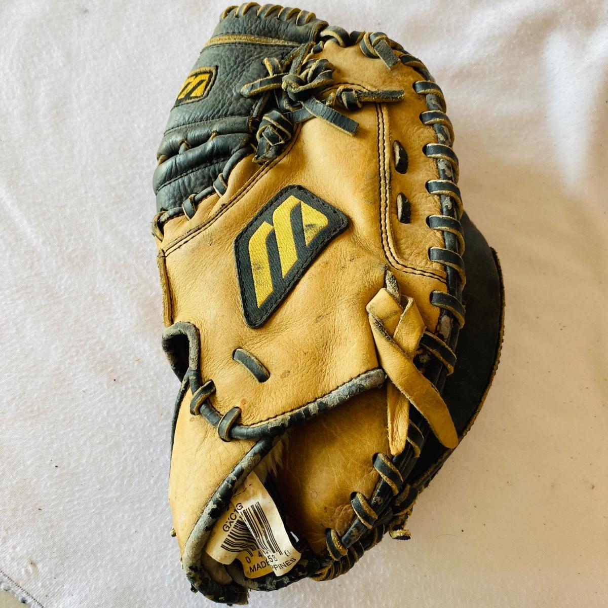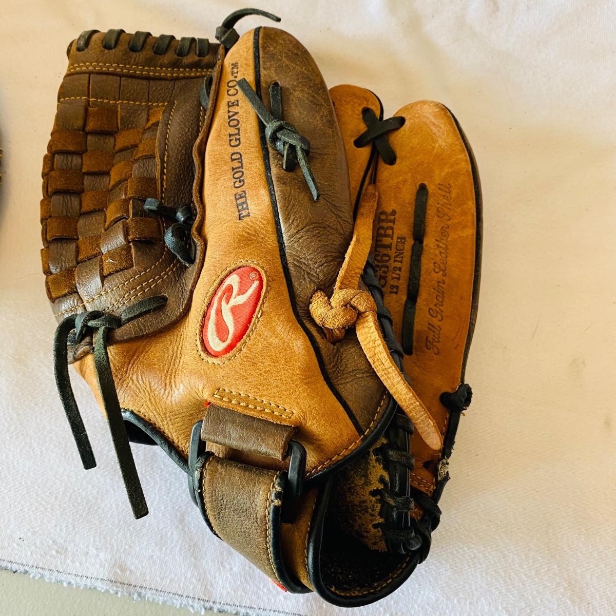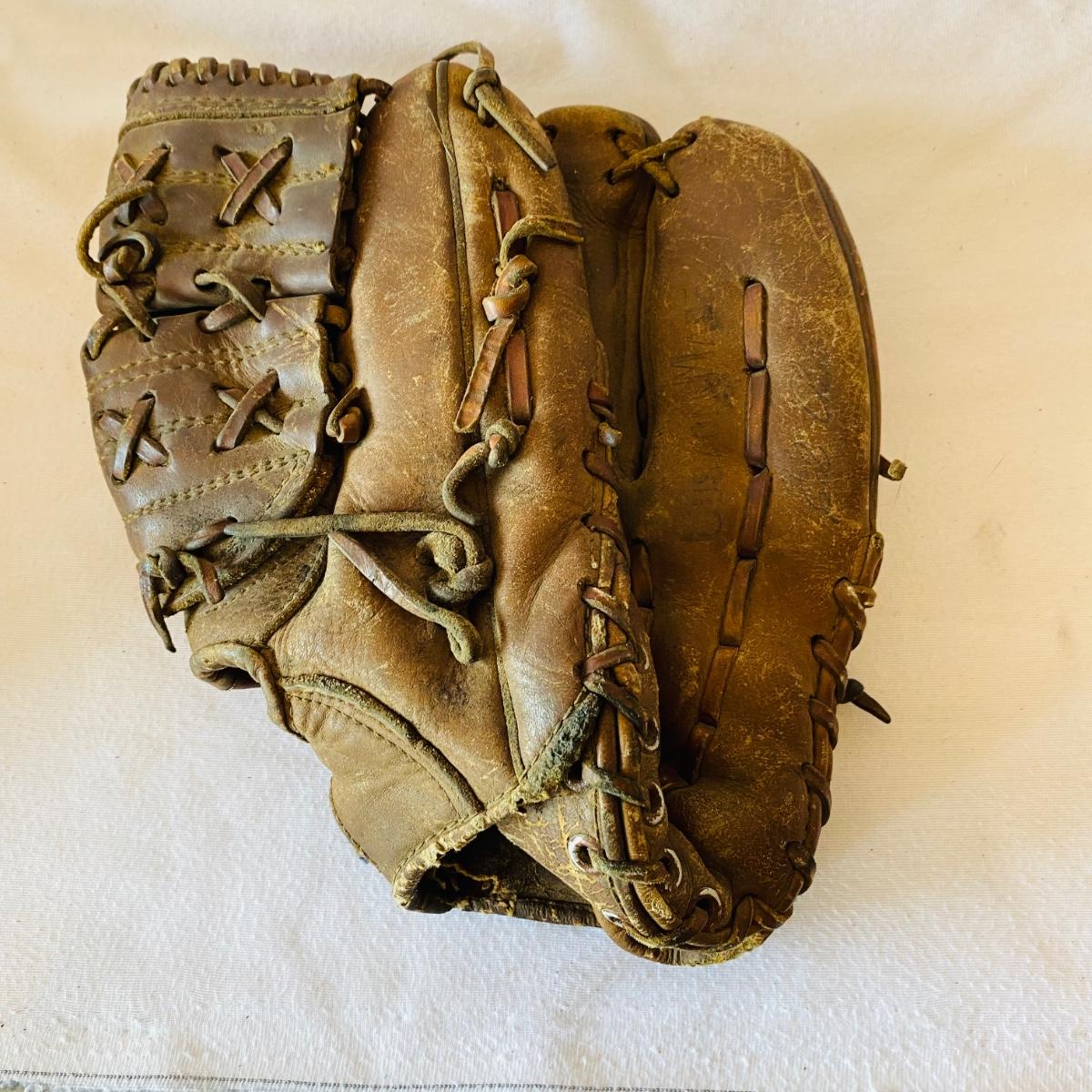 Five worn baseball gloves. Includes Rawlings,, Wilson, Franklin, Mizuno and one unknown. Largest glove is 12.5”.