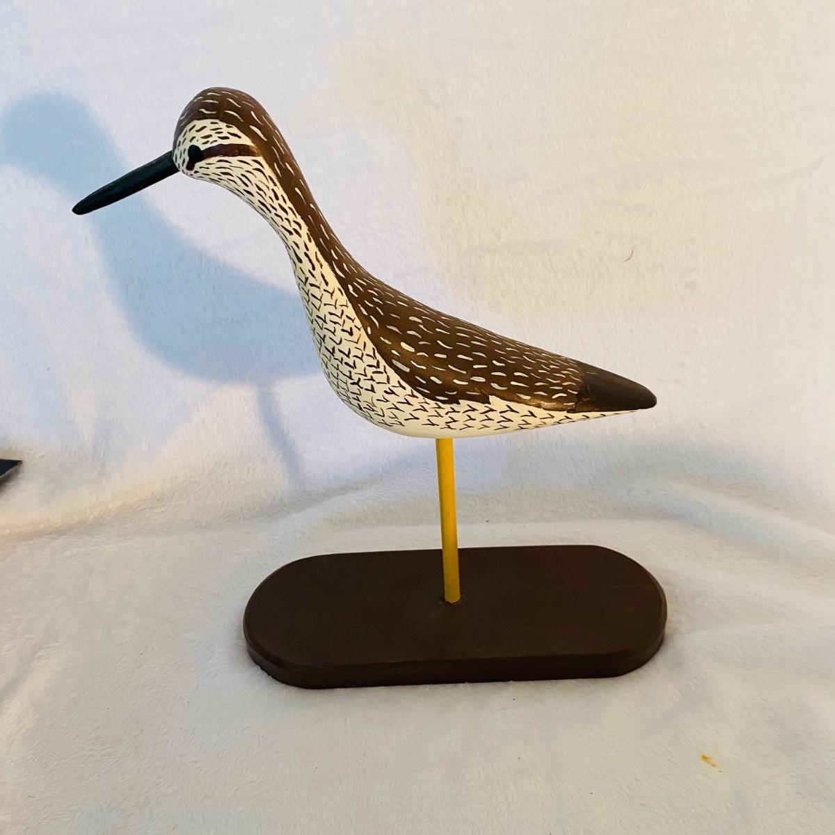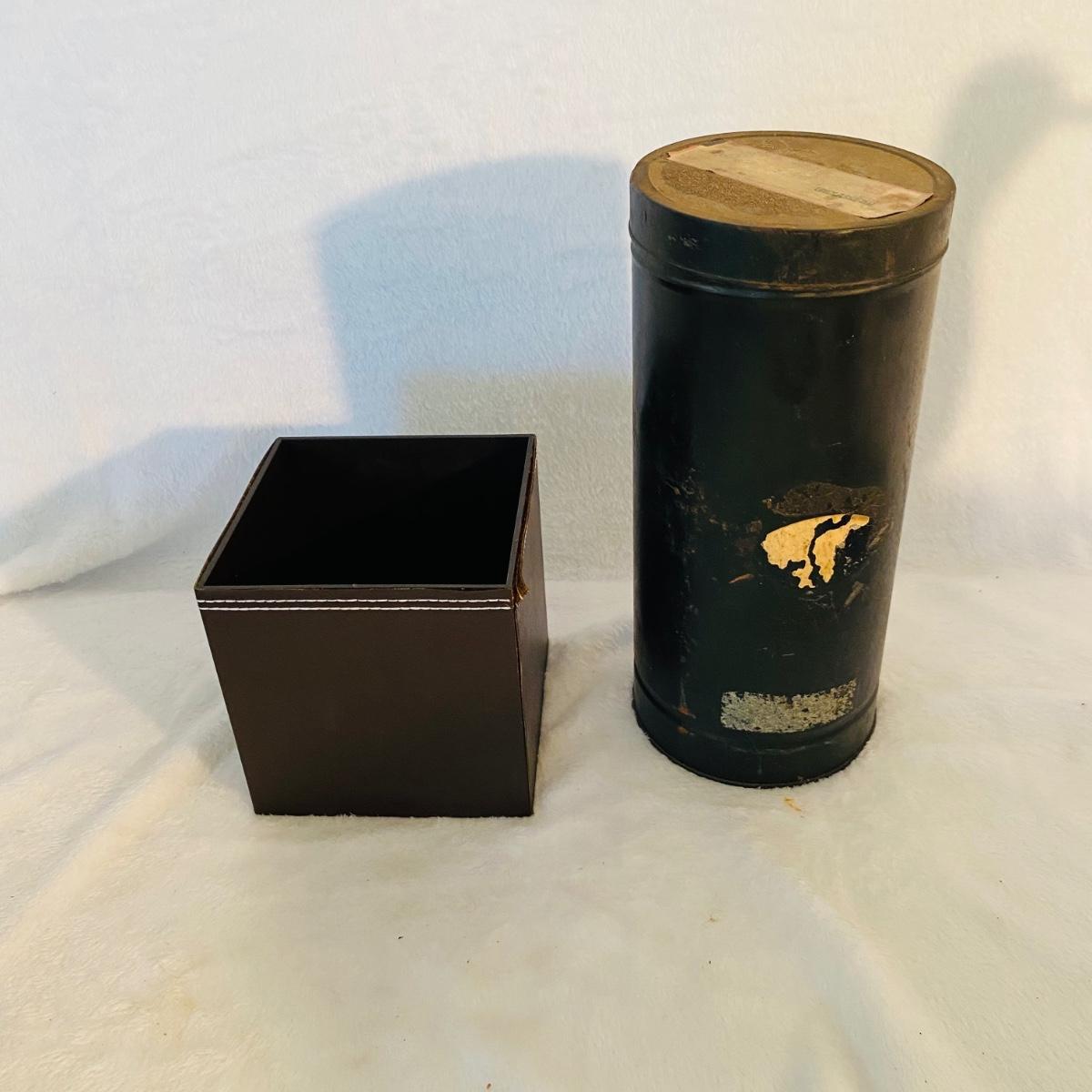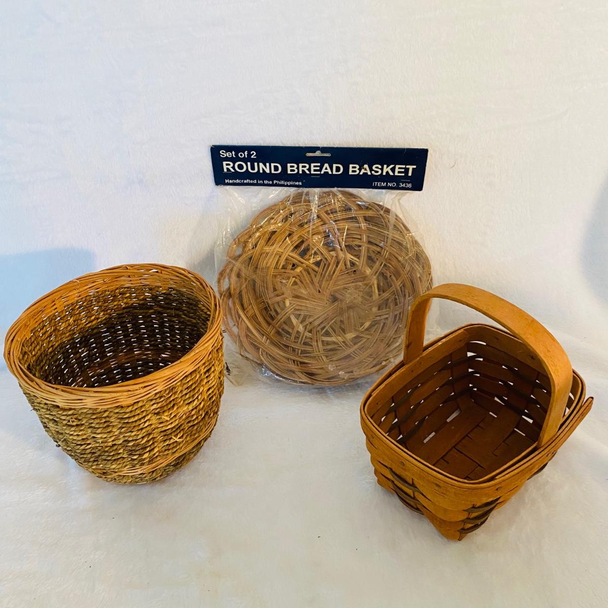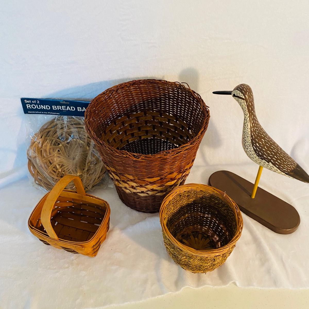 Set of two unopened round bread baskets. Two other small baskets and one waste basket. Waste basket measures 11”H. Black metal container and square plastic box with faux leather cover. Also includes wooden decoy ibis which measures 13”H.