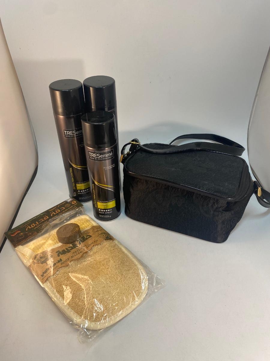 Lot of Beauty Care Toiletry Products New Loofah Sponge, Lancome Travel Makeup Bag, & Tresemme Hair Spray