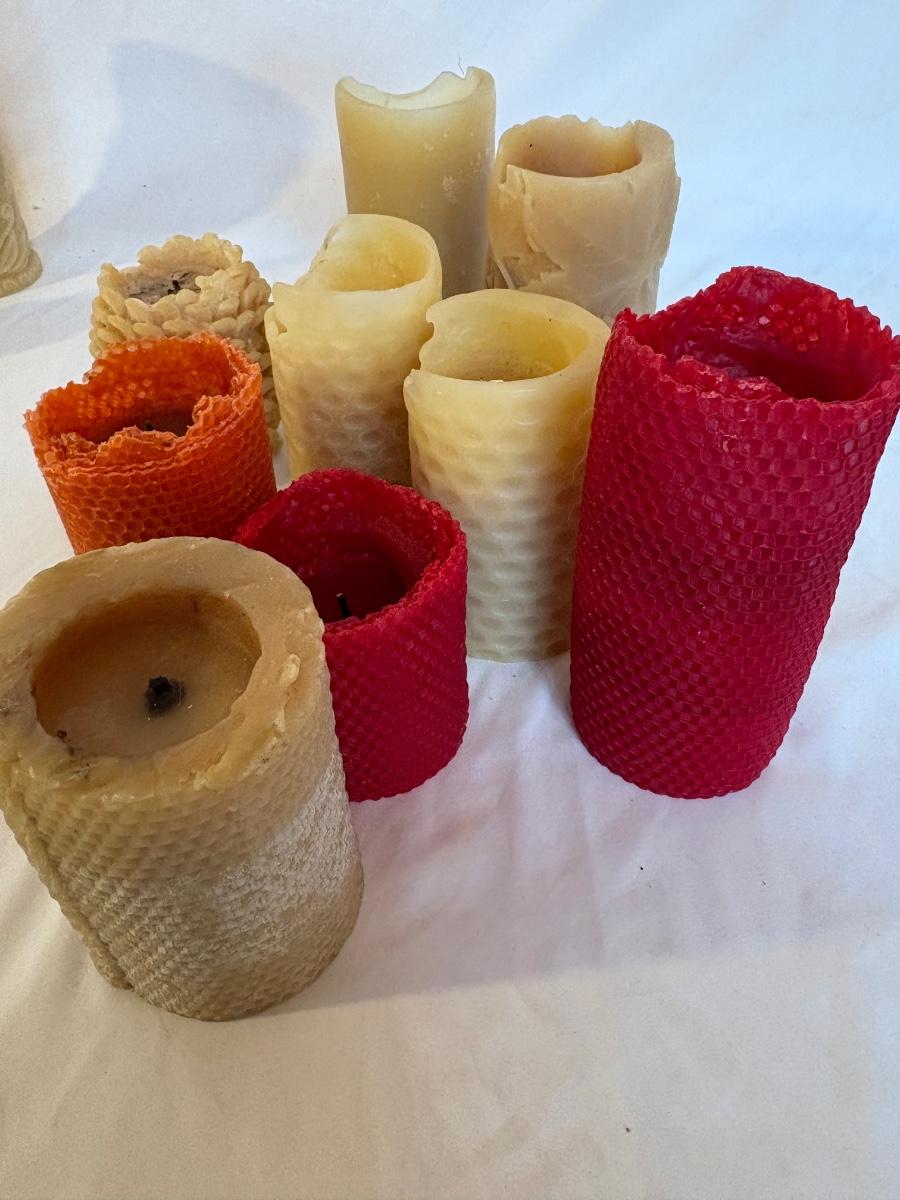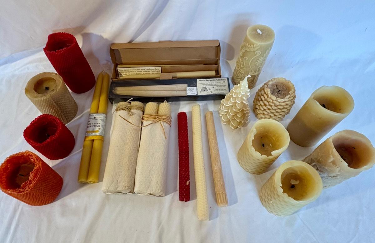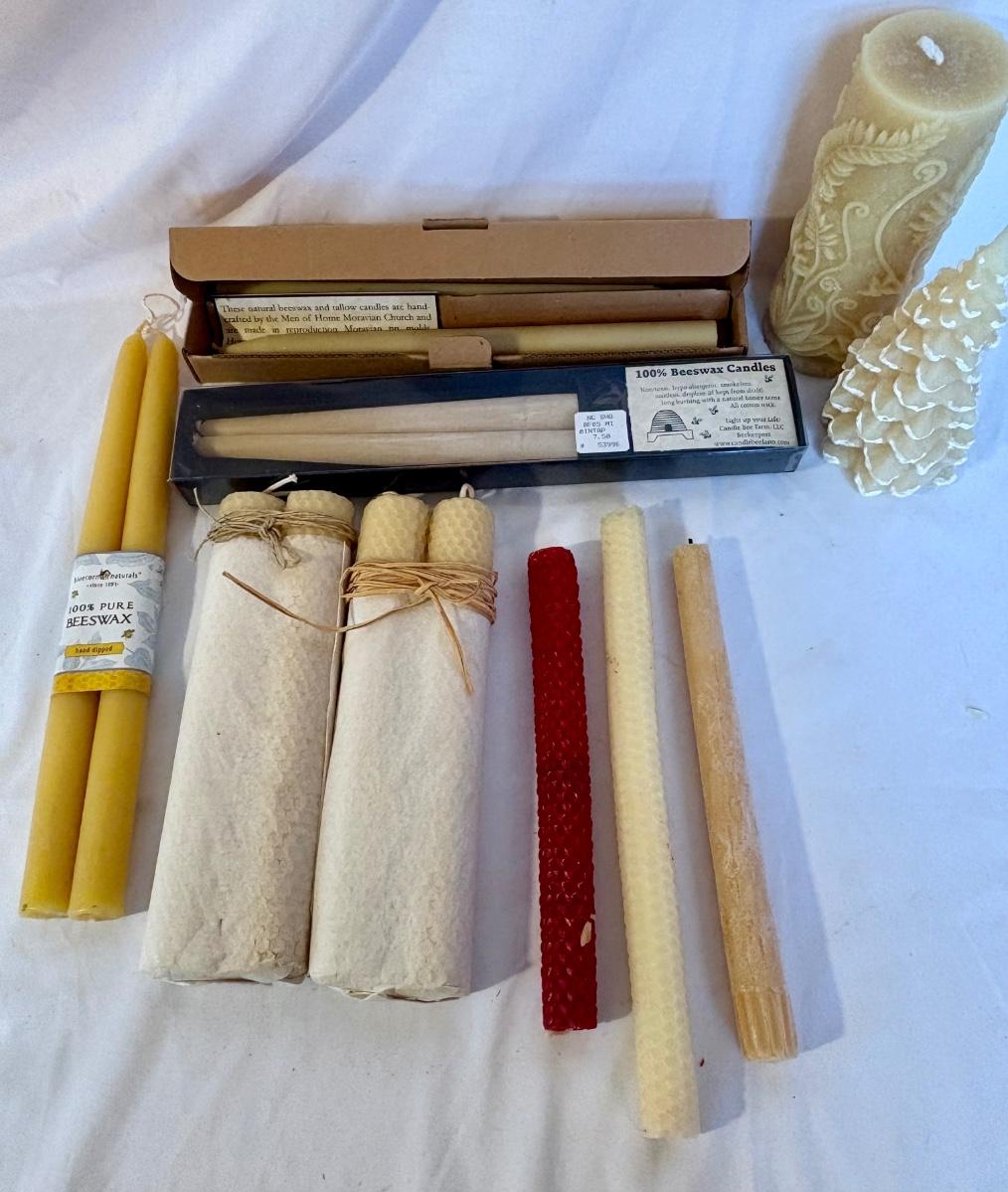 Mix of brand new and partially burned beeswax candles. Largest unburned pillar is 6.5”H and longest tapers are 12”H.