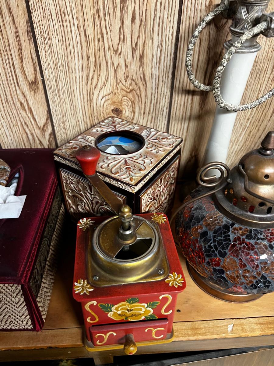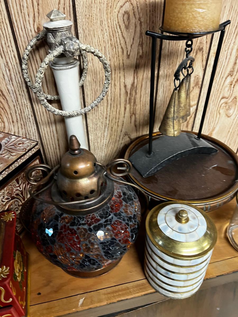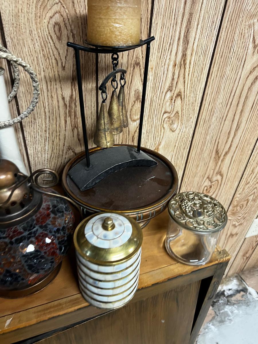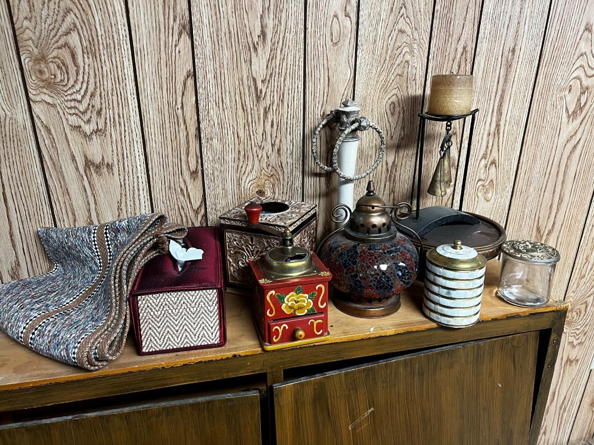 Lot of Bells, Grinder, Candle Holder and Brown Rug.