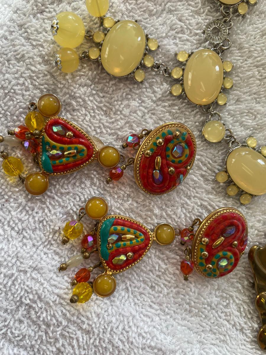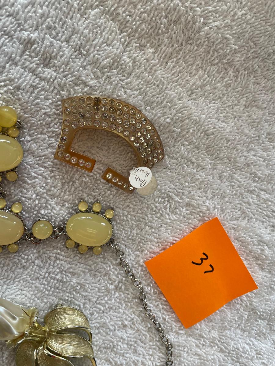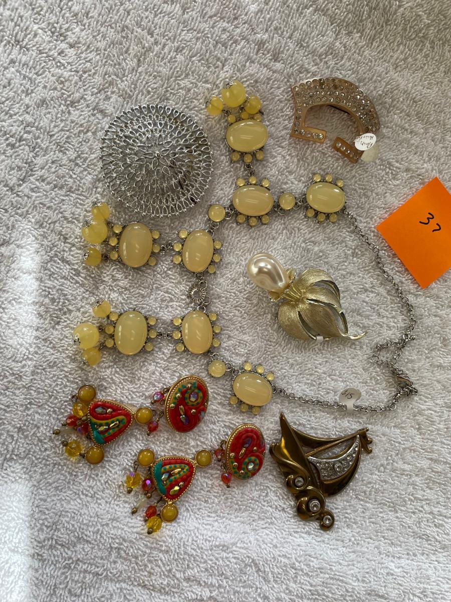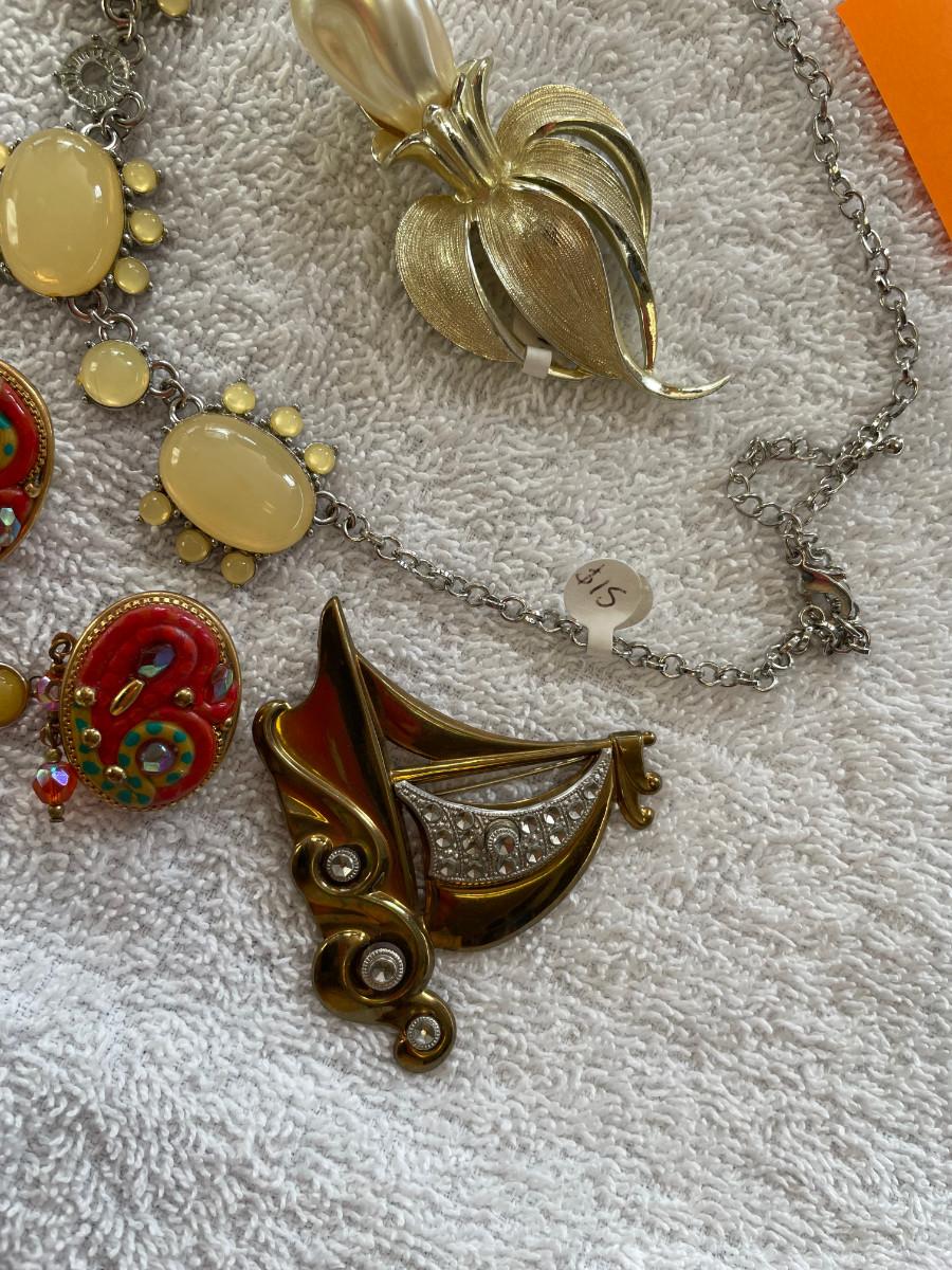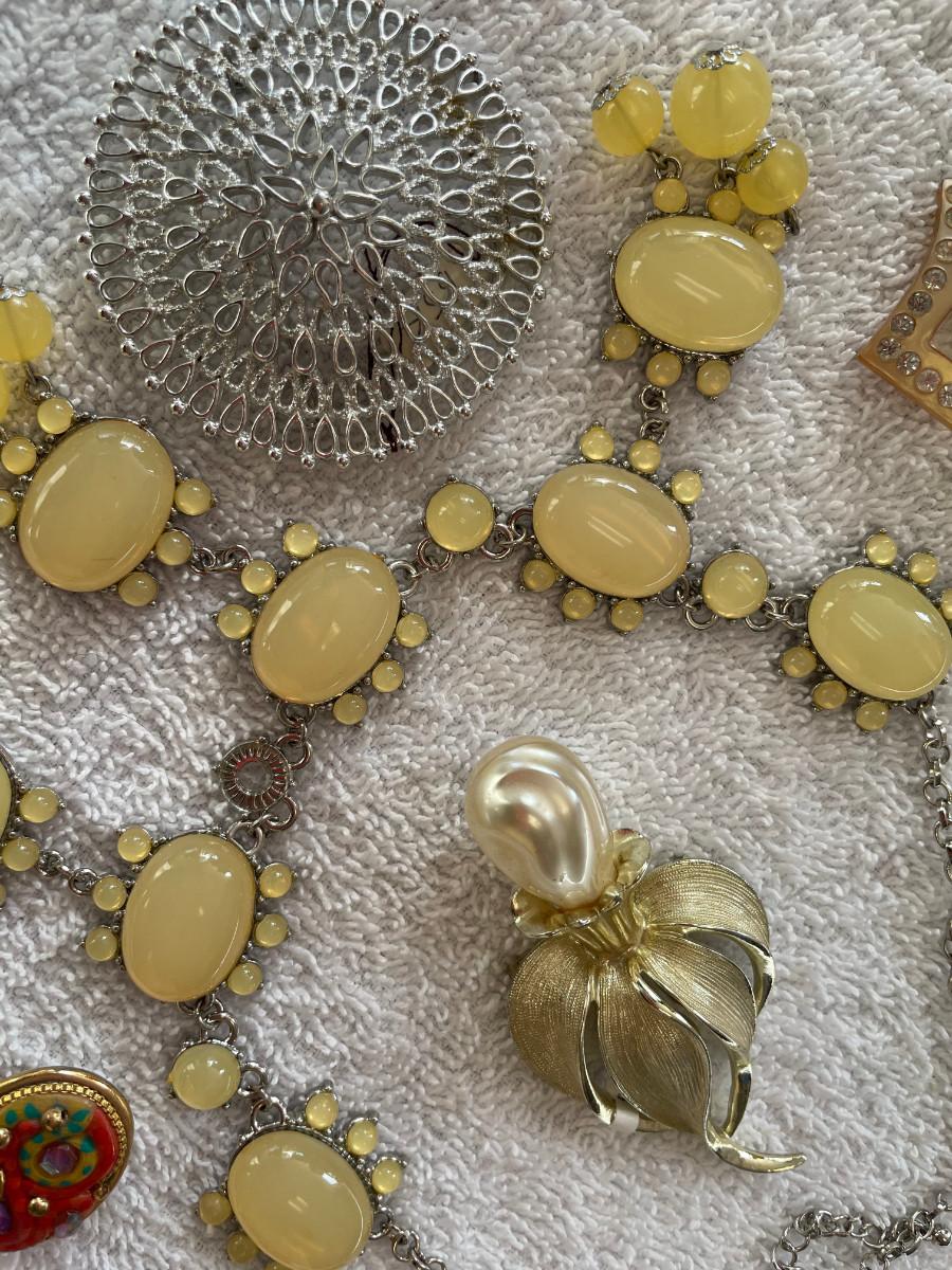 Ship pin is 1940s. Yellow necklace is missing one stone.