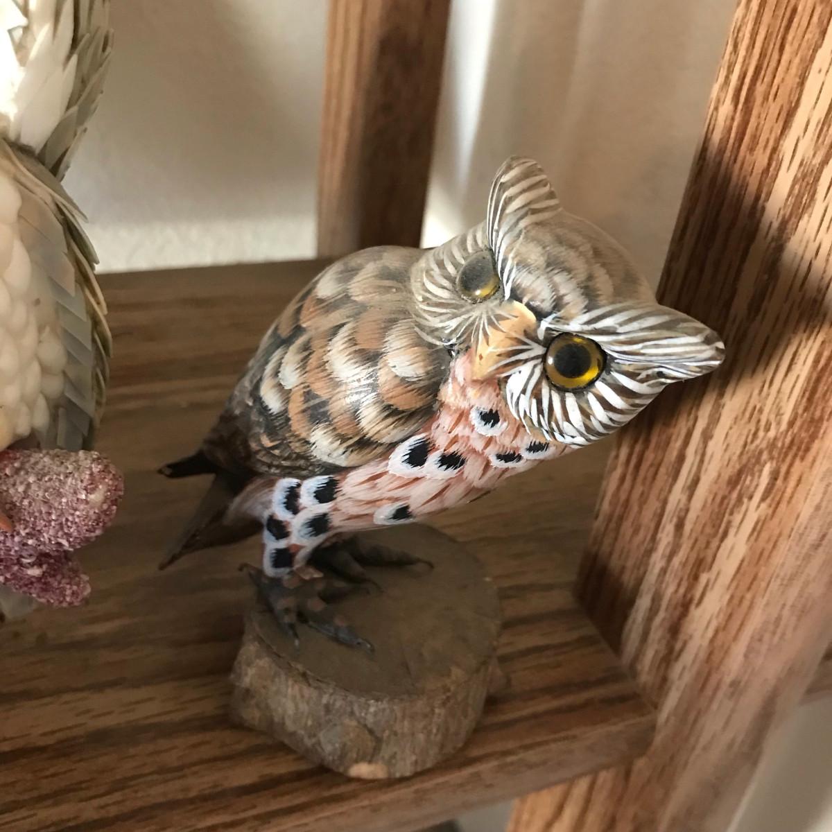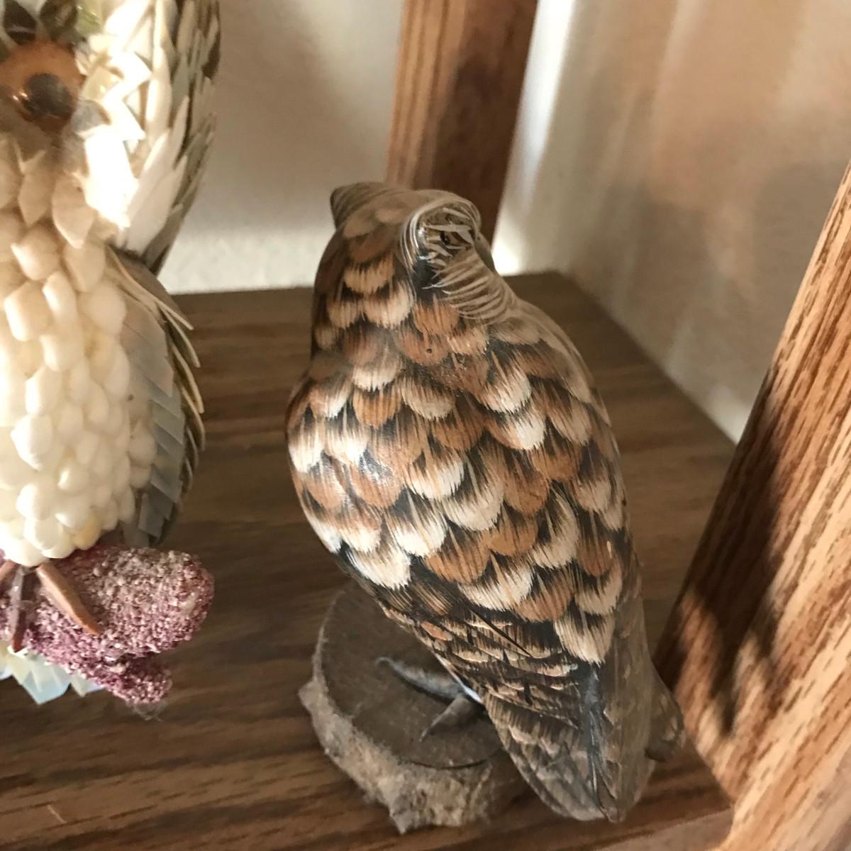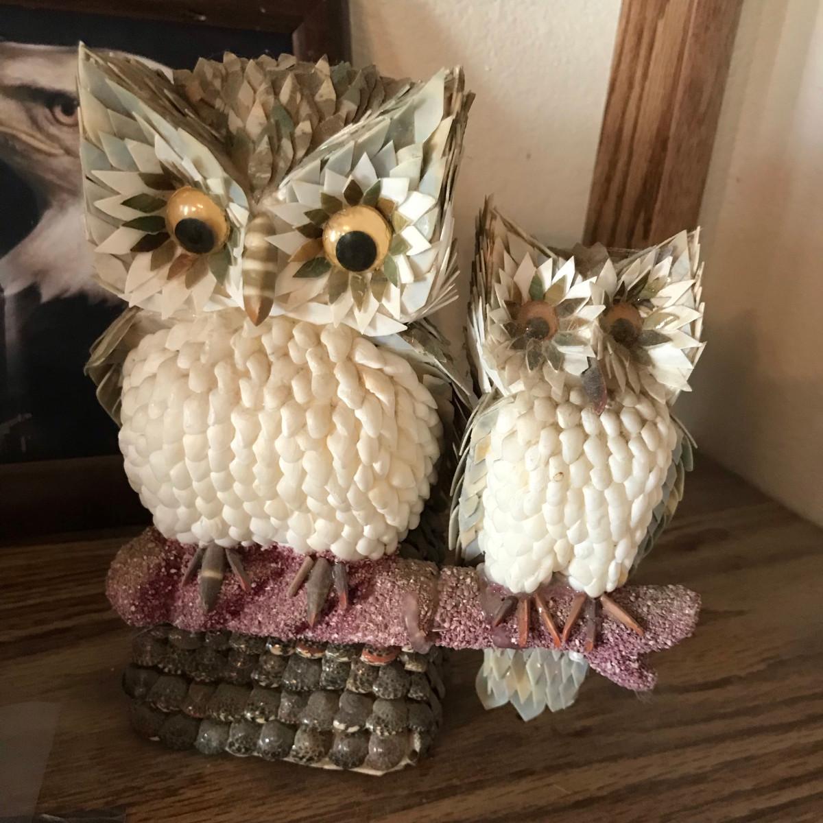 The owl pair is made of sea shells.