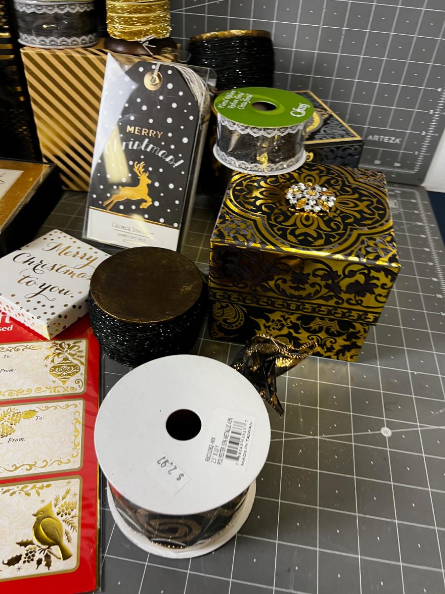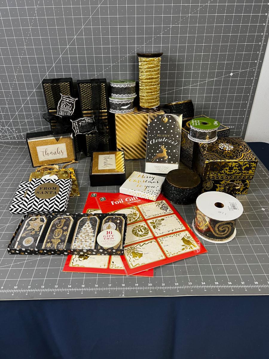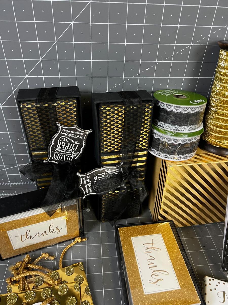 Lot of Black Gold and Silver Boxes, Tags and Ribbons