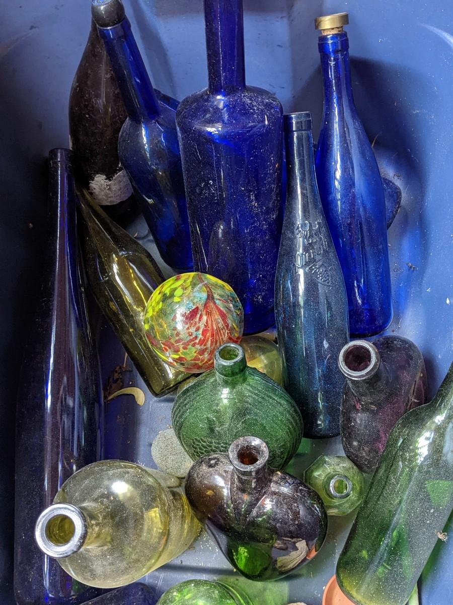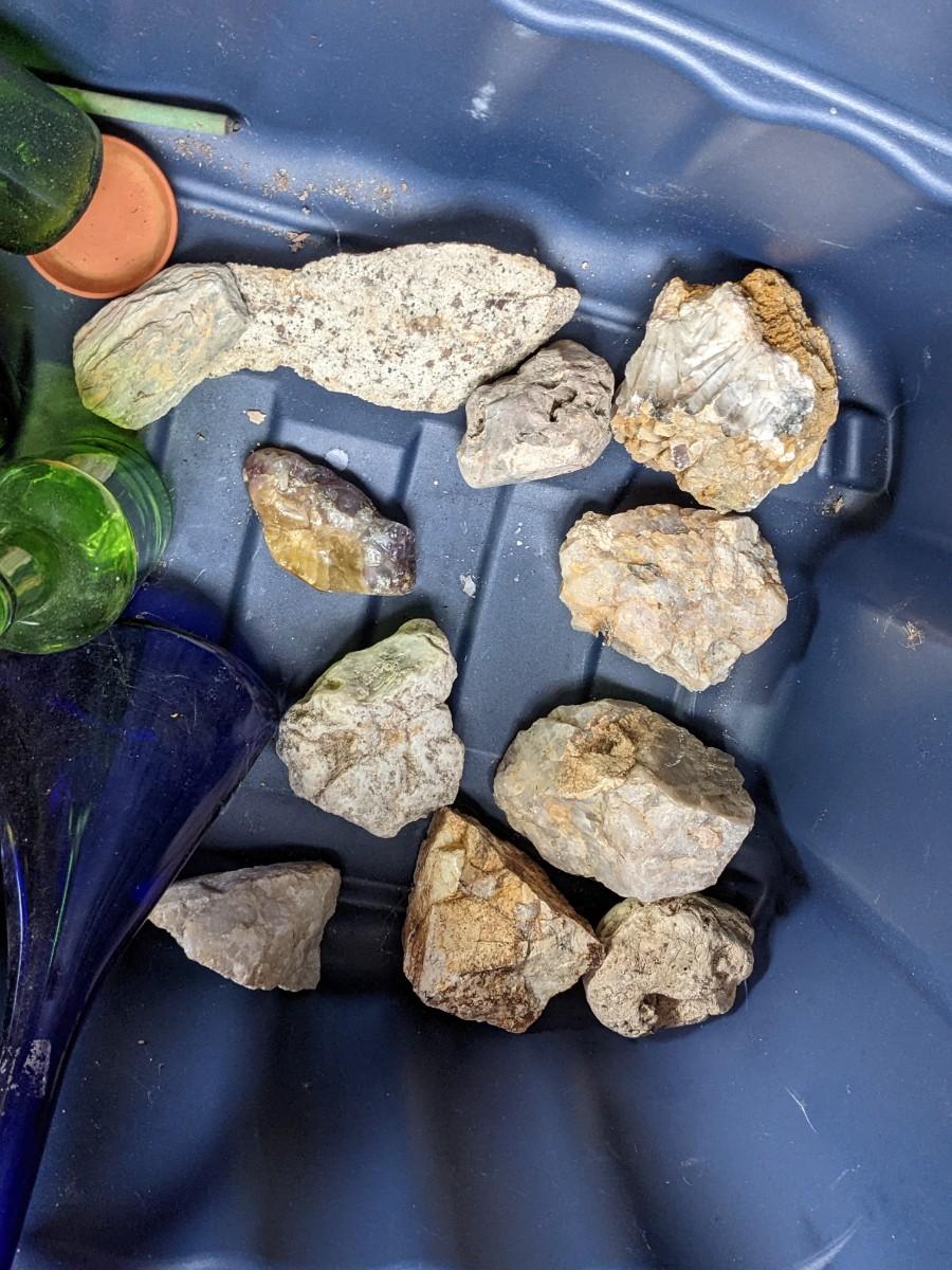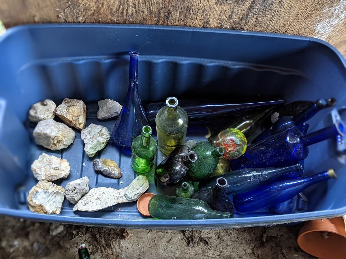 Lot of Blue, Green Glass Bottles and Precious Rocks