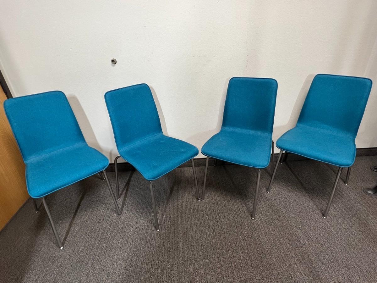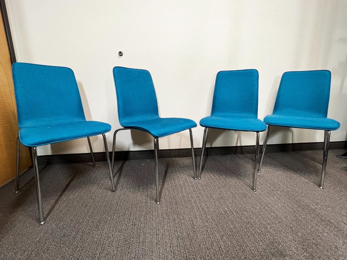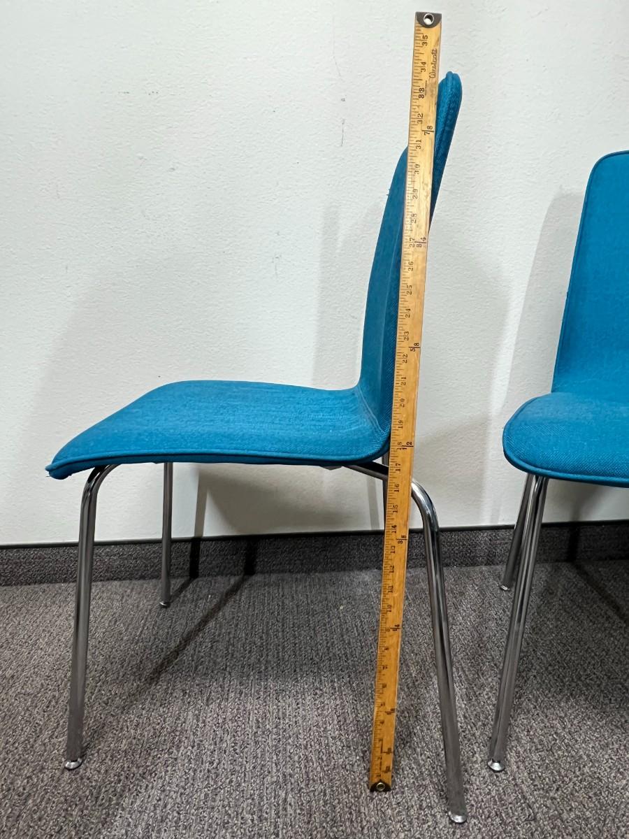 Lot of Blue Upholstered Dining Room Stacking Chairs, one of the legs is missing the tip on one of the chairs, there is no signifncant damage or rips to any of the chairs and is in good useable condition. Check pictures for more details and for sizing.