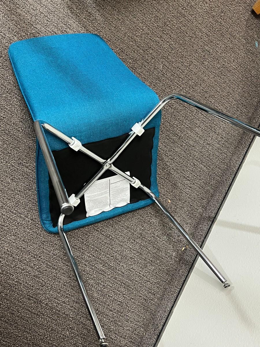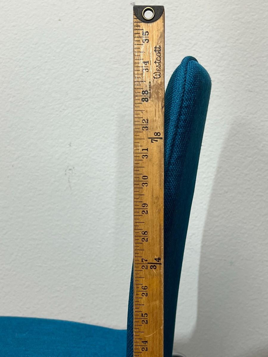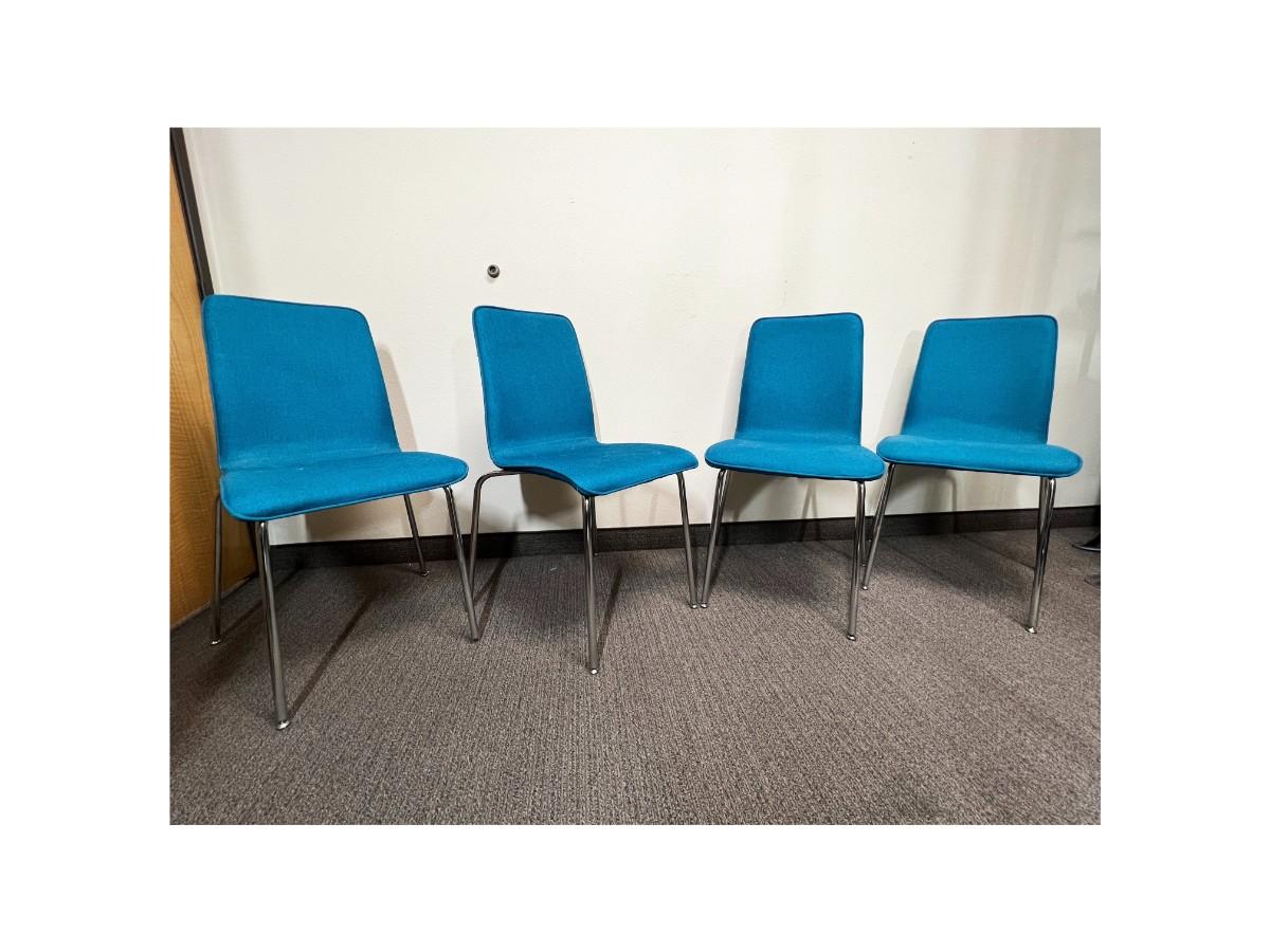 Lot of Blue Upholstered Dining Room Stacking Chairs, one of the legs is missing the tip on one of the chairs, there is no signifncant damage or rips to any of the chairs and is in good useable condition. Check pictures for more details and for sizing.