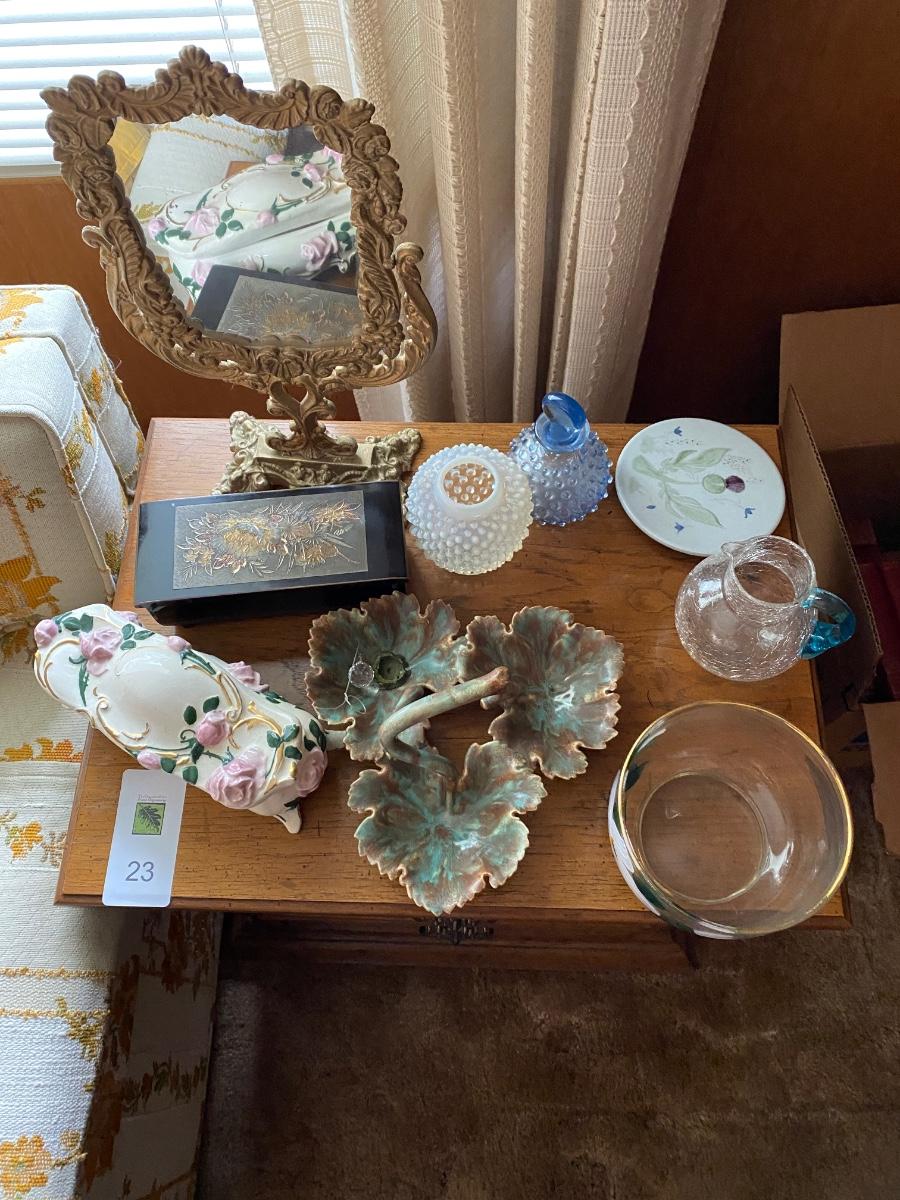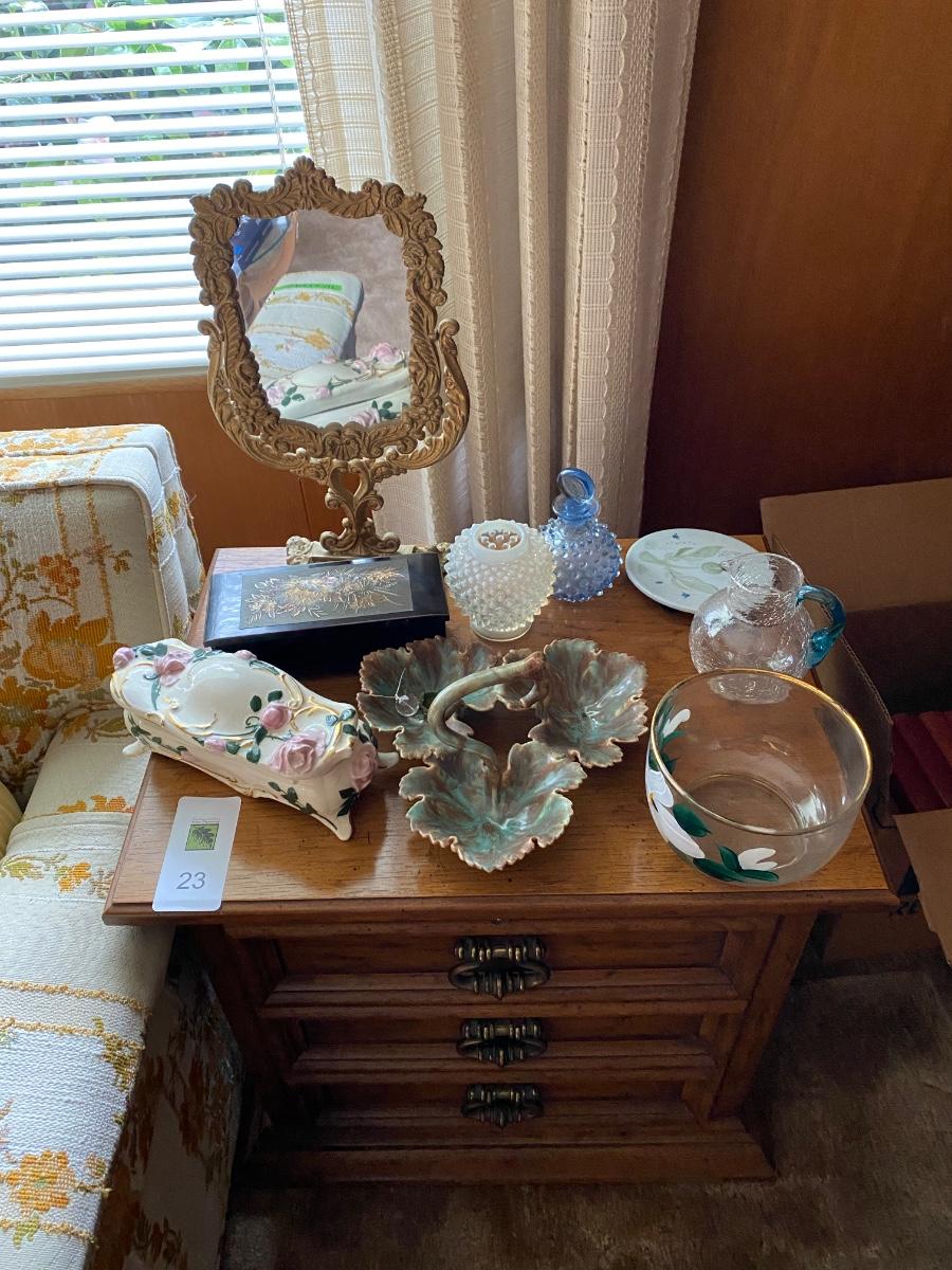 Lot includes hobnail glass, a stand mirror, and several other smalls