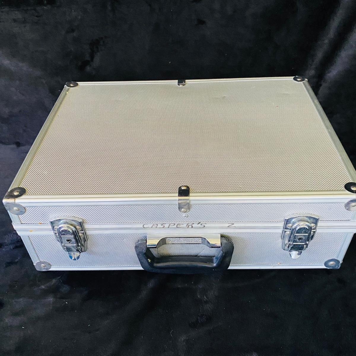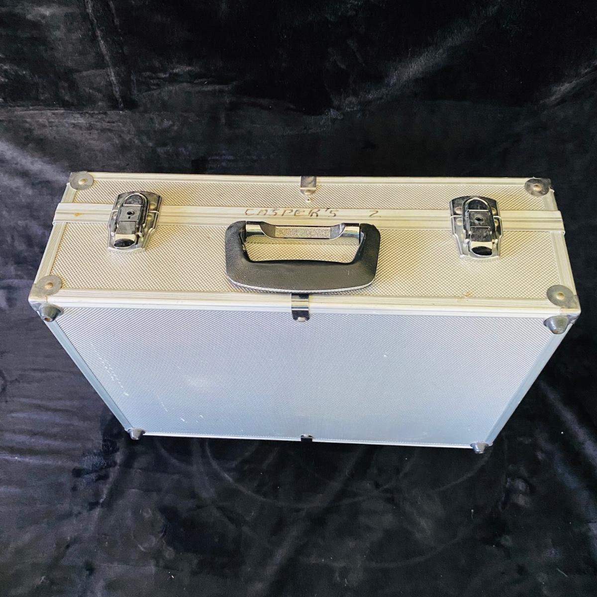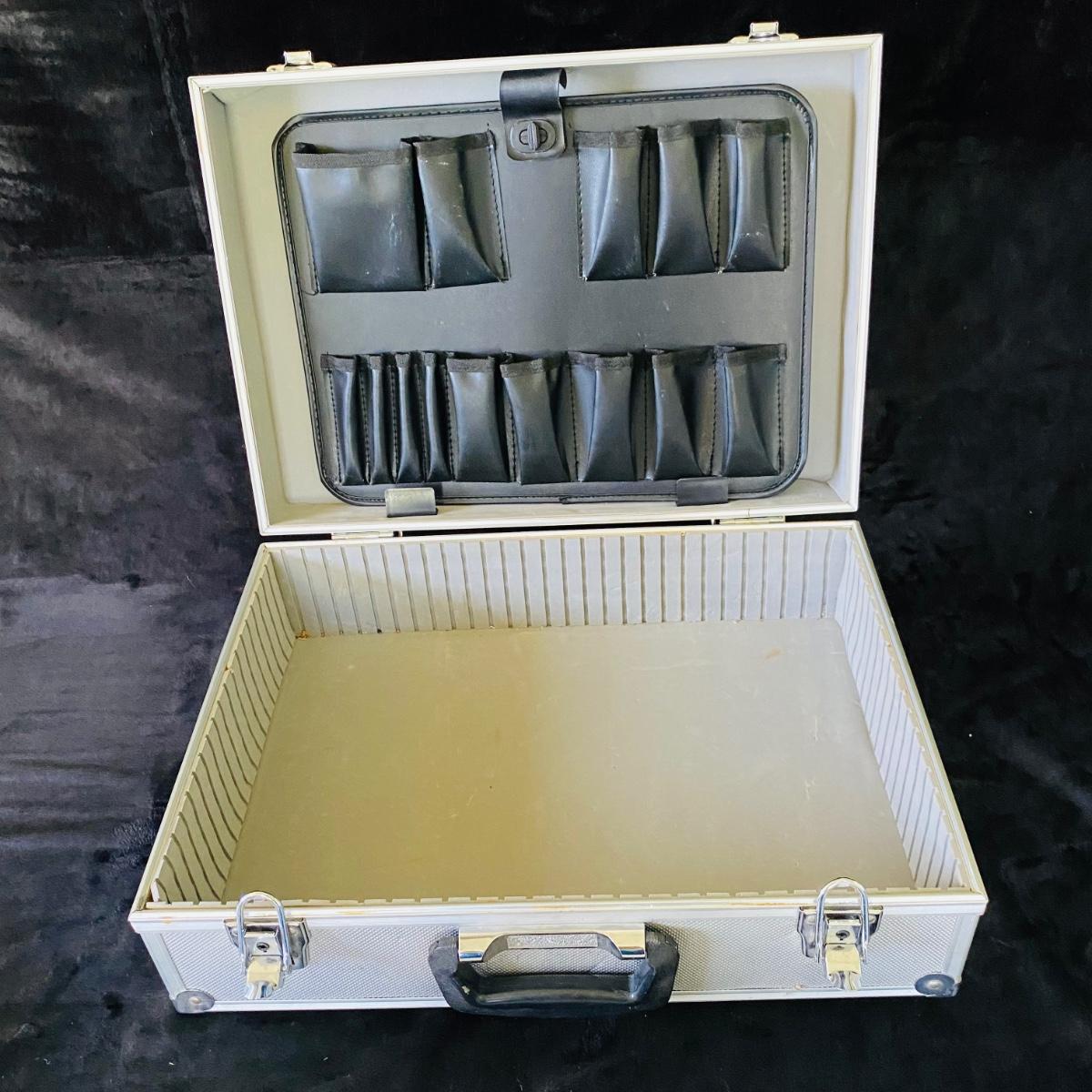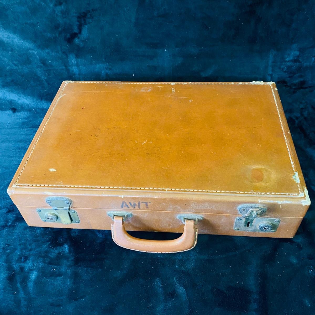 Two metal cases. Each measures 18”L x 13”W x 6”H. Keys included with one. Two brown briefcases. The hardcover one does not open.