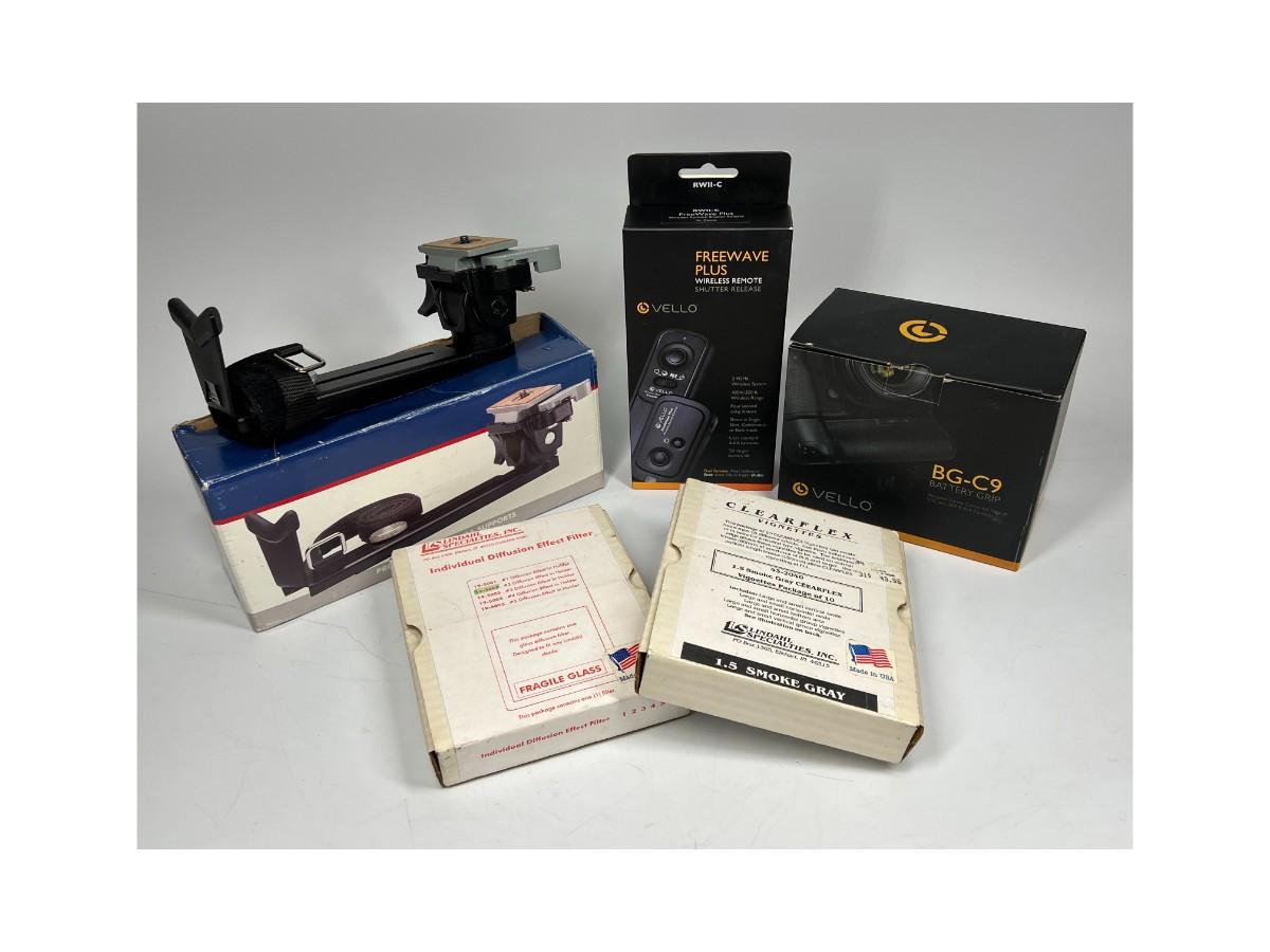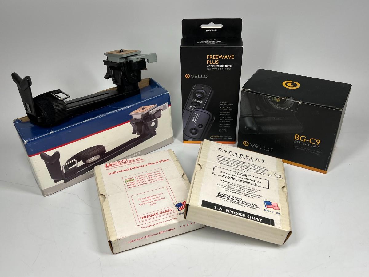 Lot of Camera Accessories Vello BG-C9 Battery Grip, Wireless Remote Shutter, Camera Arm Support & More