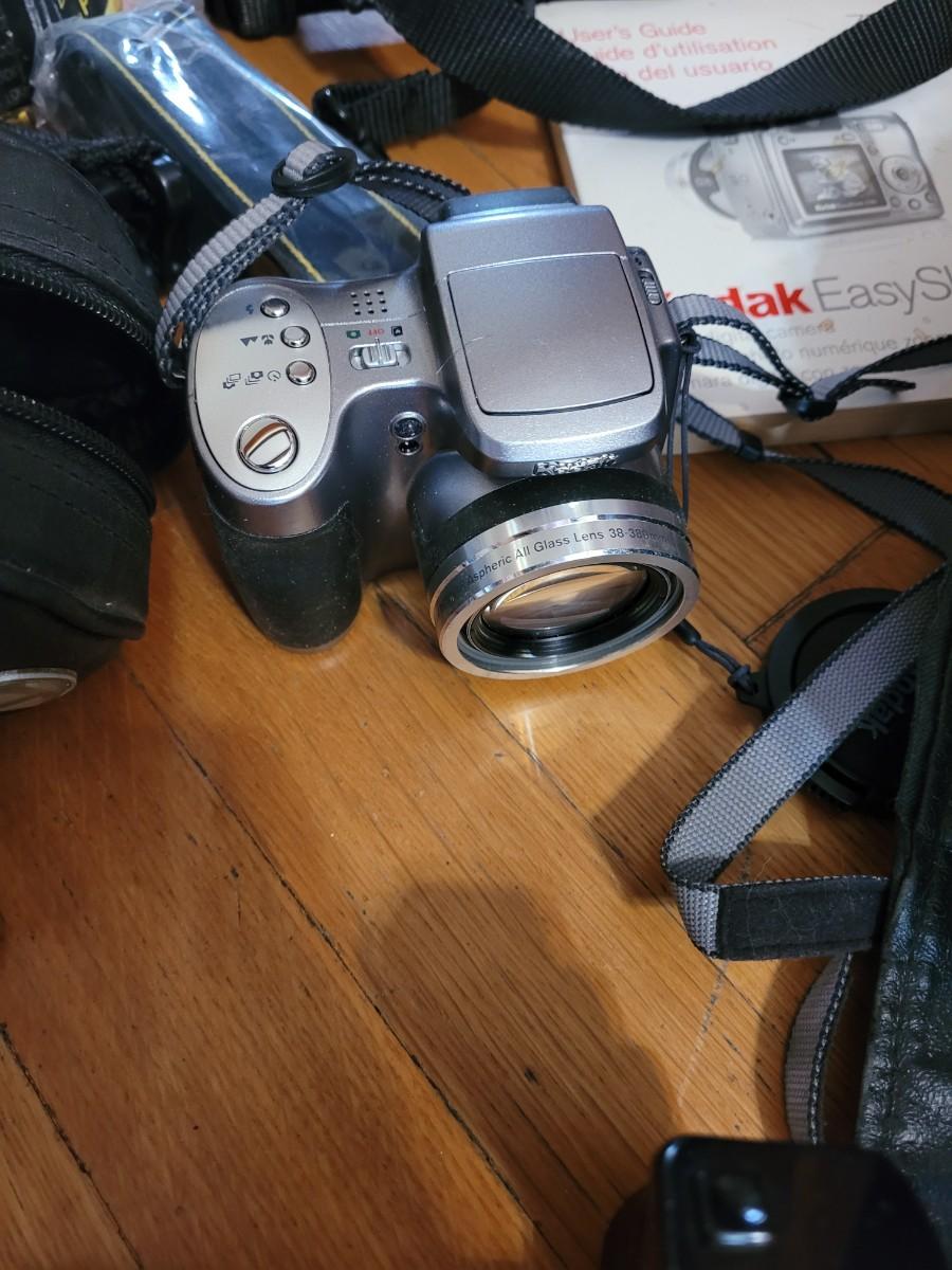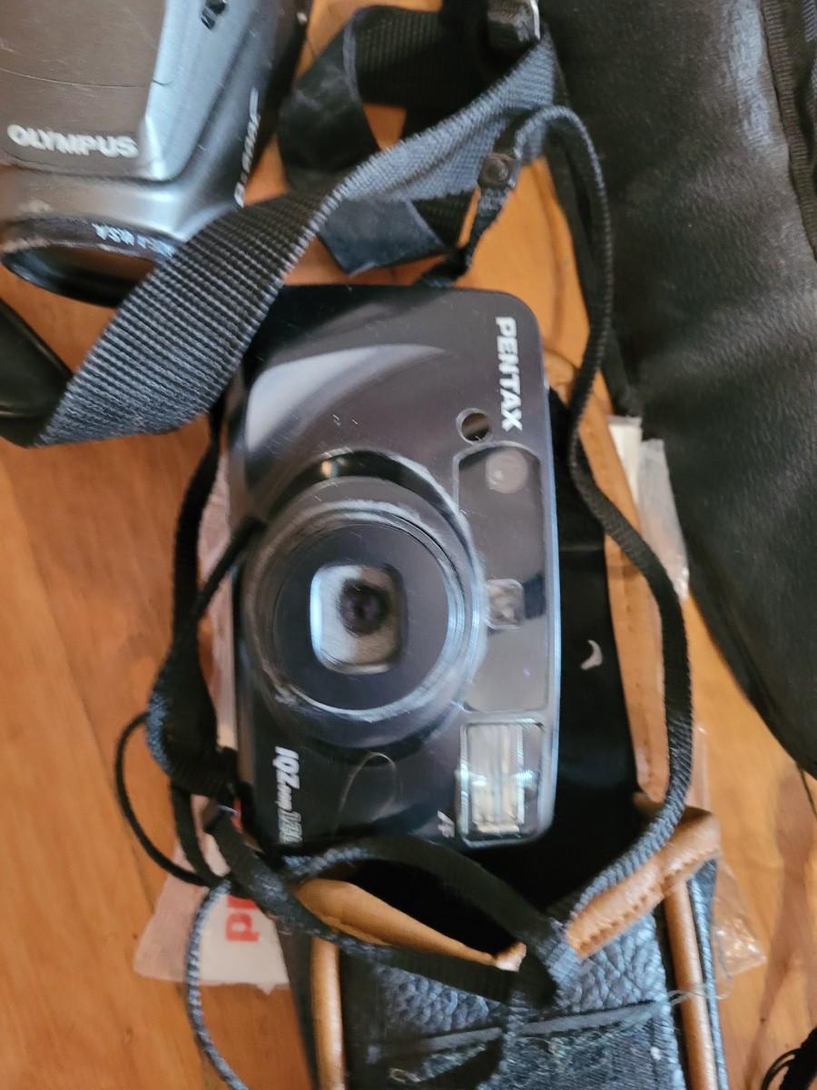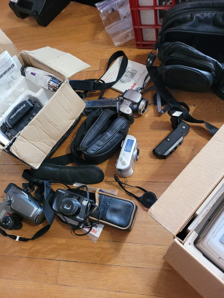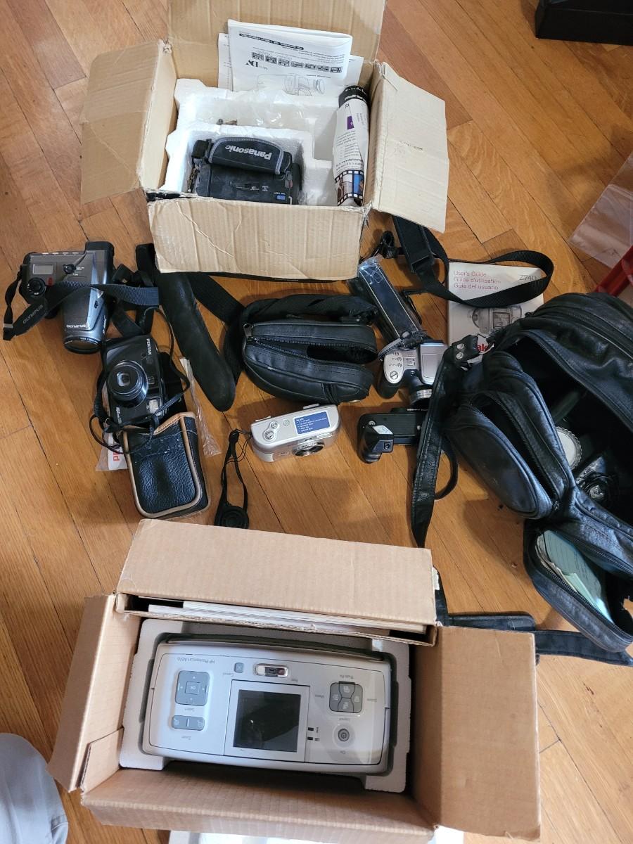 A Panasonic movie camera, an Olympus camera a Pentax camera in a bag with the operating instructions and HP camera with a bag another Kodak camera straps classic flash stick, and an HP Photosmart photo printer