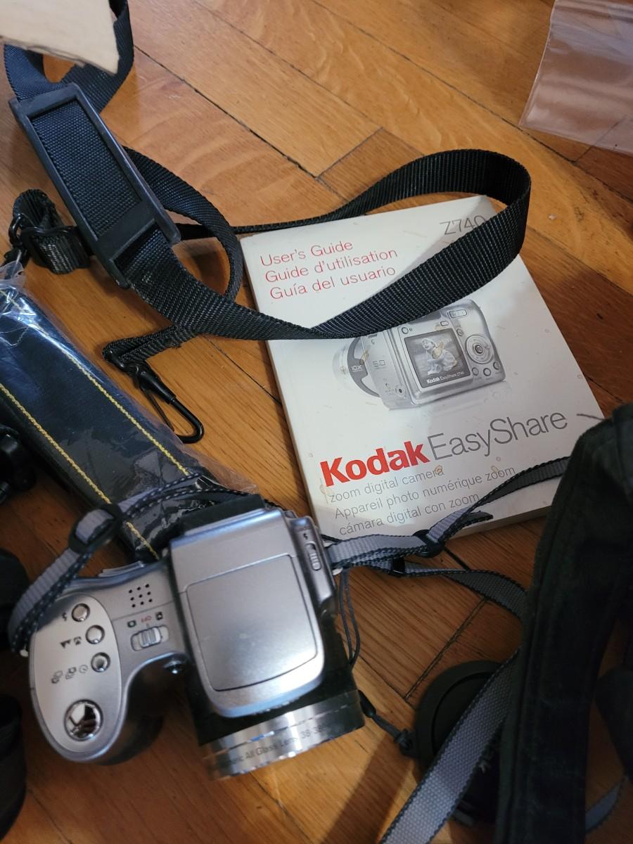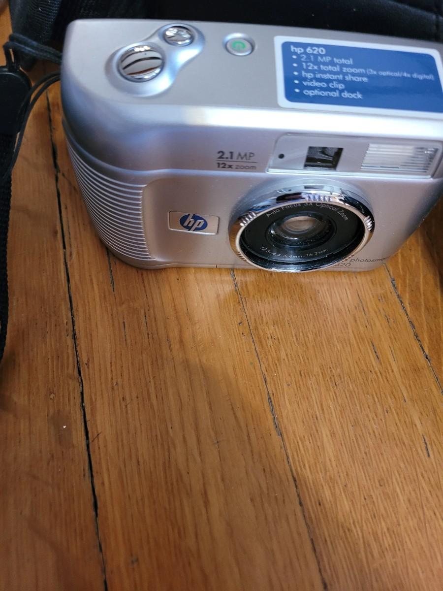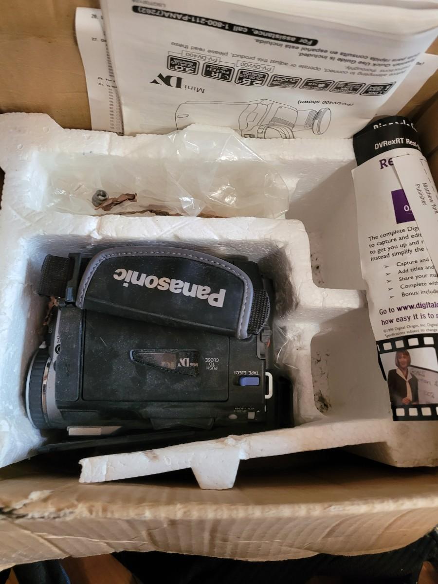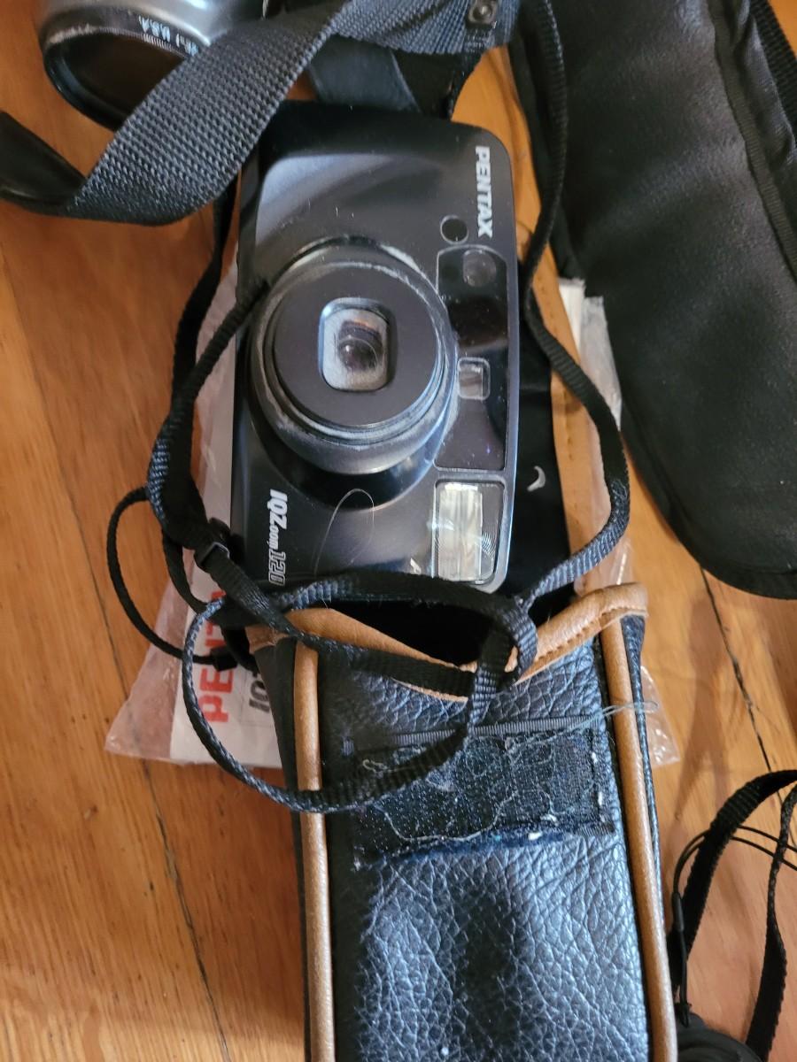 A Panasonic movie camera, an Olympus camera a Pentax camera in a bag with the operating instructions and HP camera with a bag another Kodak camera straps classic flash stick, and an HP Photosmart photo printer