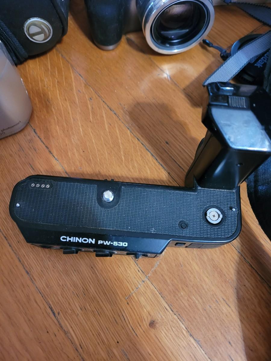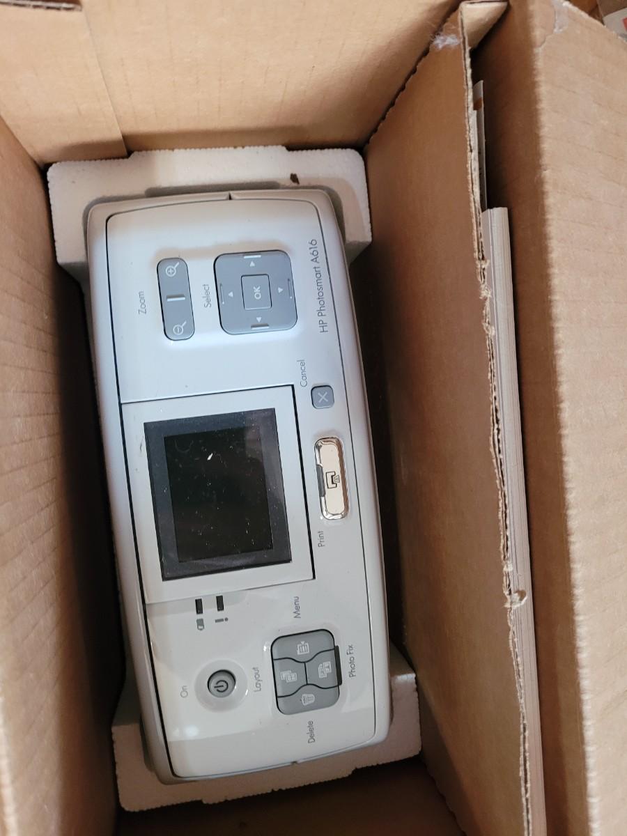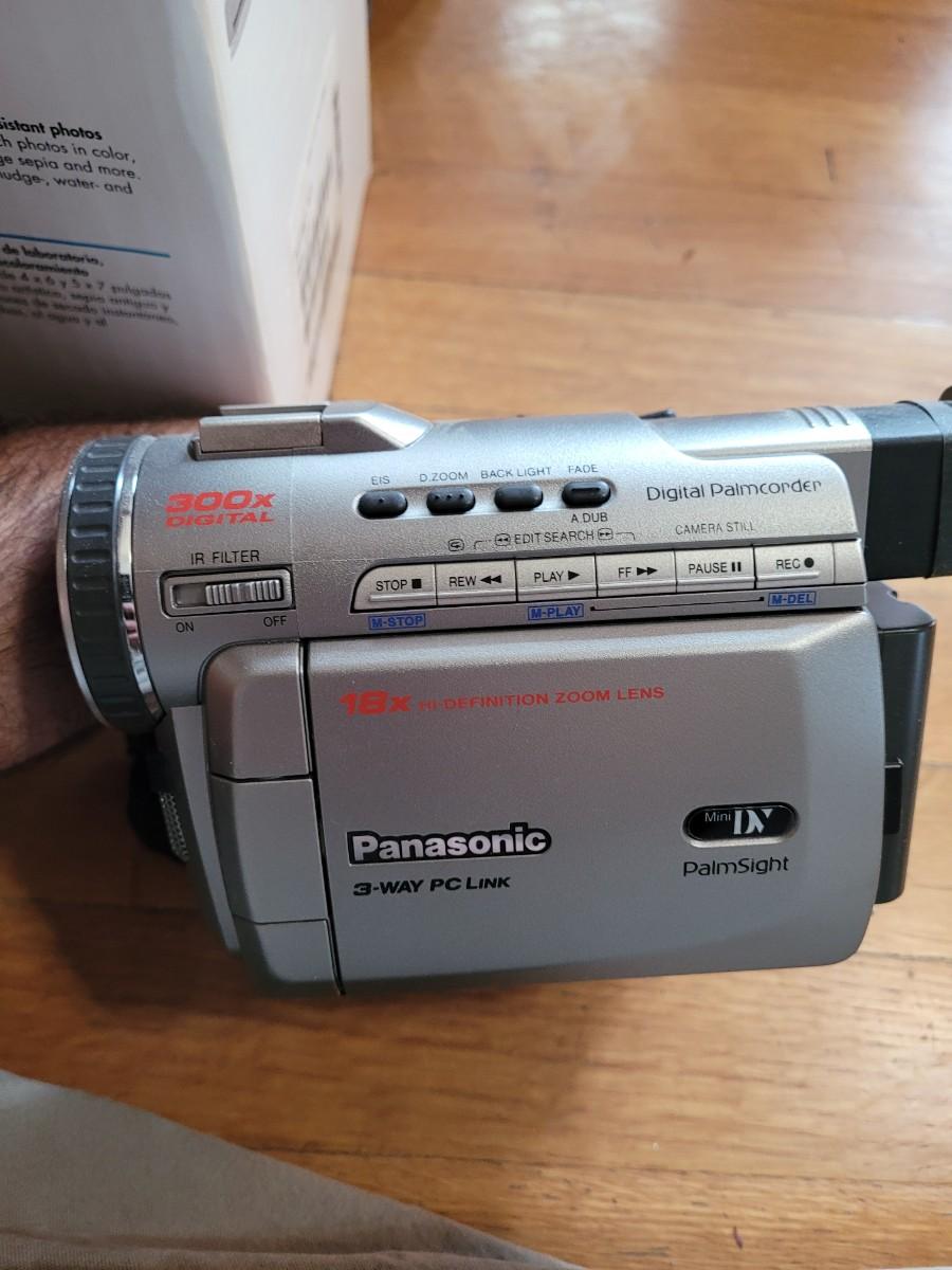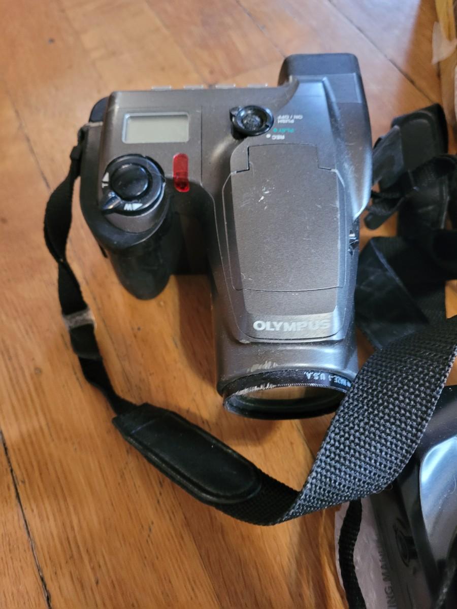 A Panasonic movie camera, an Olympus camera a Pentax camera in a bag with the operating instructions and HP camera with a bag another Kodak camera straps classic flash stick, and an HP Photosmart photo printer