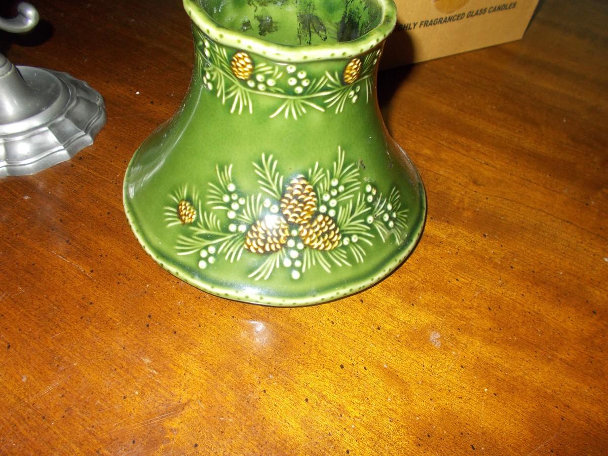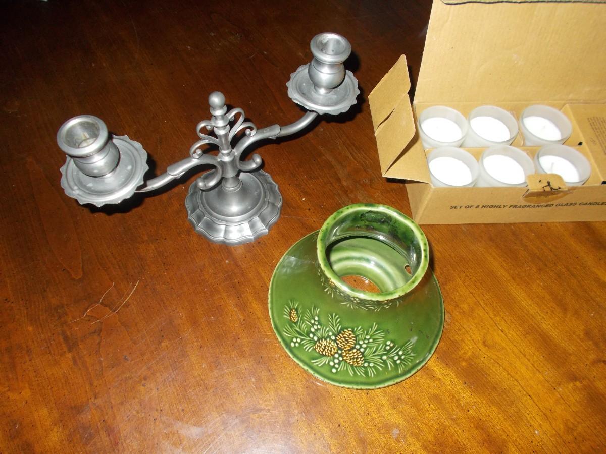 This lot includes a green ceramic candle holder by Yankee Candle company with a pinecone design, a pewter candle holder, and a box of Hosley scented candles.