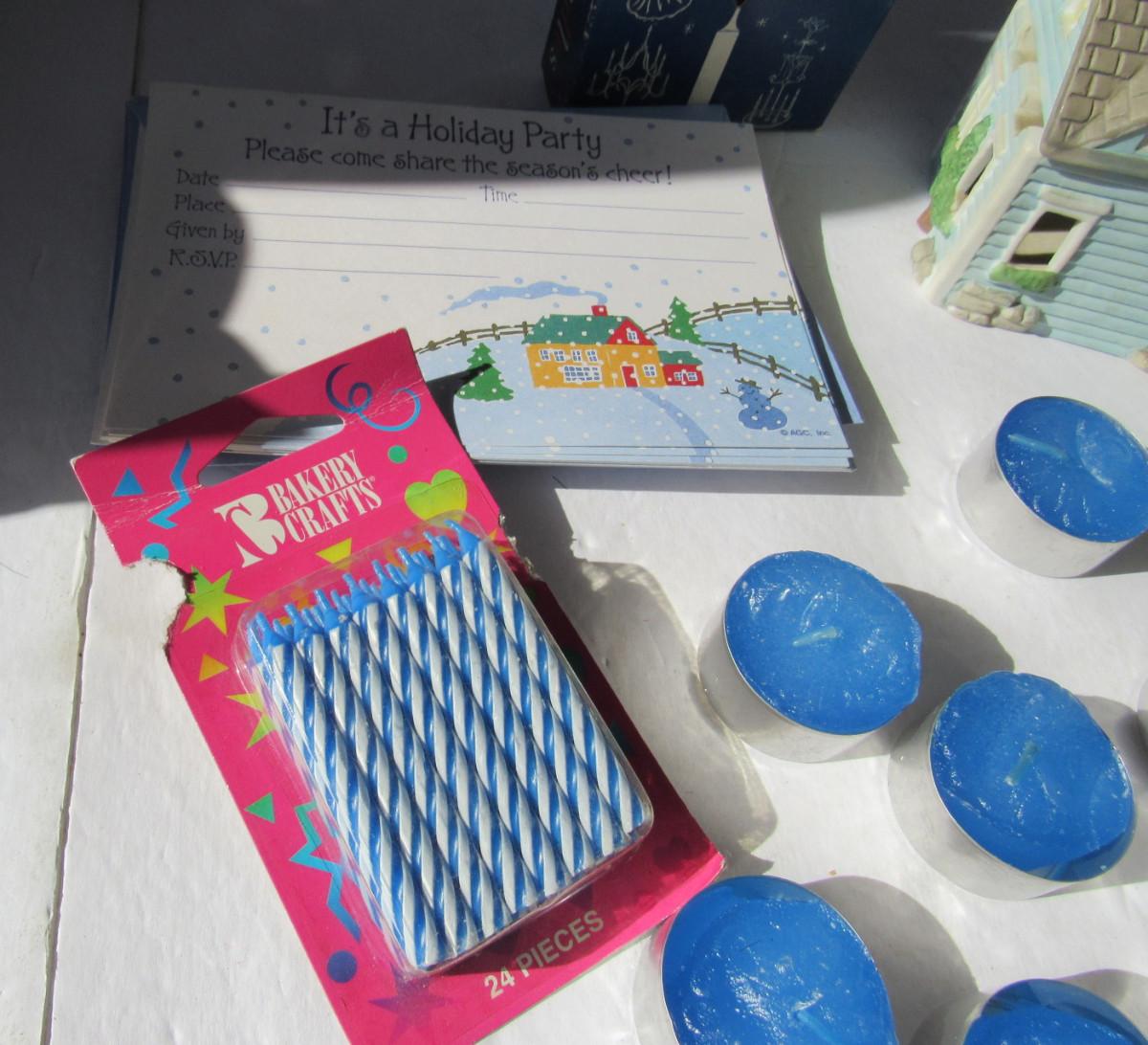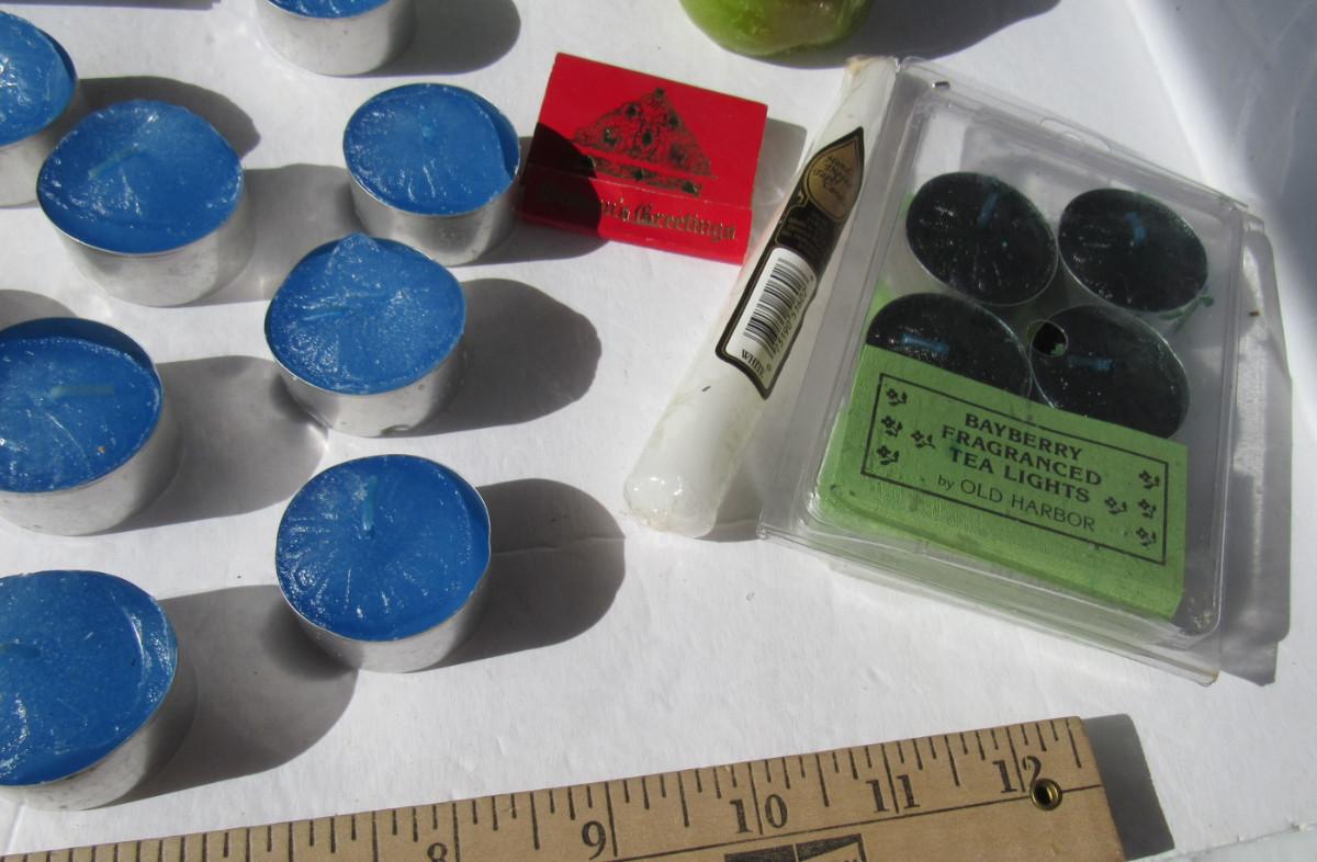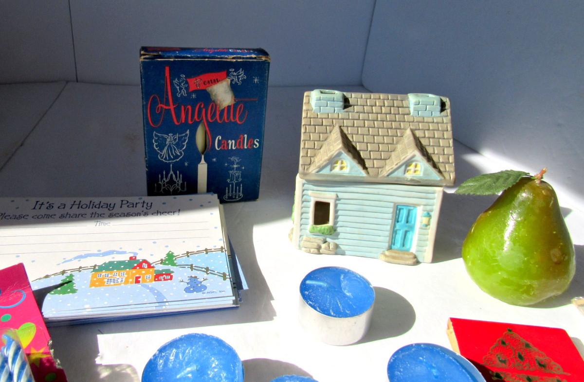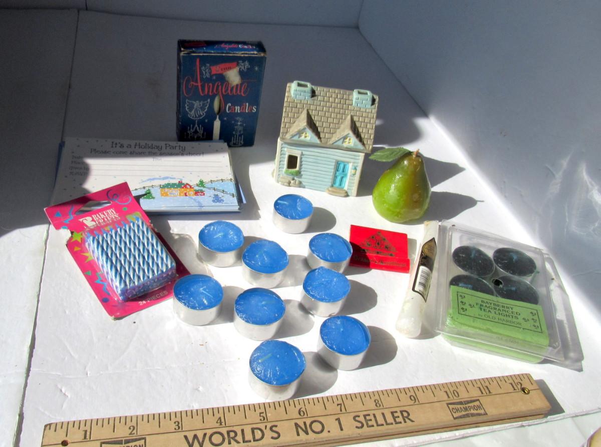 Some of the tealights are partially melted from the sun, but still usable. Some party invitatons/birthday candles, more candles in box. Shipping is available at actual shipping cost plus $5.00 handling fee per box for supplies/labor. See our terms for details. All sales are final. Condition notes may not be all inclusive, we may miss some issues as most vintage items are not in mint condition and have some degree of wear, paint loss, etc, but we always try to note obvious damage.