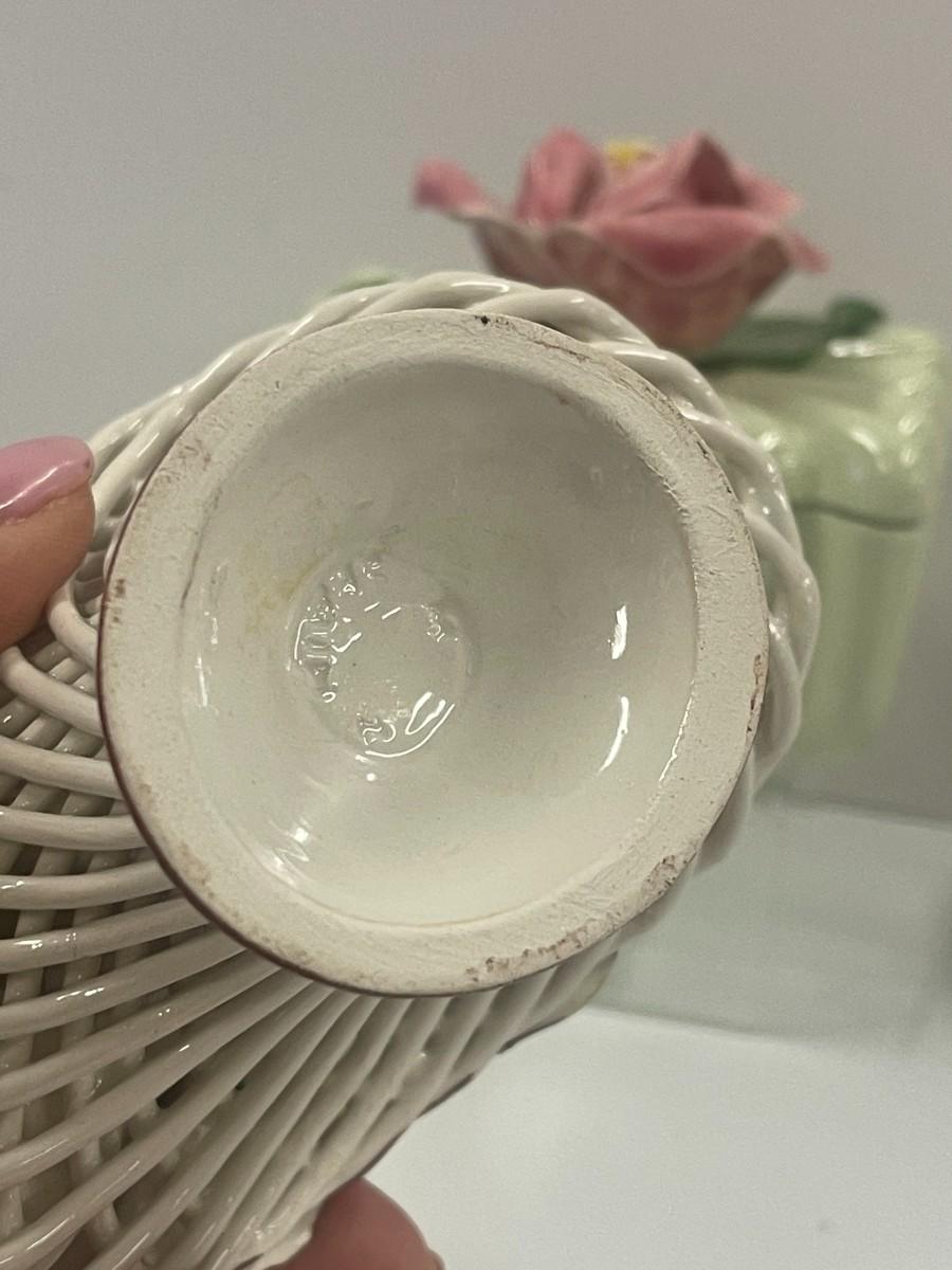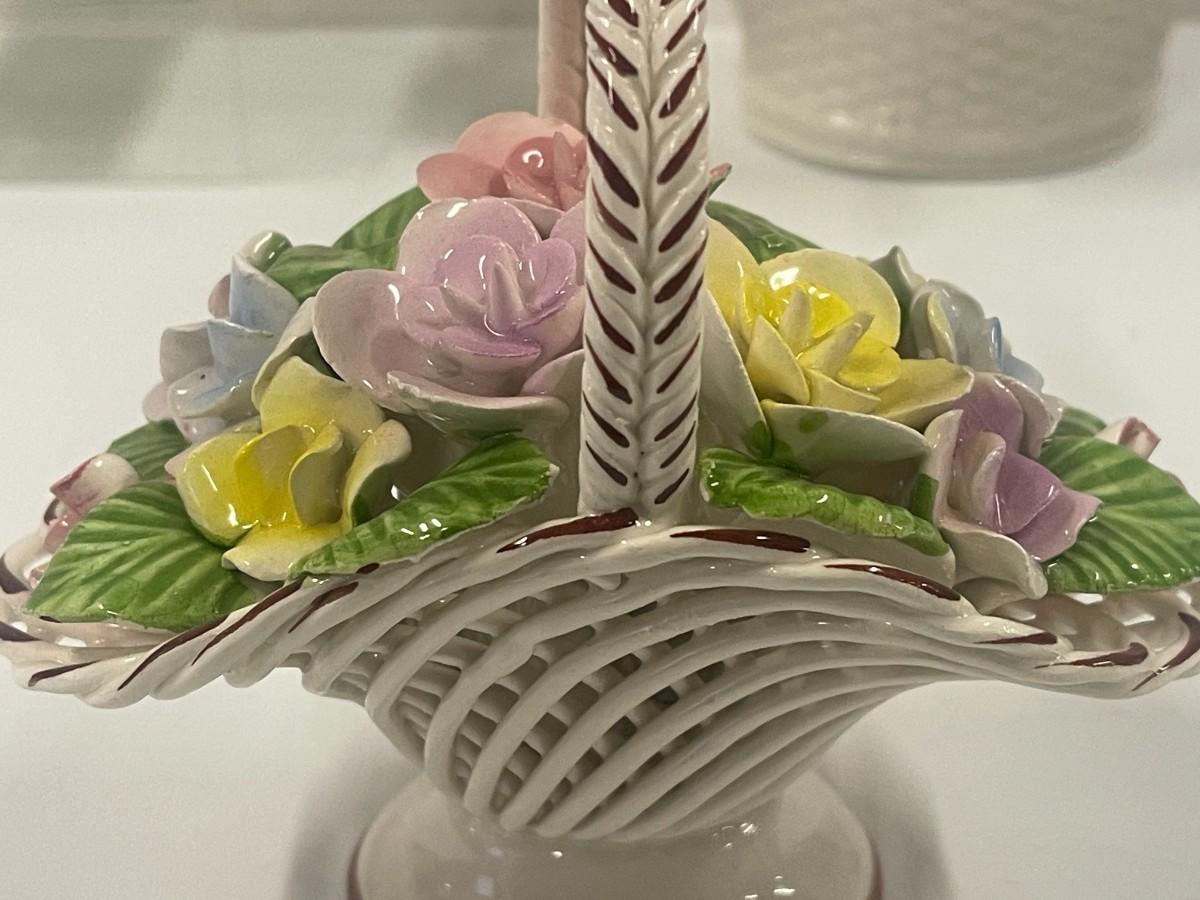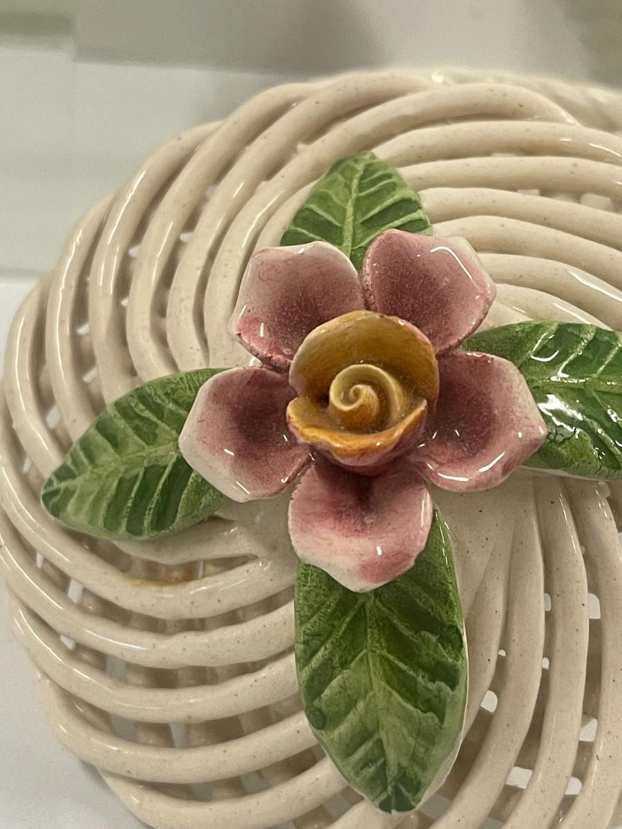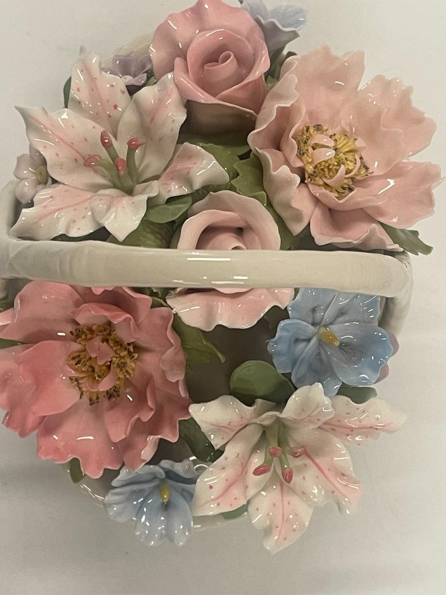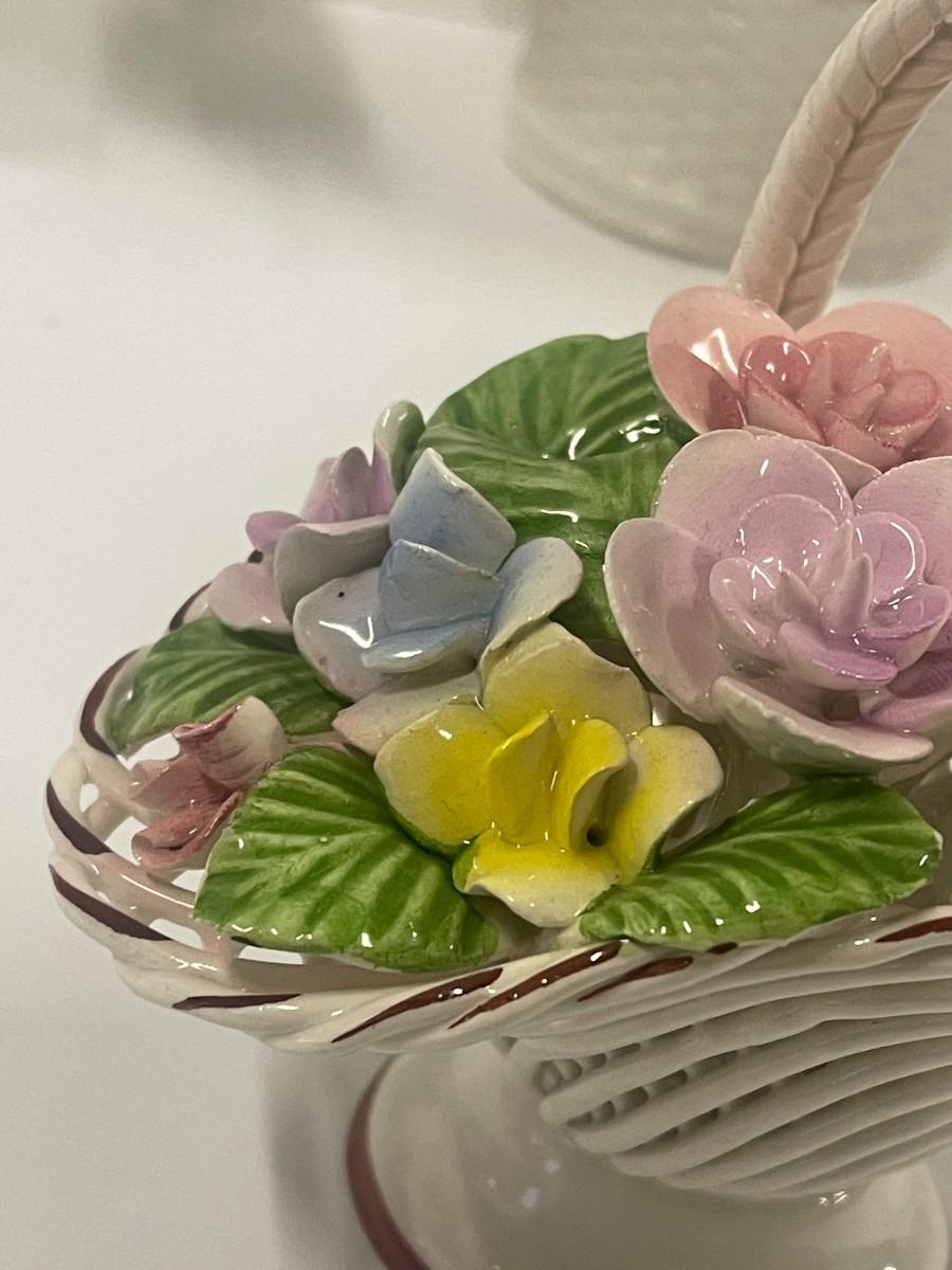 Lot of Capodimonte Style Porcelain Flower Baskets & Trinket Boxes. They all appear to be in excellent condition. There is a chip on one of the flowers on the lid of the green trinket box.