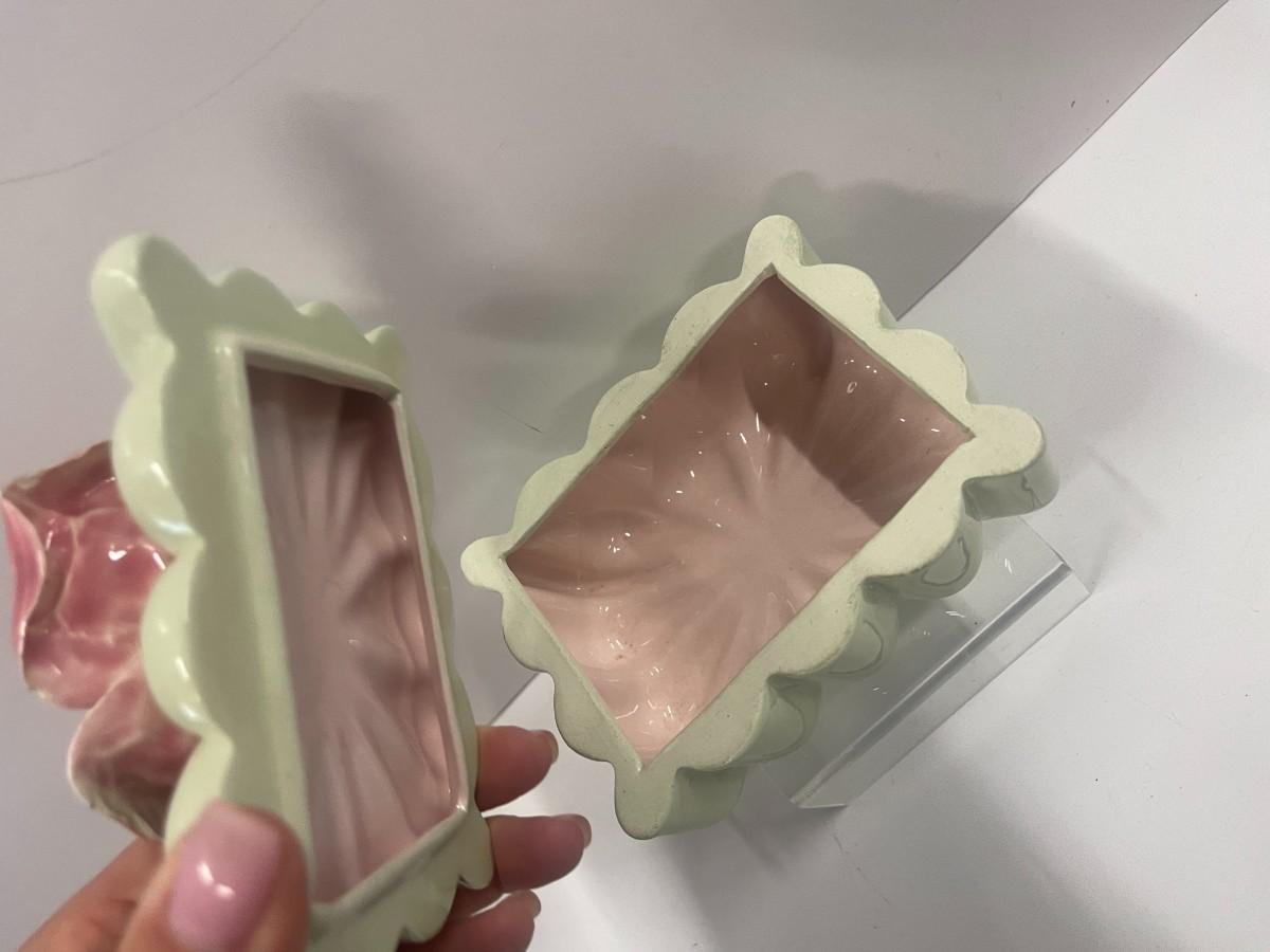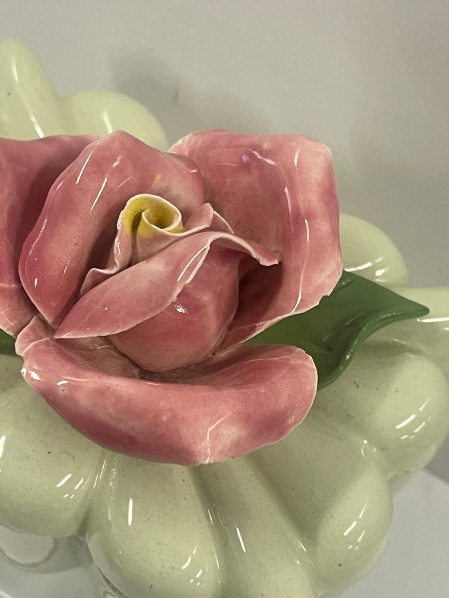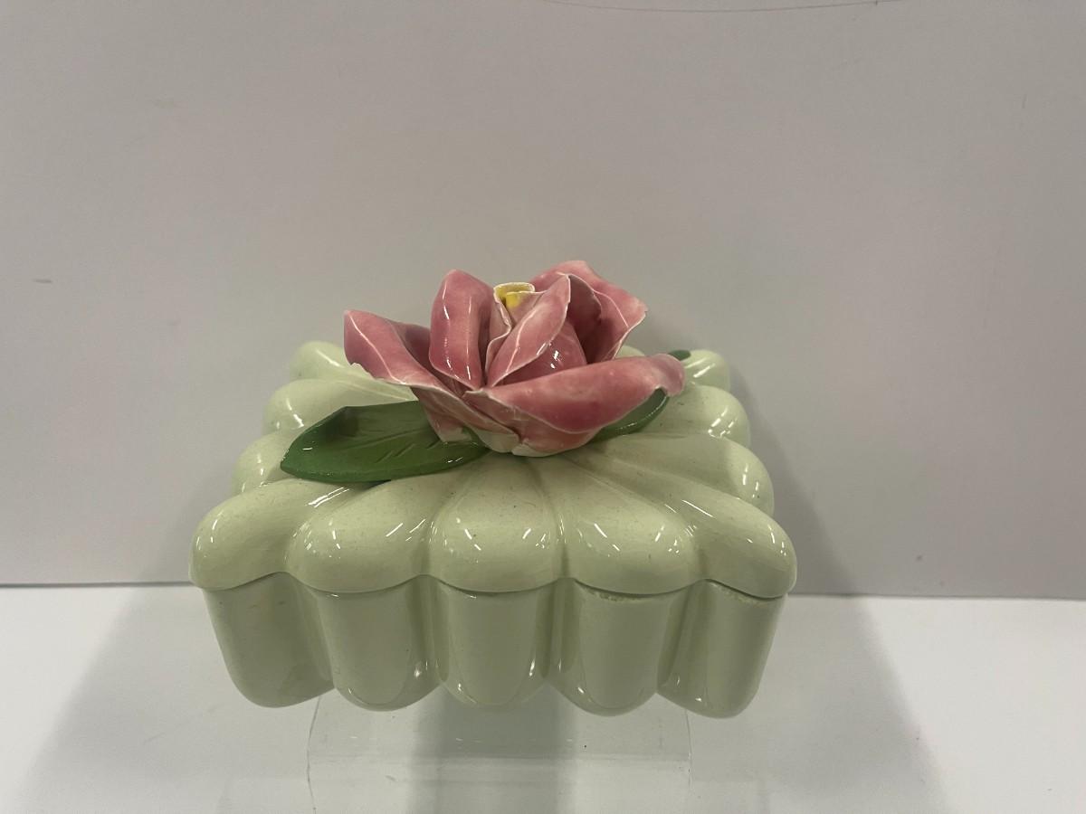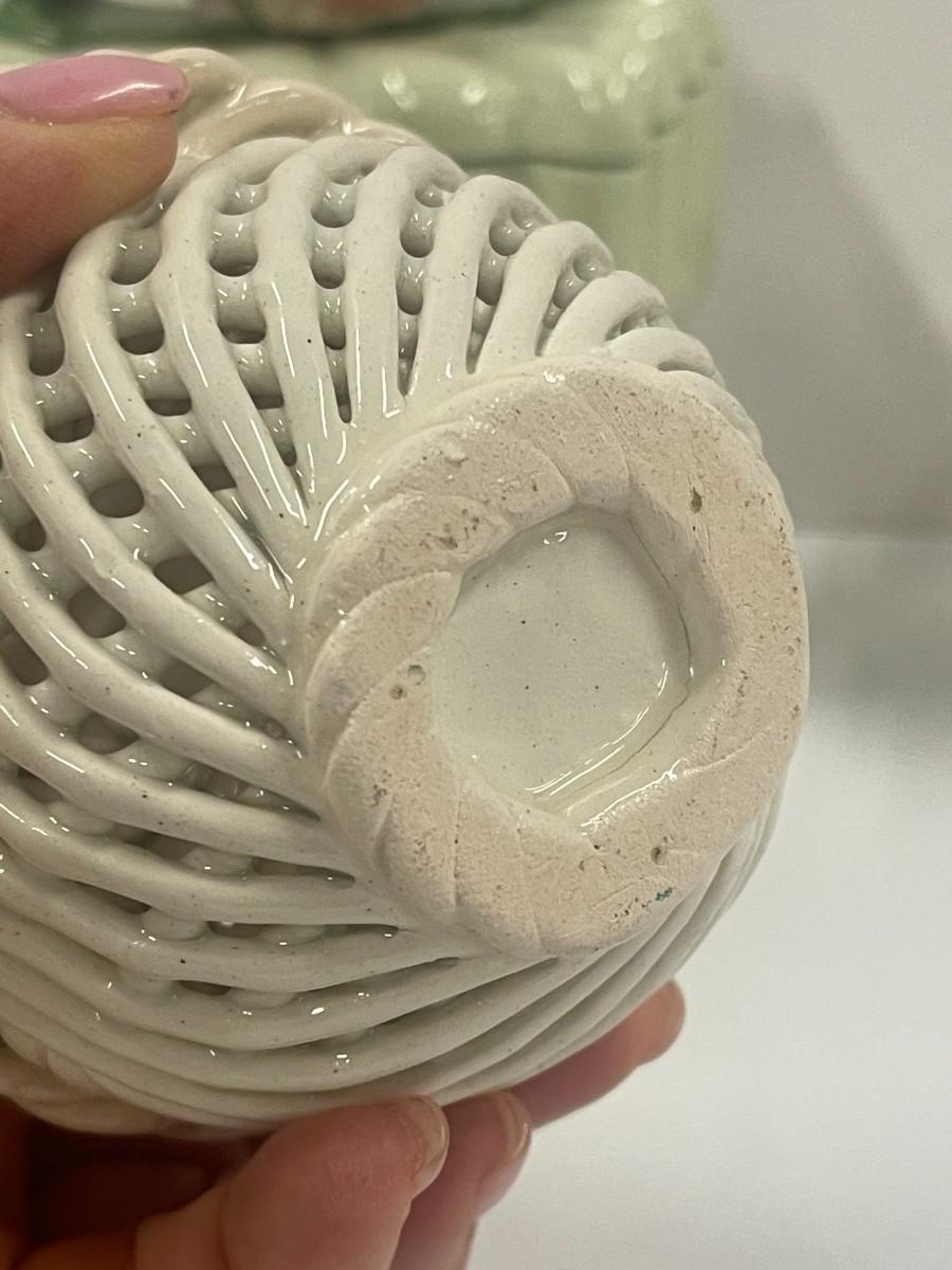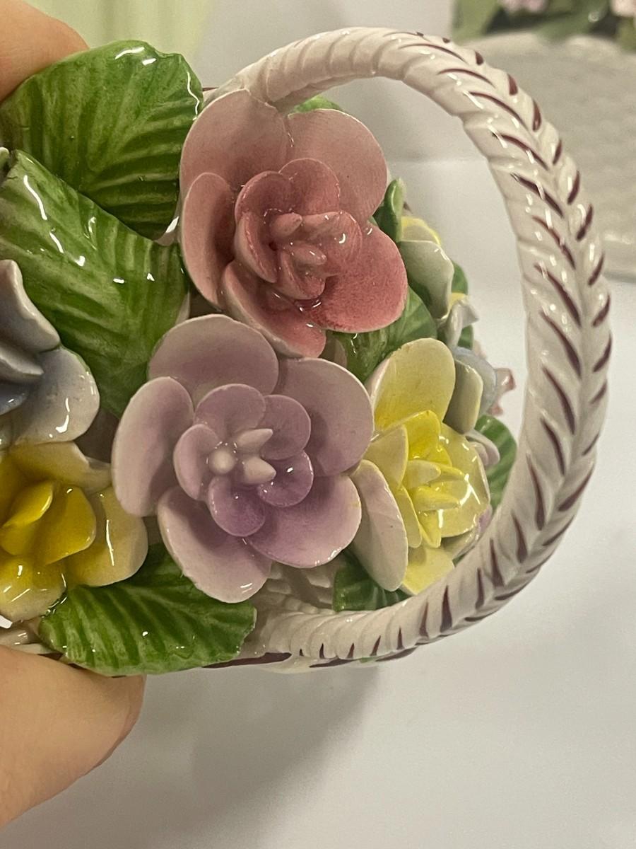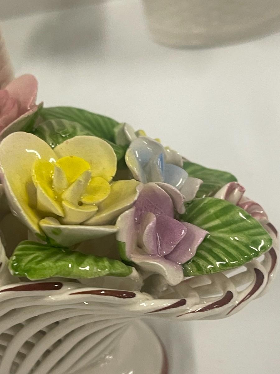 Lot of Capodimonte Style Porcelain Flower Baskets & Trinket Boxes. They all appear to be in excellent condition. There is a chip on one of the flowers on the lid of the green trinket box.