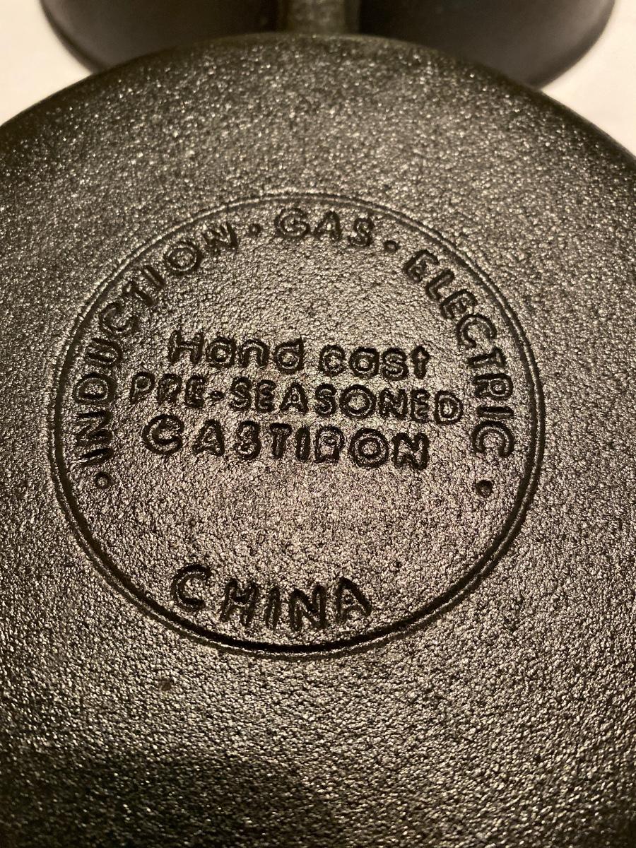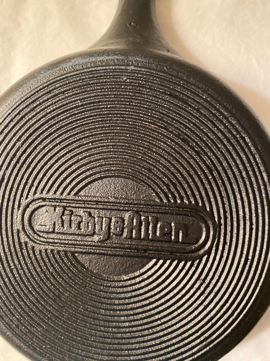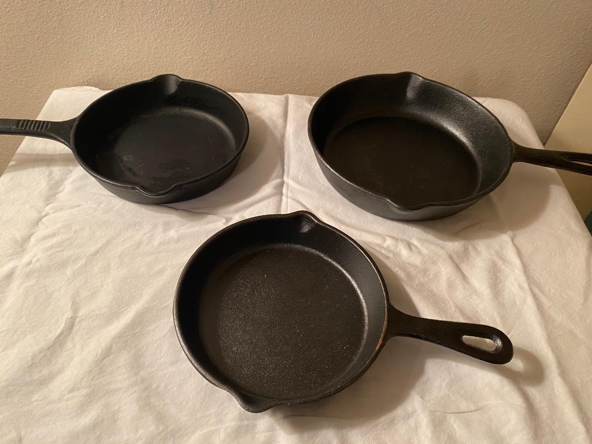 Lot of cast iron frying pans, NEW. One Kirby & Allen (6-1/3”dia), and 2 are hand cast pre-seasoned China - 8”dia and 6-1/4”dia).