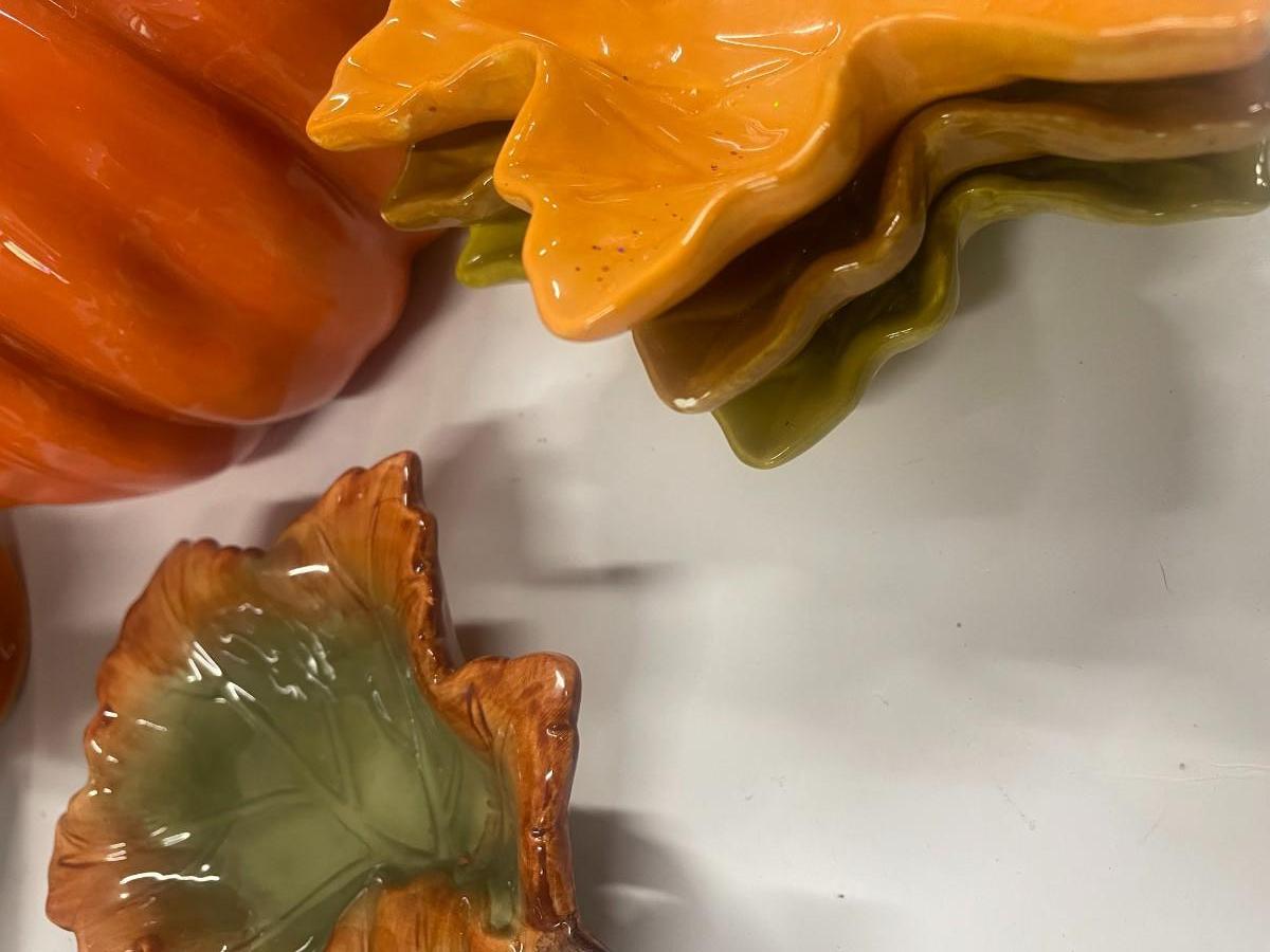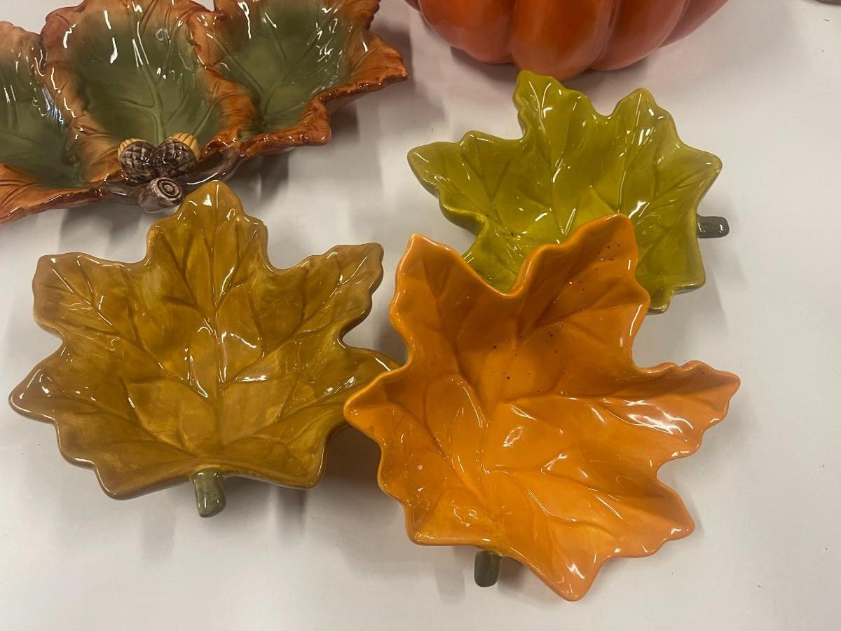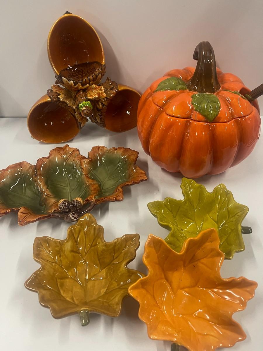 Lot of ceramic fall decor: pumpkin tureen, assorted acorn and leaf dishes. There are a couple of chips on the edges of one of the leaf dishes and the inside lip of the tureen has a small chip where you can't see it.