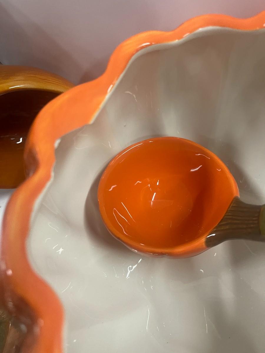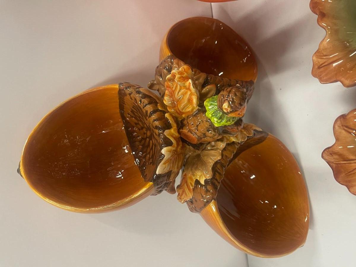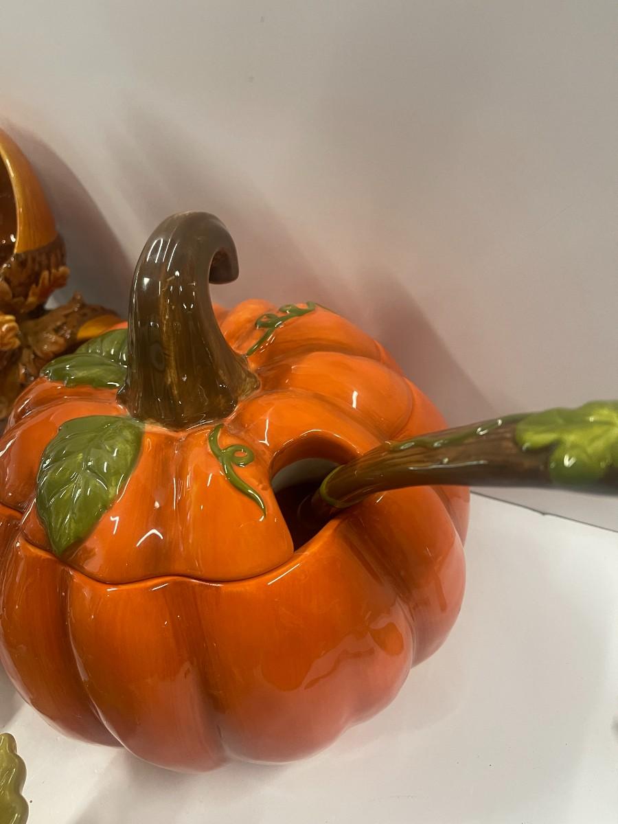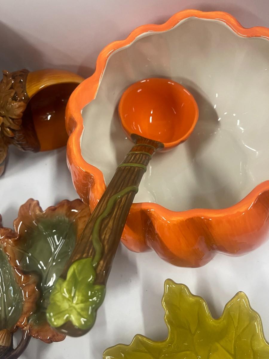 Lot of ceramic fall decor: pumpkin tureen, assorted acorn and leaf dishes. There are a couple of chips on the edges of one of the leaf dishes and the inside lip of the tureen has a small chip where you can't see it.