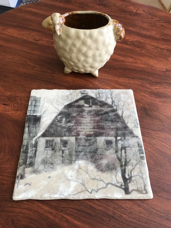 -Decorative tile art of vintage barn by Deborah Morow 12" x 12"