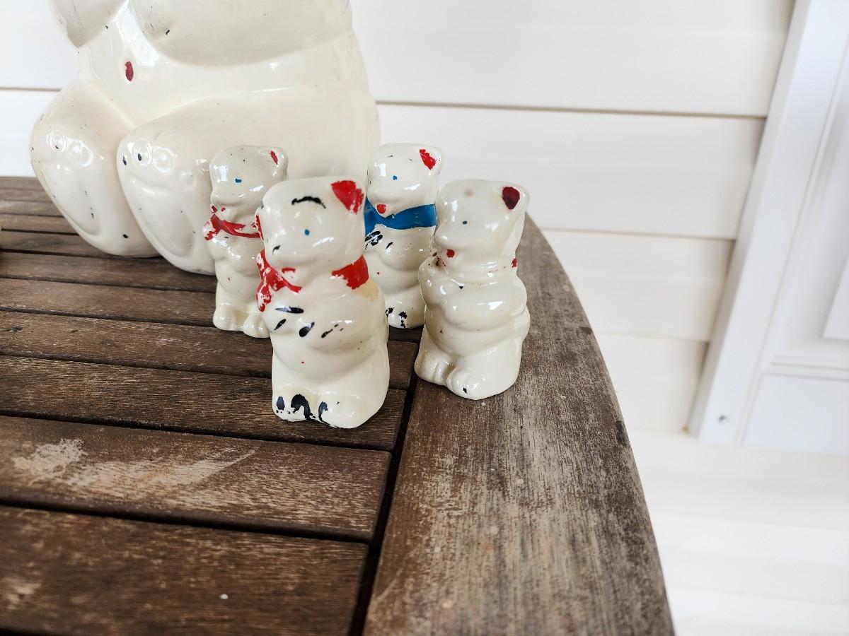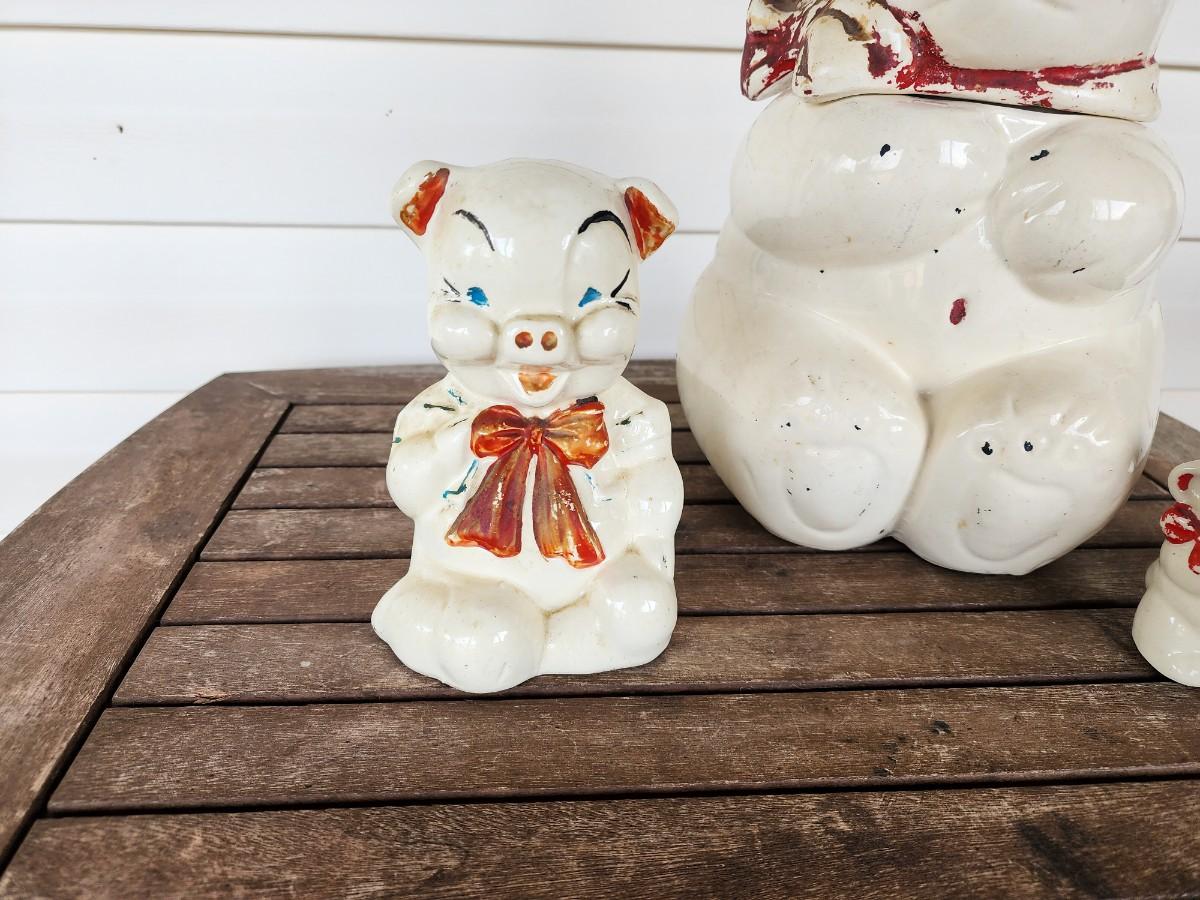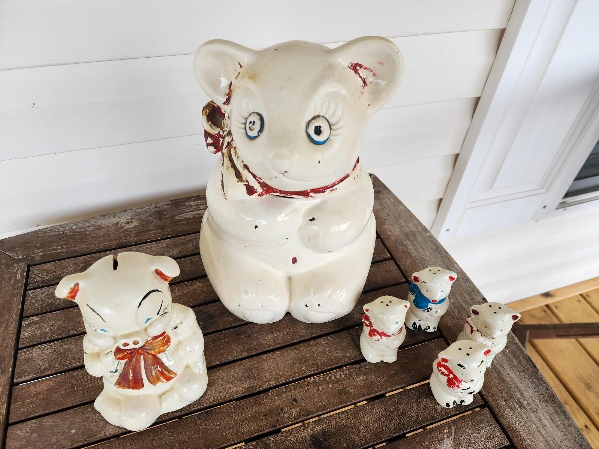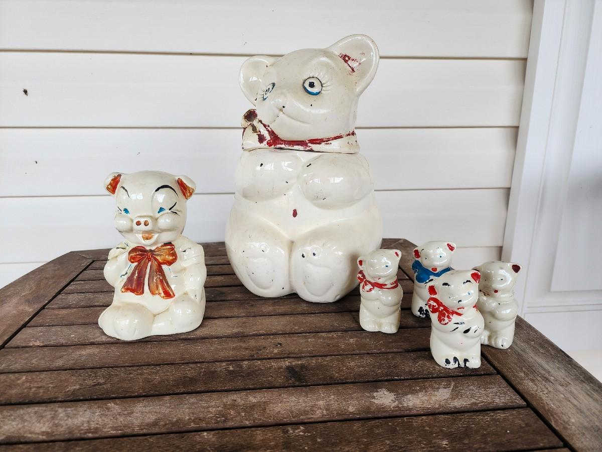 Bear Cookie Jar, two sets bear salt and pepper, Pig jar.