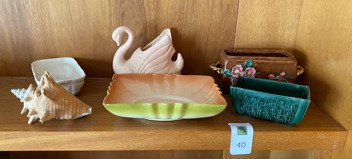 Lot includes planters and a swan. One is Los Angeles Potteries.