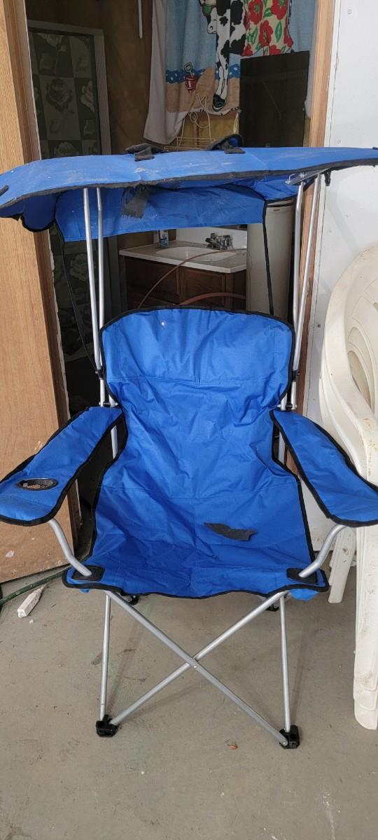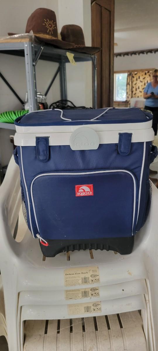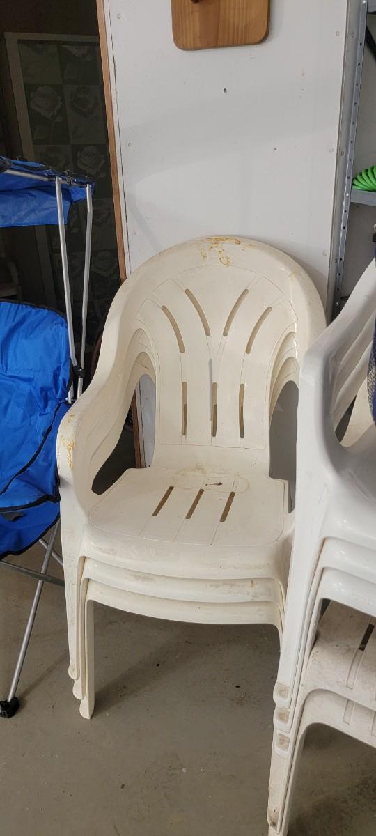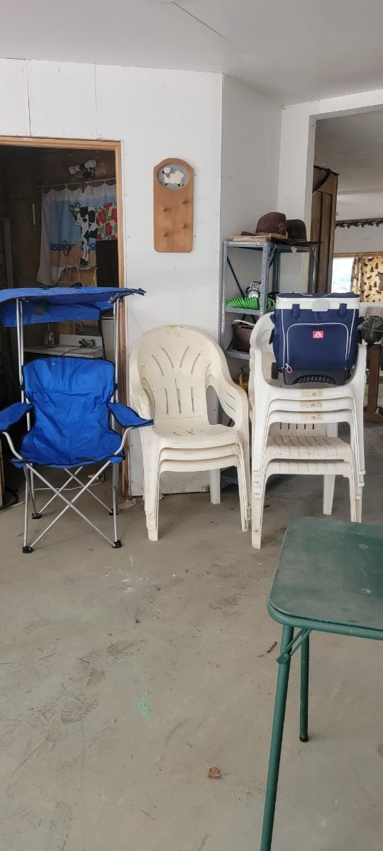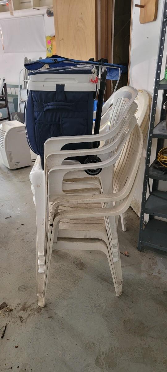 Igloo cooler. Eight white chairs. Blue covered fold up.chair.