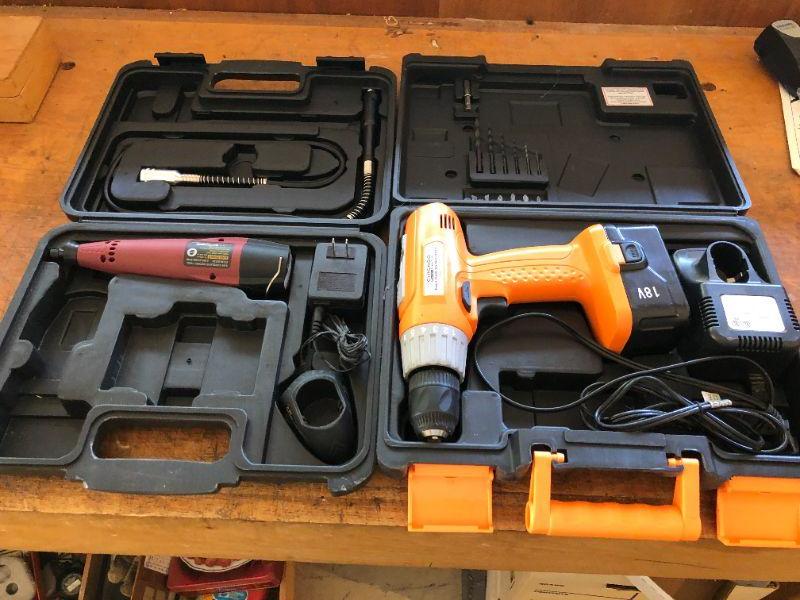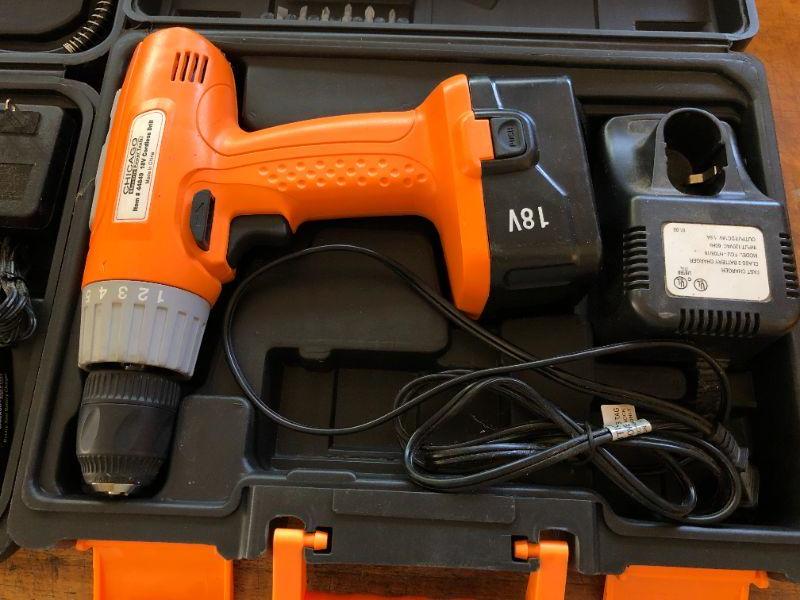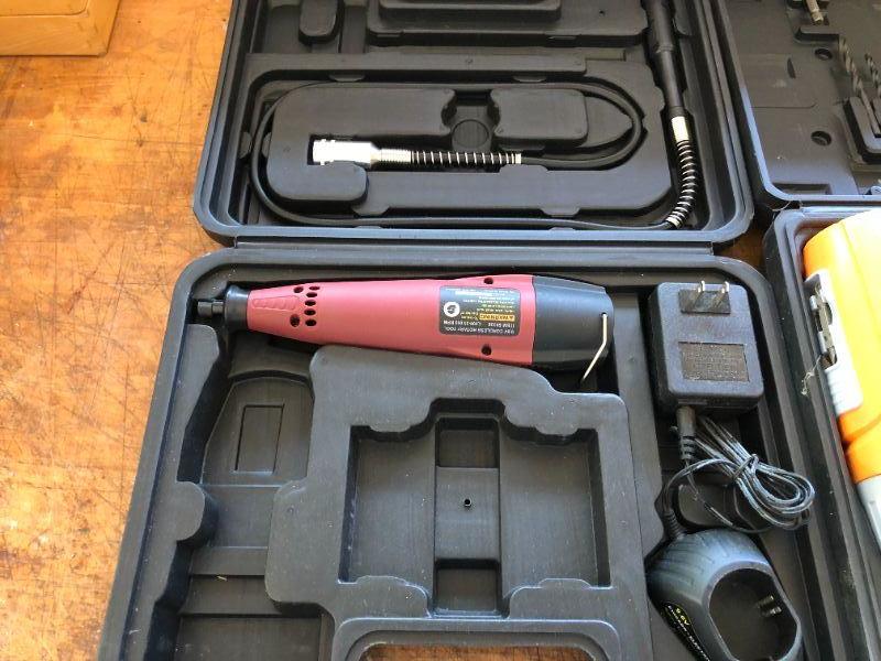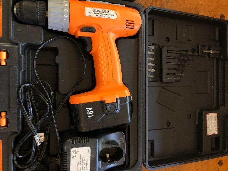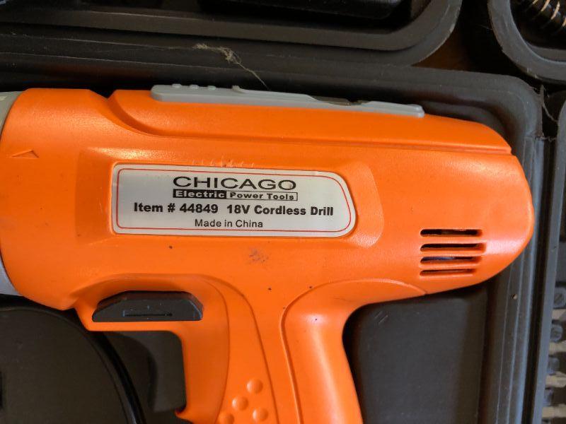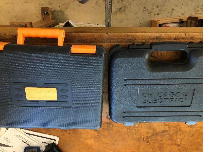 Lot of Chicago Electric Power Tools incl Cordless Drill and Rotary Tool. Everything included is shown, some items from original sets appear to be missing.