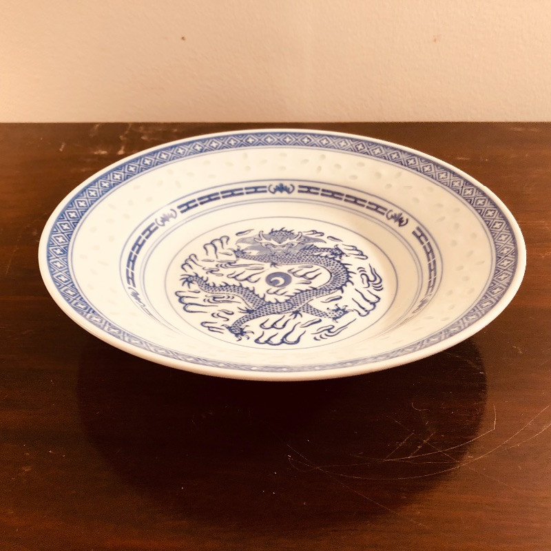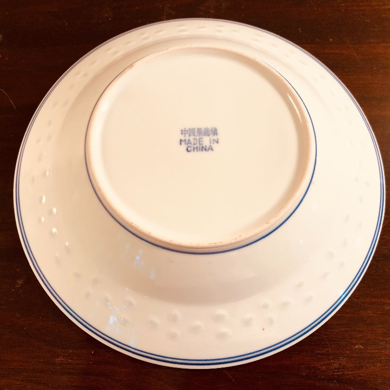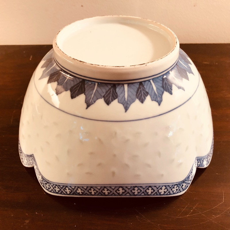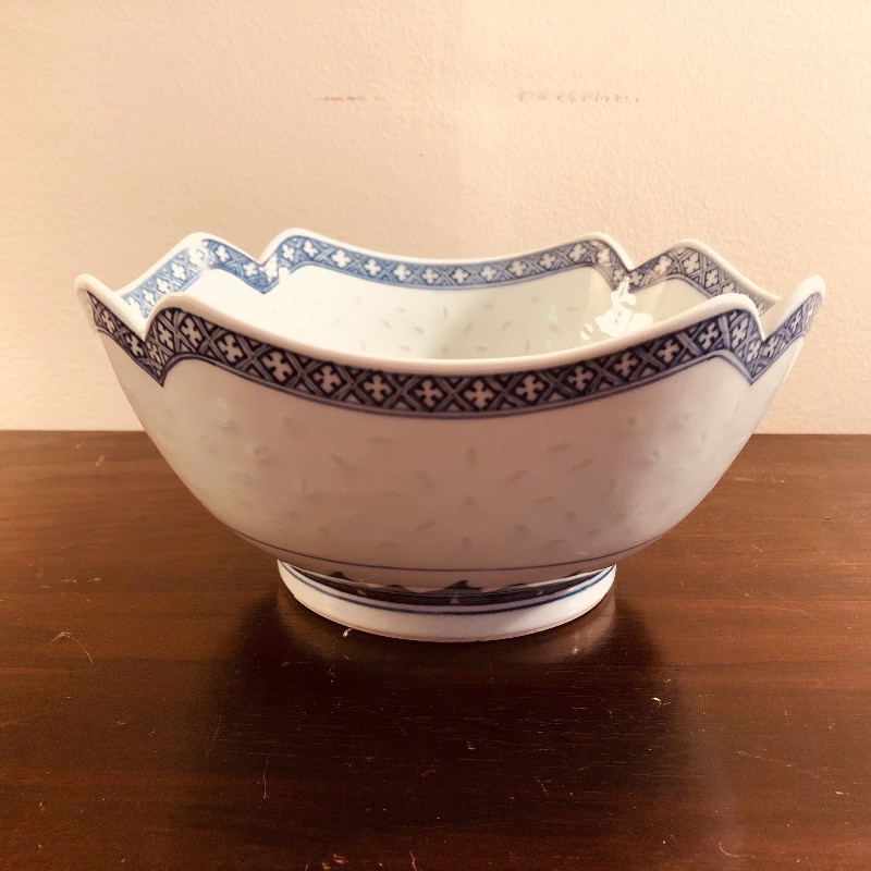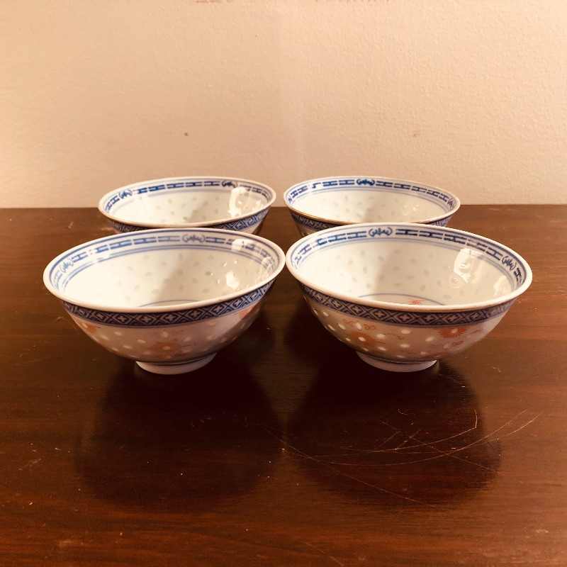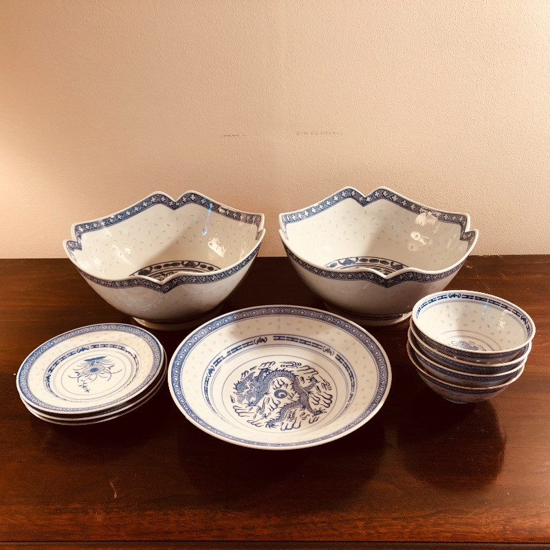 Tw 9” serving bowls, one 9”soup bowl, four rice bowls 4-1/2”, 3 small plates with reticulated pattern on edges of plates.