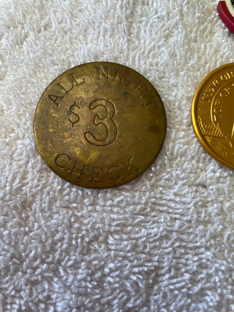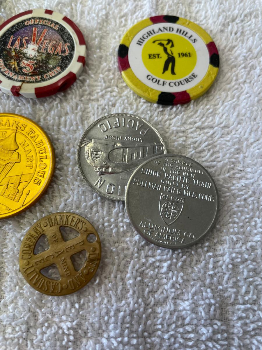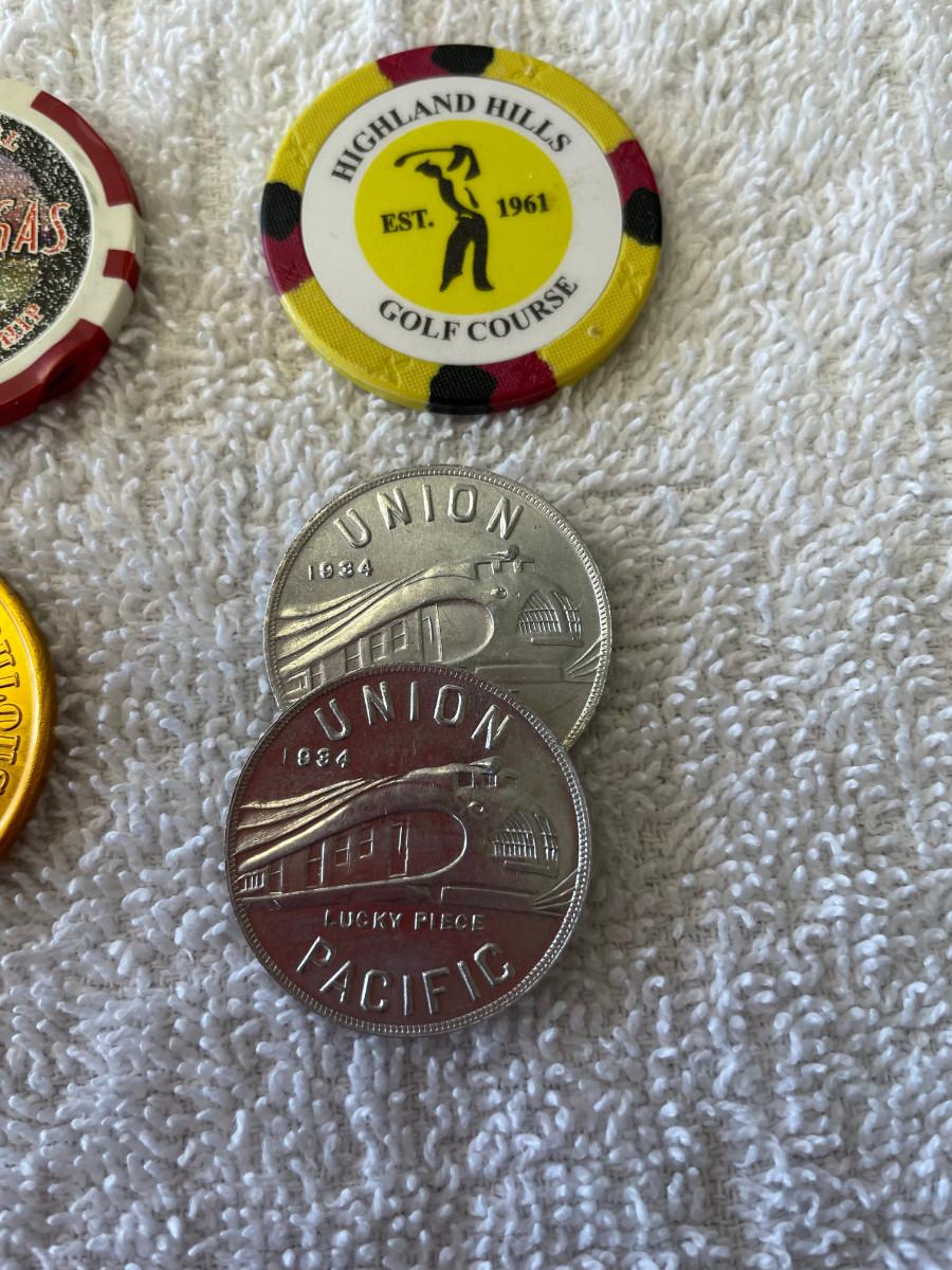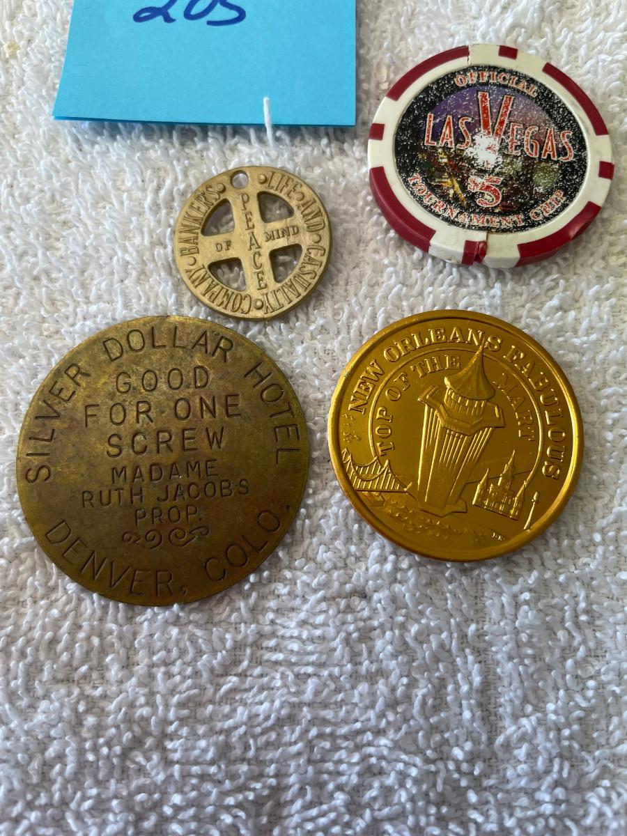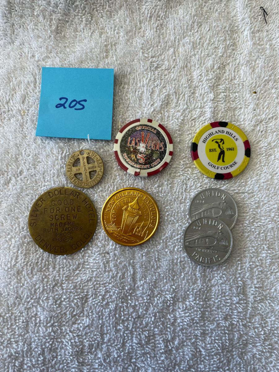 The brass brothel coin is a repro. The Union Pacific coins are 1950s.