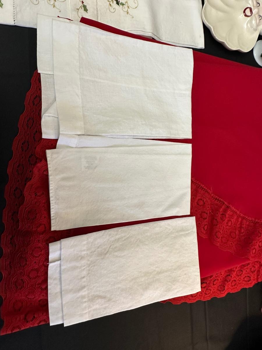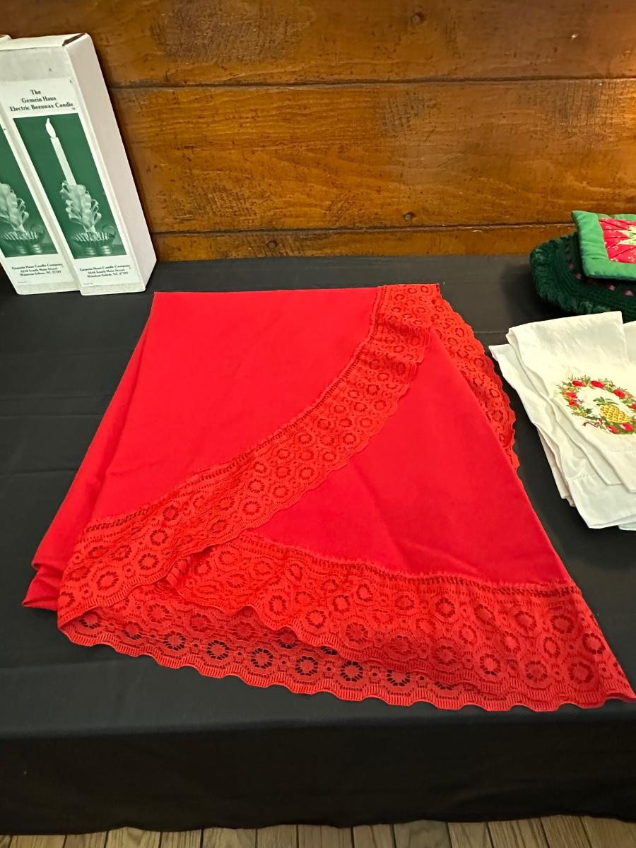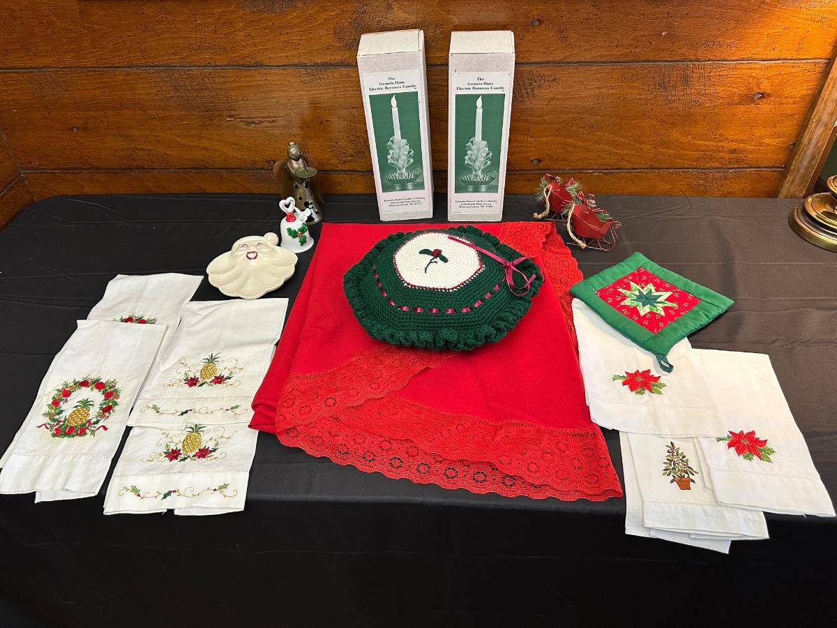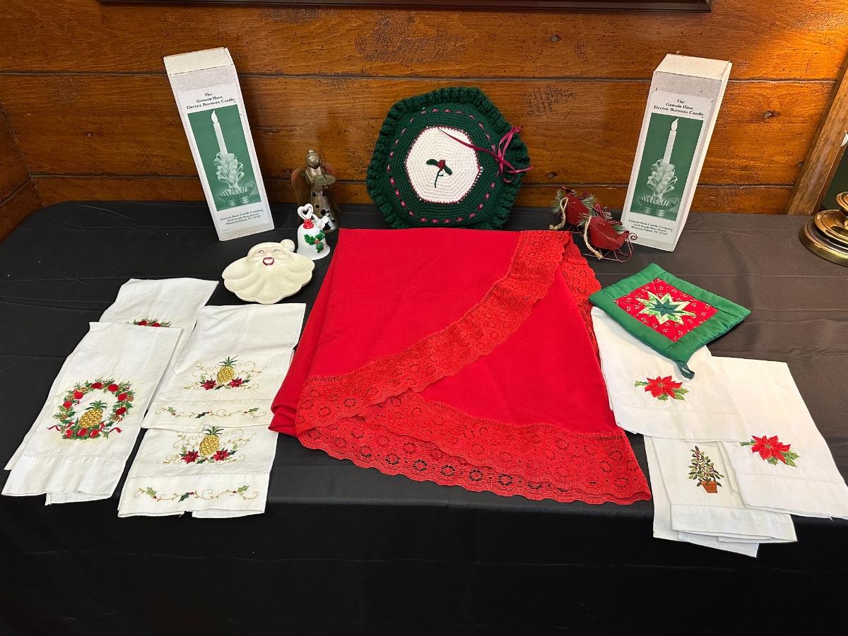 Lot of Christmas Decor including Vintage Red Table Cloth, Hand Knitted Pillow and More!