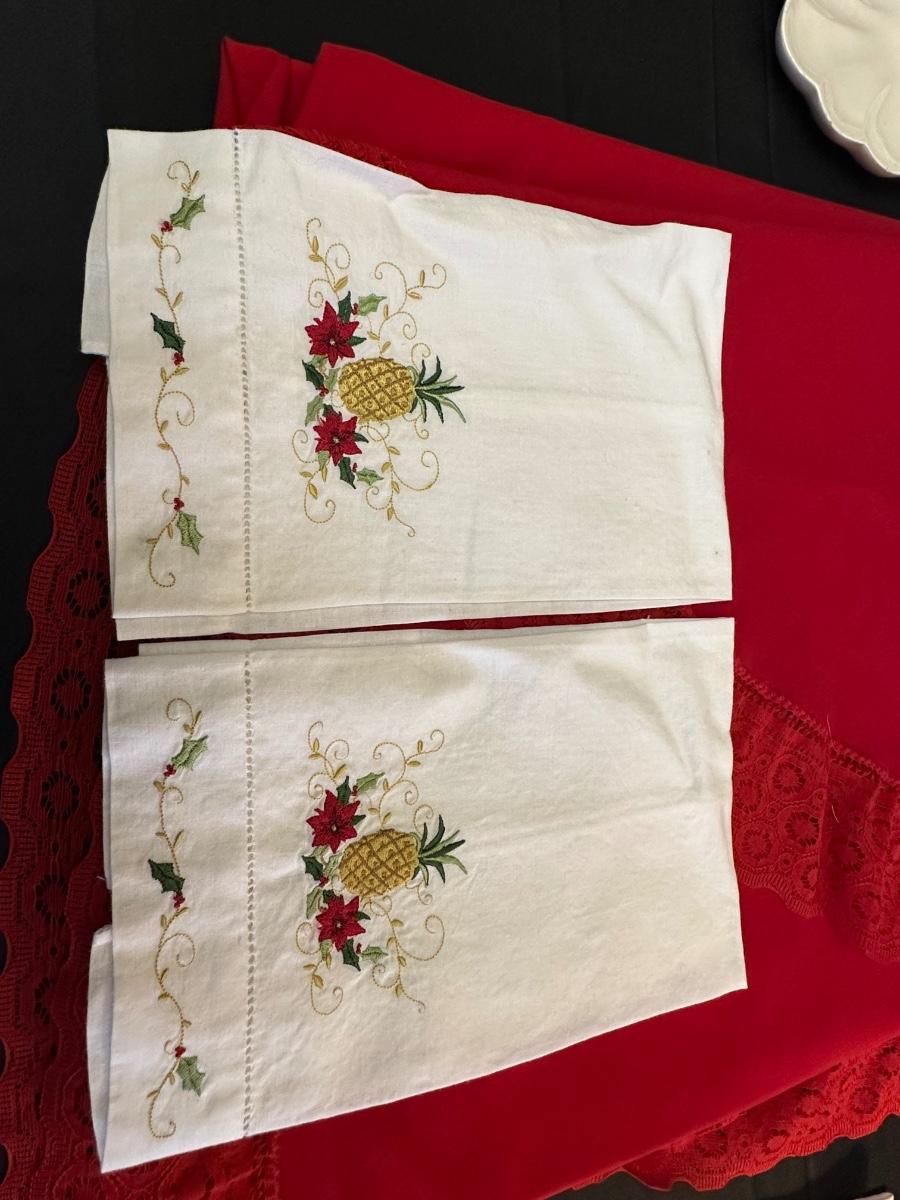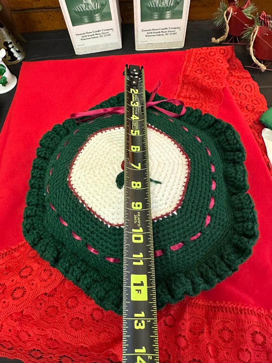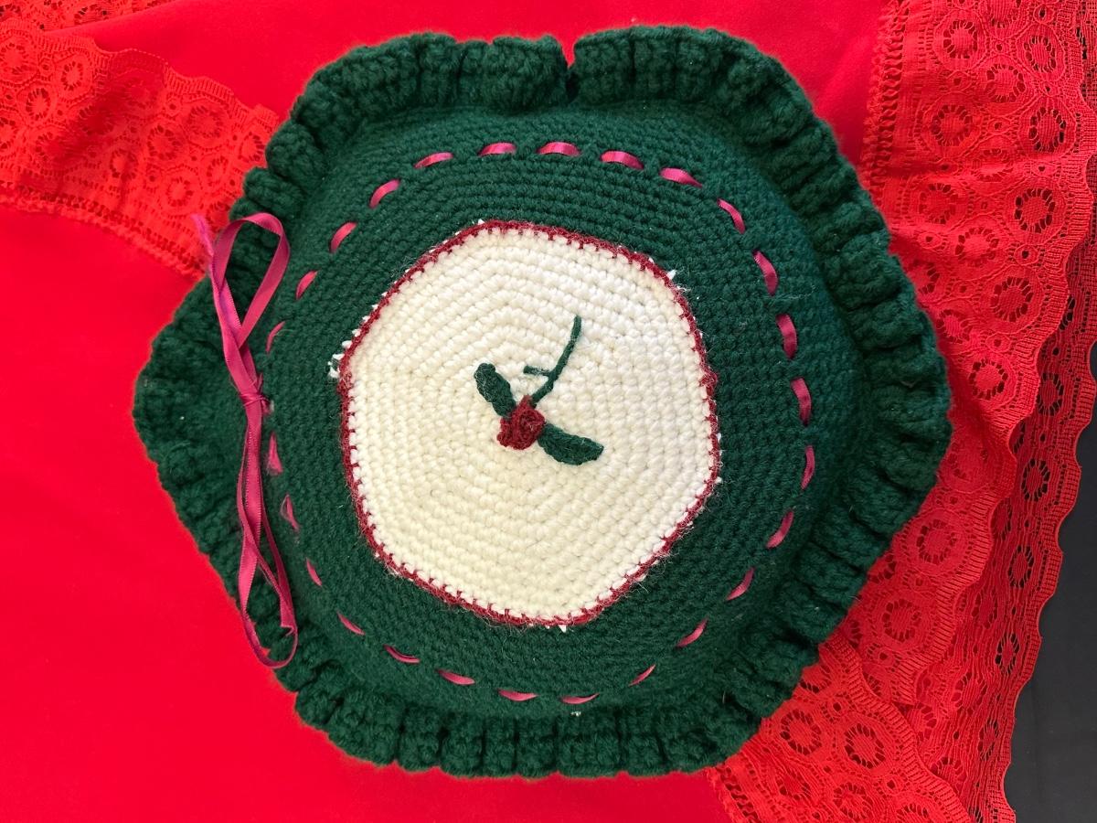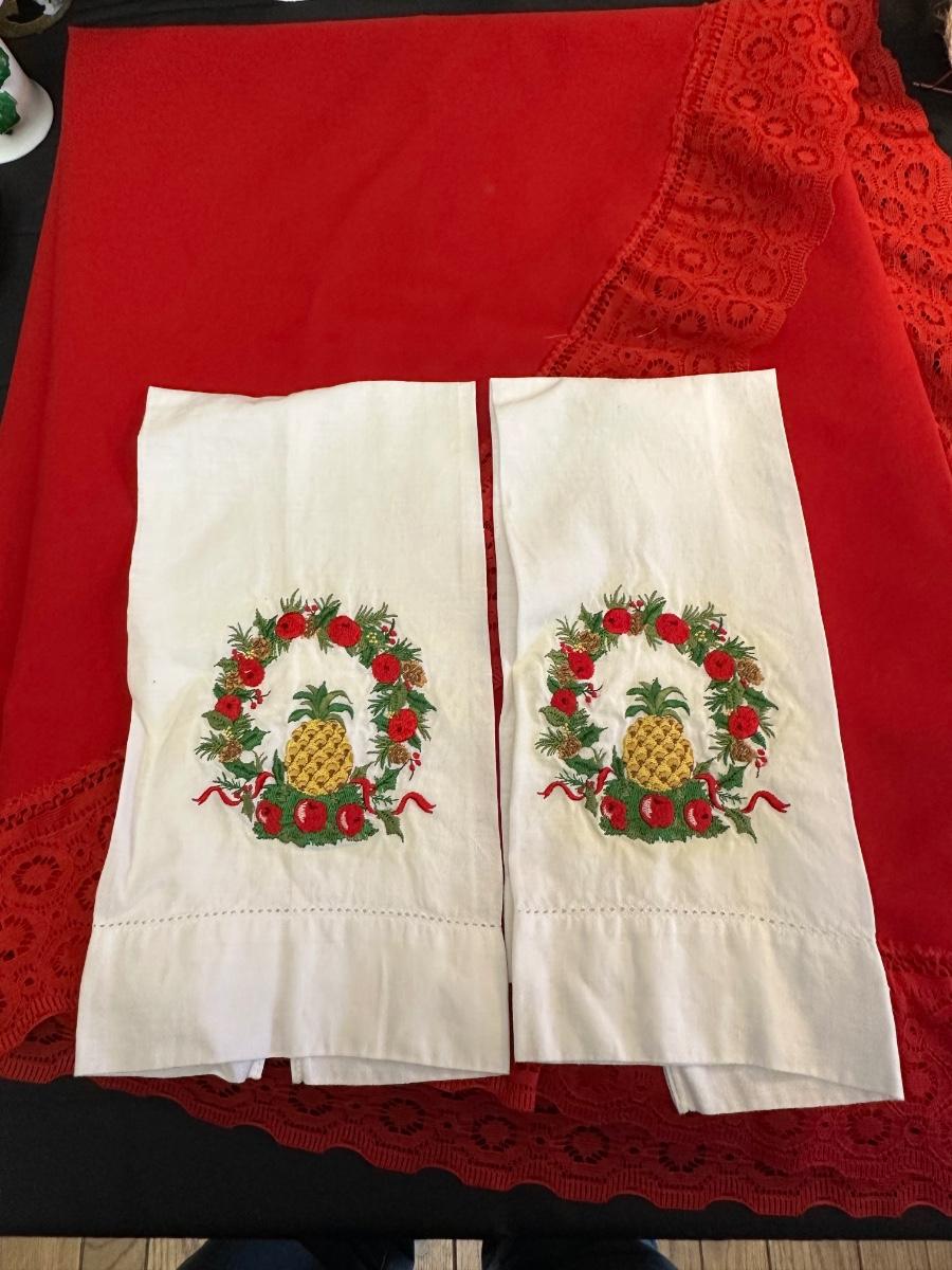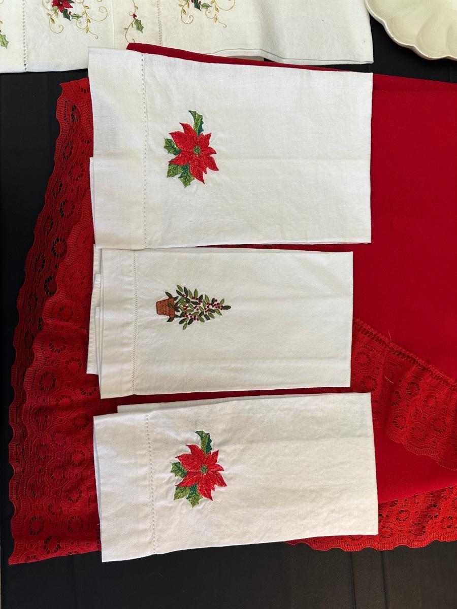 Lot of Christmas Decor including Vintage Red Table Cloth, Hand Knitted Pillow and More!