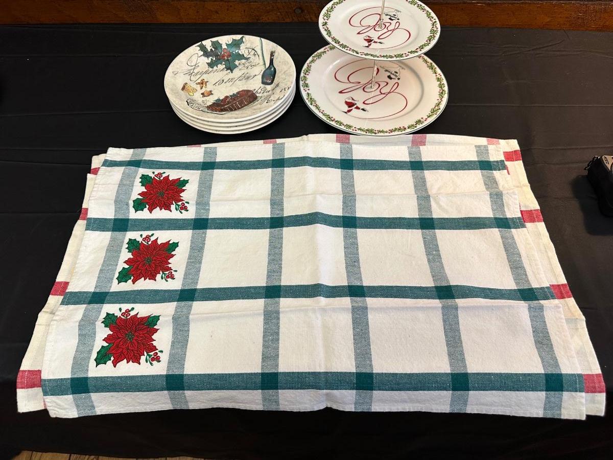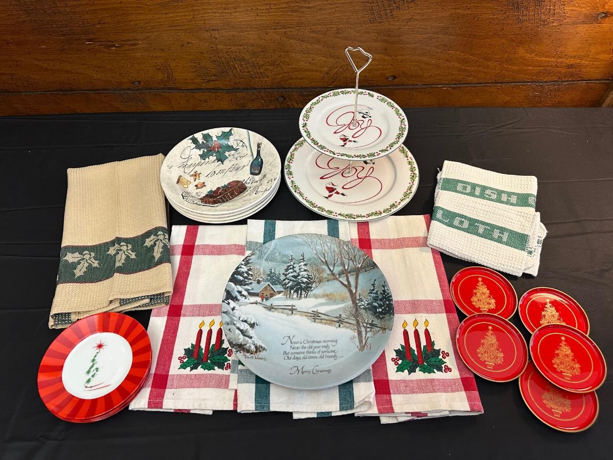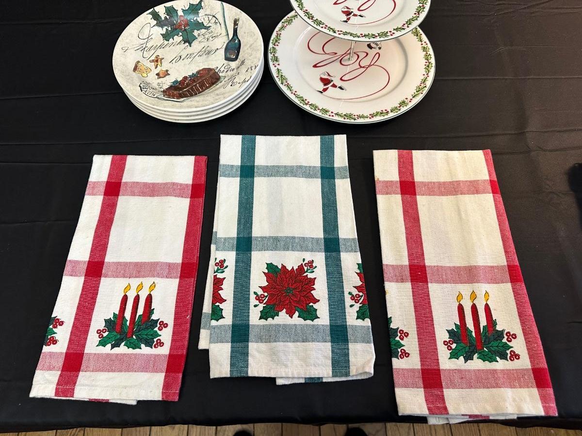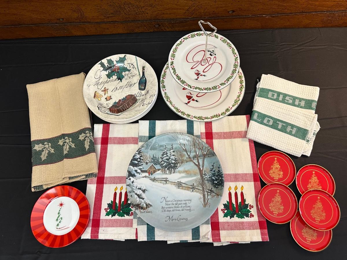 Lot of Christmas Decor including Dessert Plates from William Sonoma, Festive Dish Towels and More!