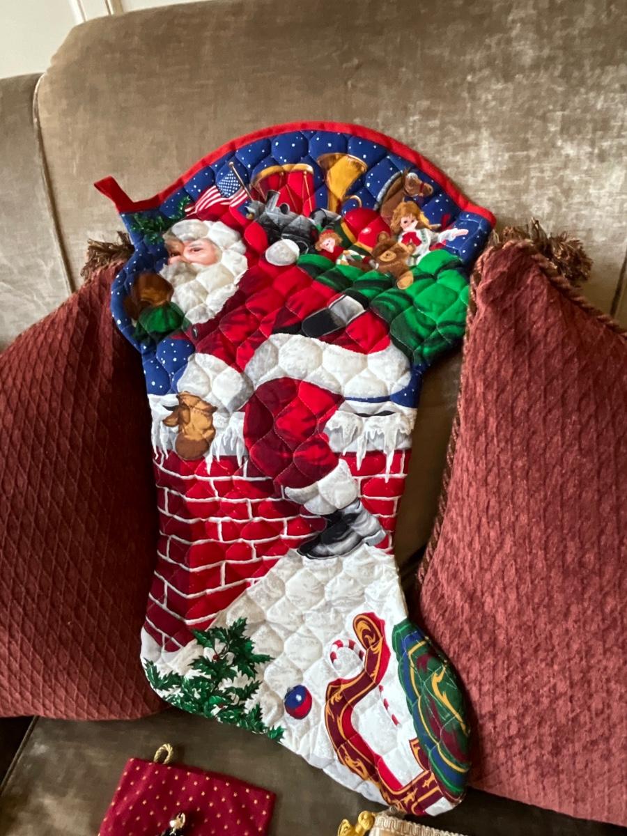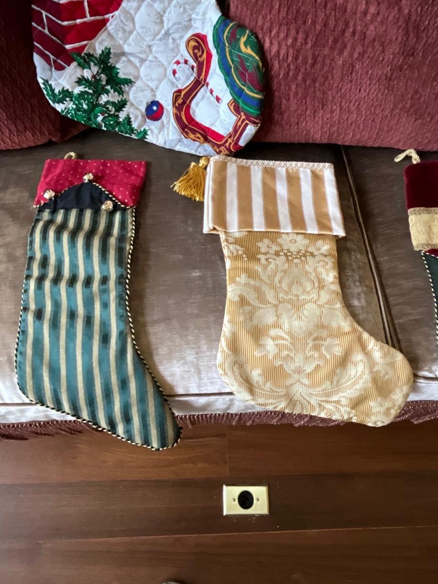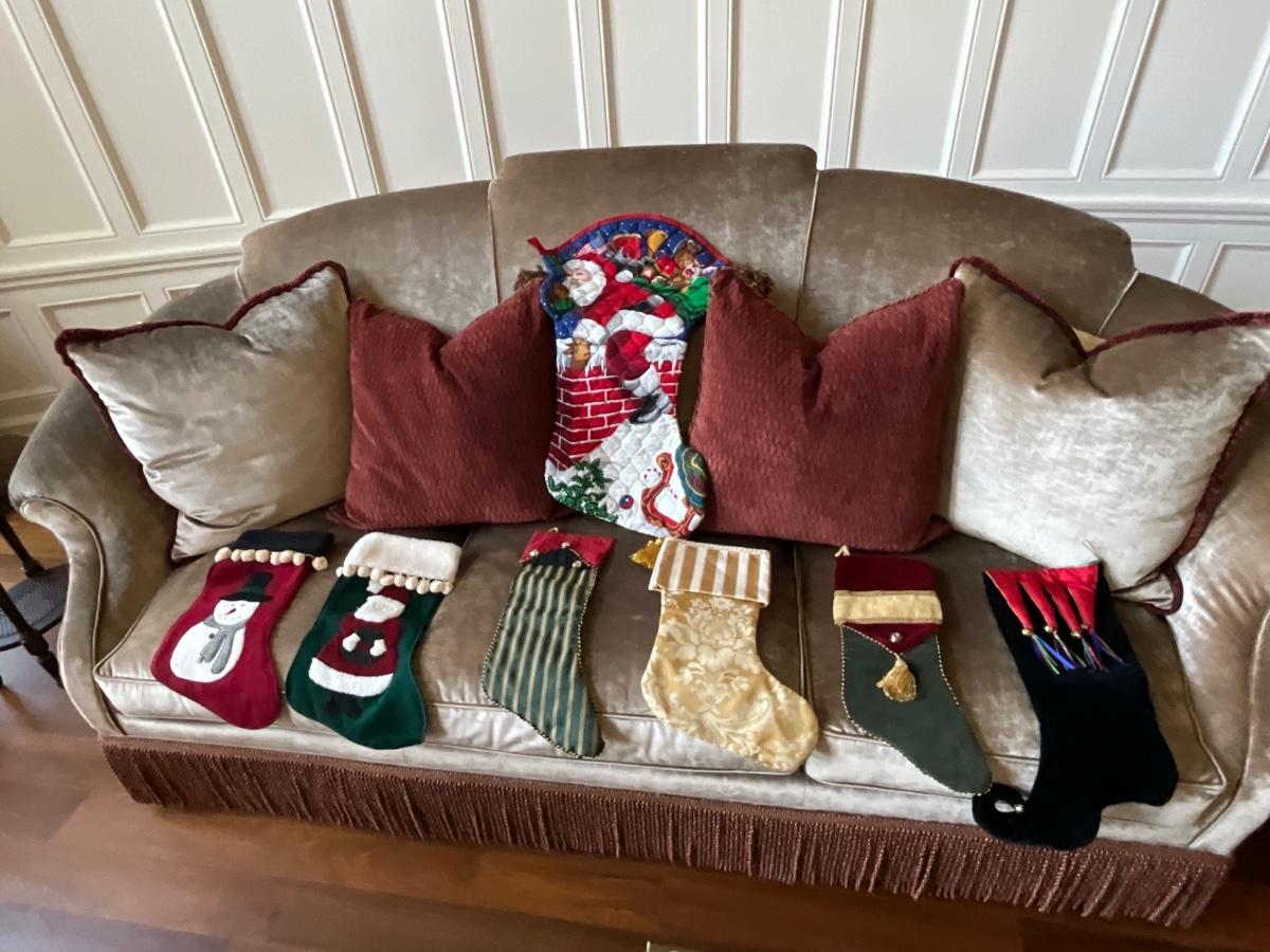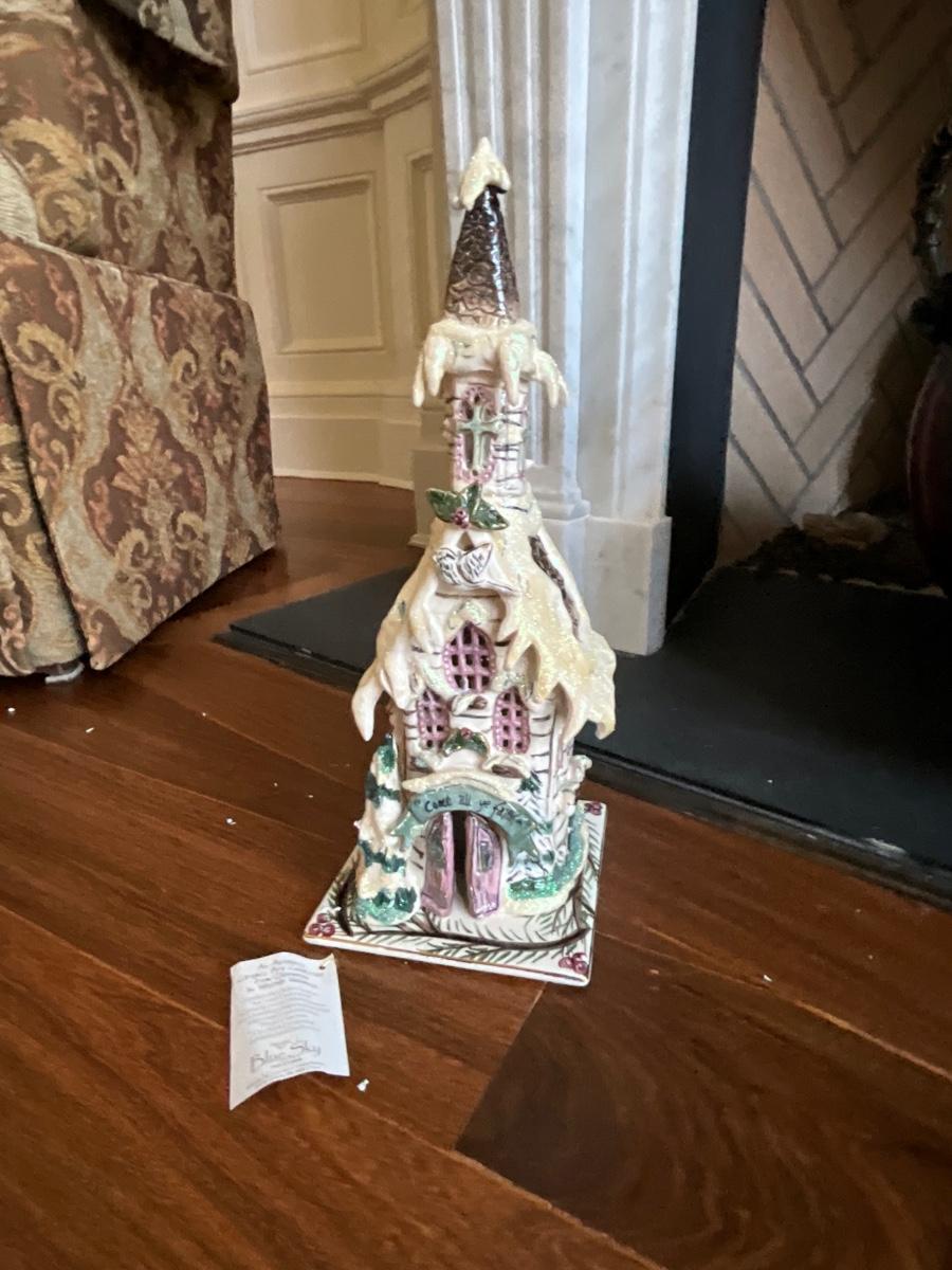 Lot of Christmas Designer Christmas Stockings, Pillow, Metal Angel, and Blue Sky Collection Porcelain Church