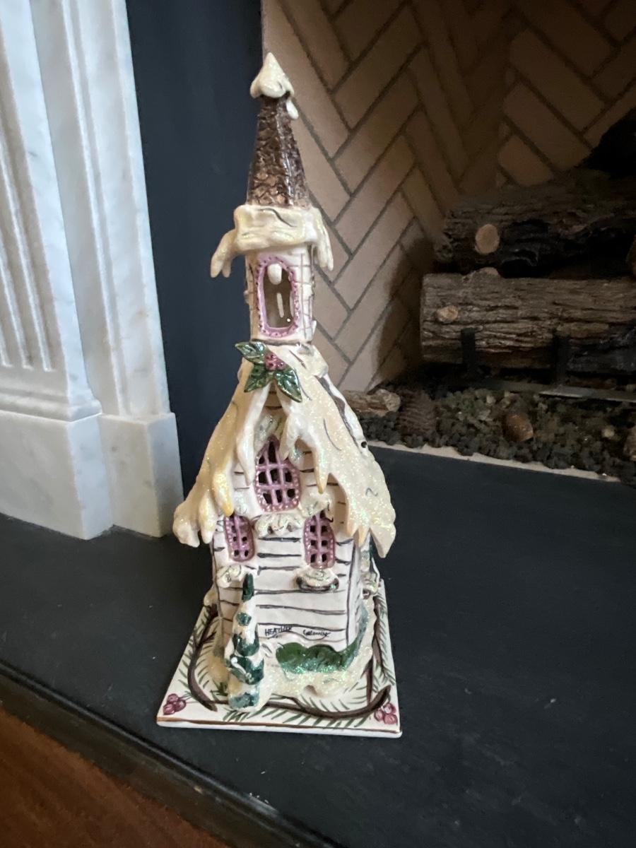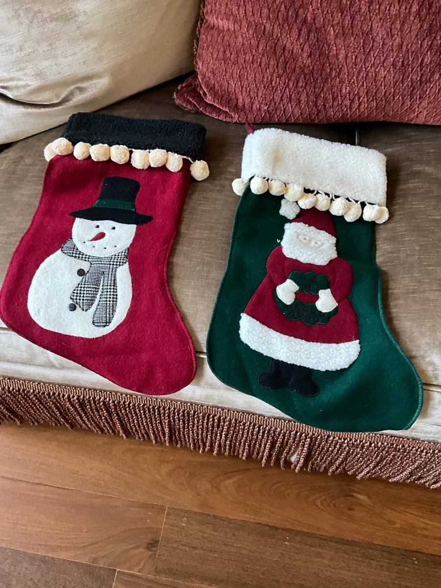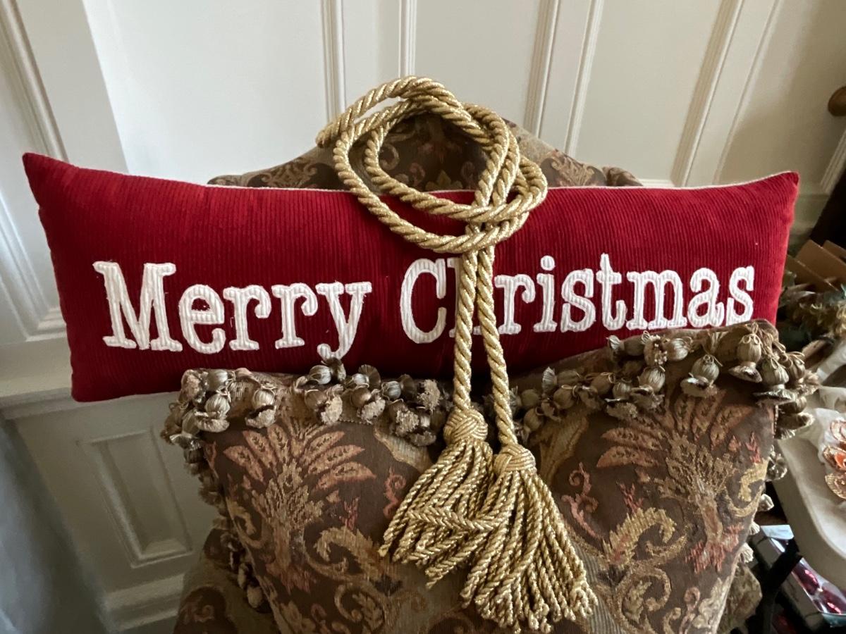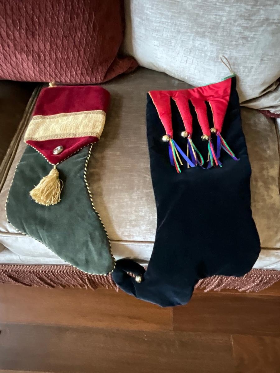 Lot of Christmas Designer Christmas Stockings, Pillow, Metal Angel, and Blue Sky Collection Porcelain Church