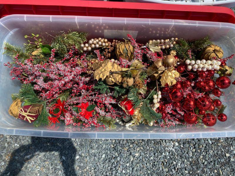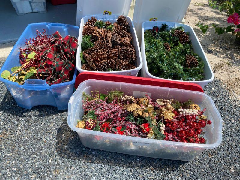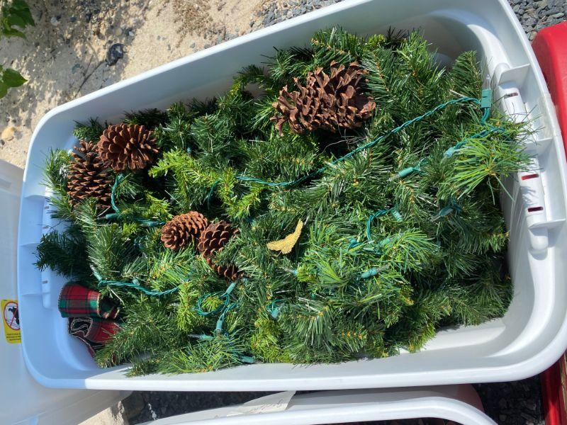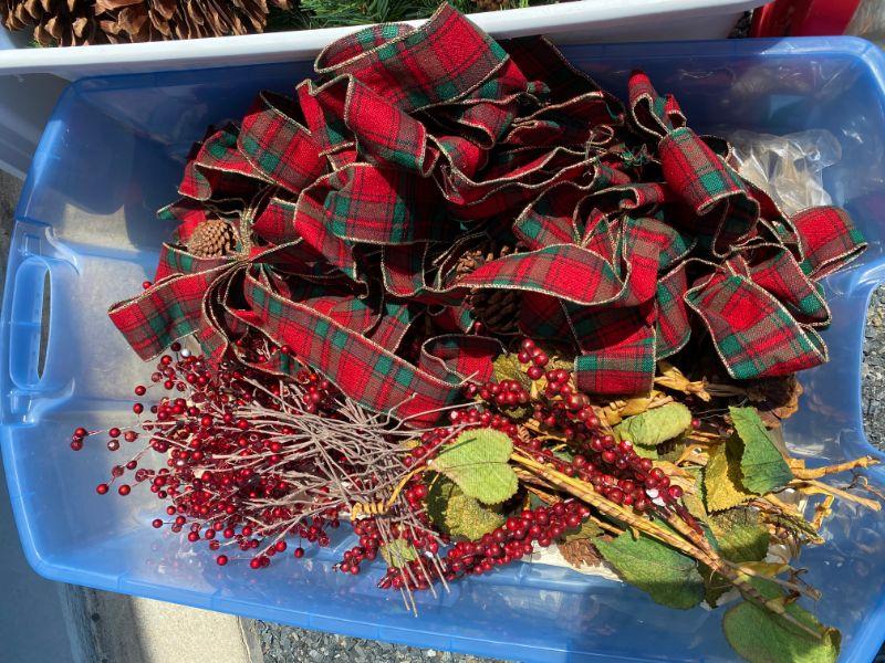 Three large tubs of christmas decor. Pre-lit garland with pinecones, ribbon and twigs of christmas berries for decorating