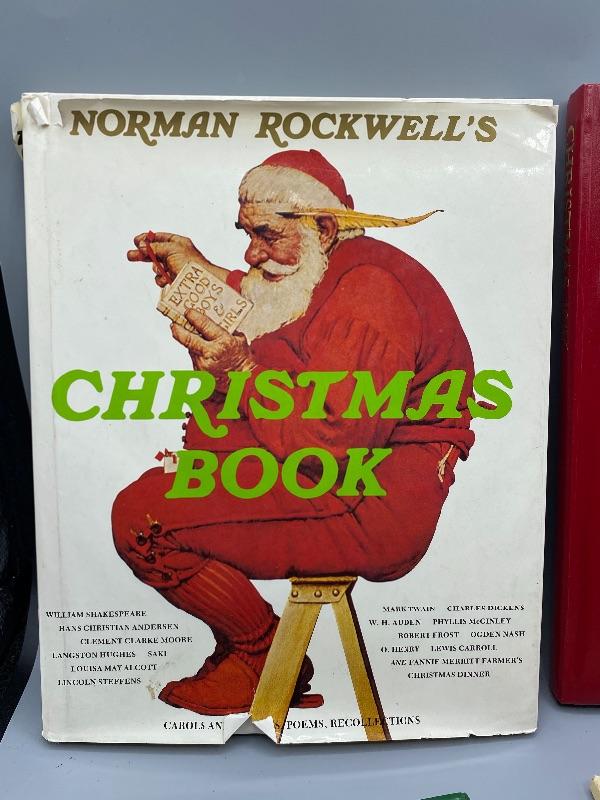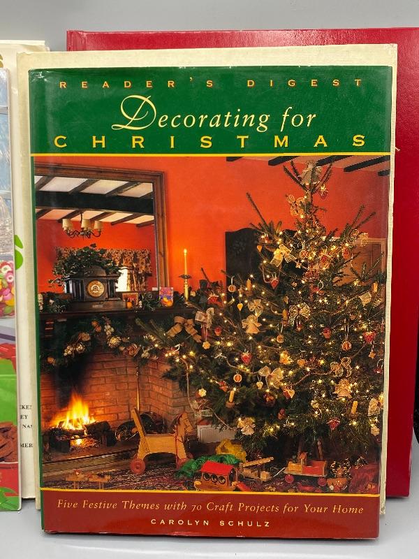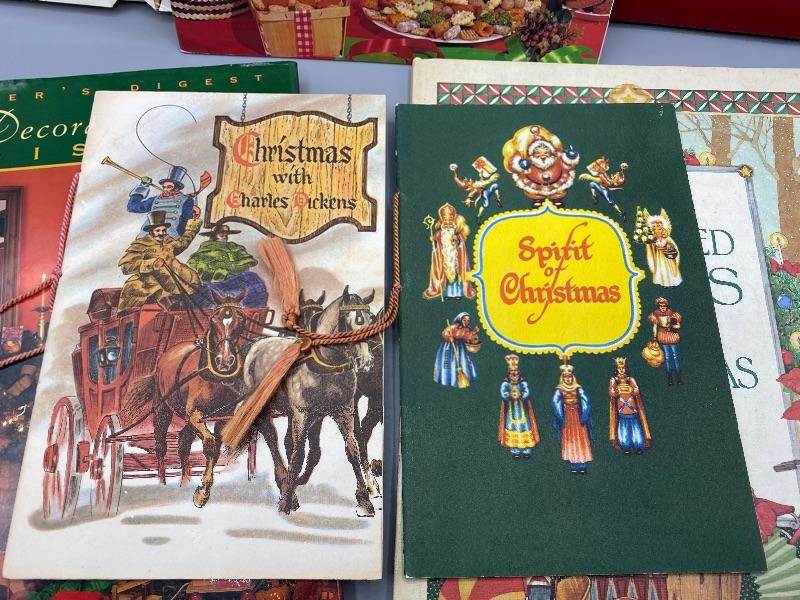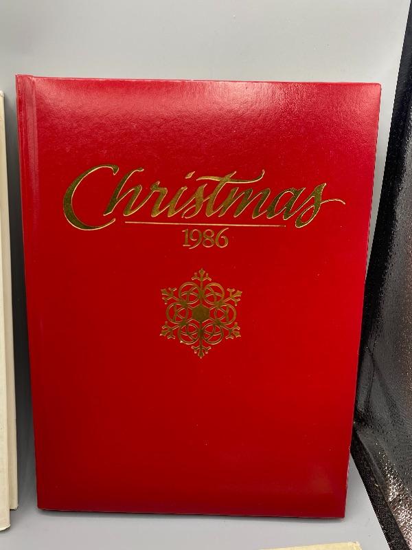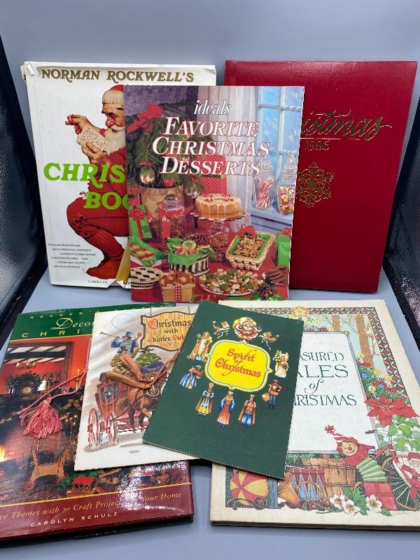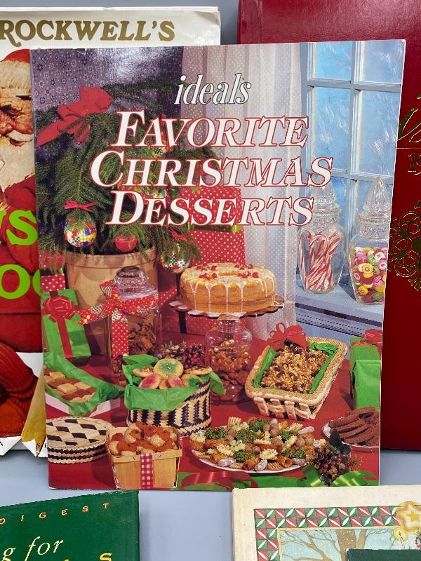 Lot of Christmas Holiday books. Included titles are Reader's Digest Decorating for Christmas, Treasured Tales of Christmas, ideals Favorite Christmas Desserts, Norman Rockwell's Christmas Book, and a Christmas 1986 Journal Book. The journal book is unused, filled with stories, recipes, songs, and blank pages to fill in memories, could be used for any year except the calendar in back is one day off.