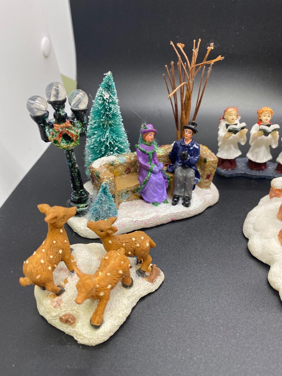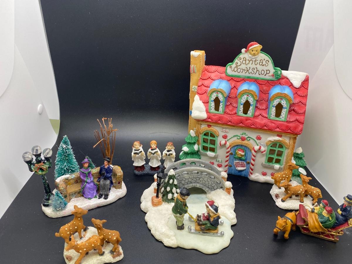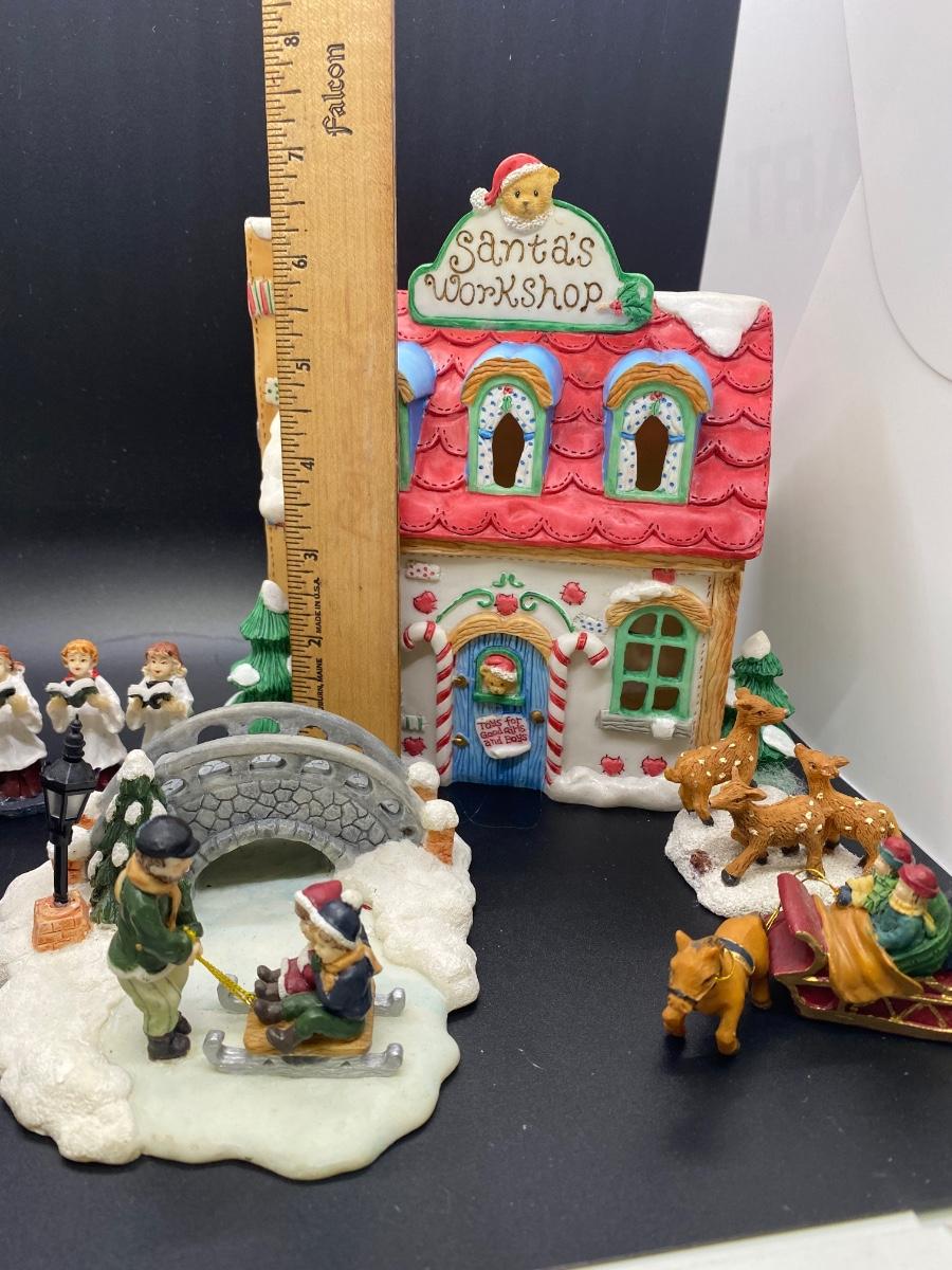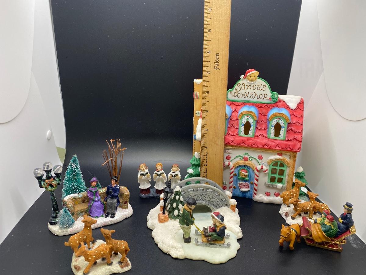 Small lot of Christmas holiday town people and Santa's Workshop building. Unbranded people but would work with Dept. 56 sized village. Santa's Workshop has spot for lighting but no electrical included. Good previously used condition.