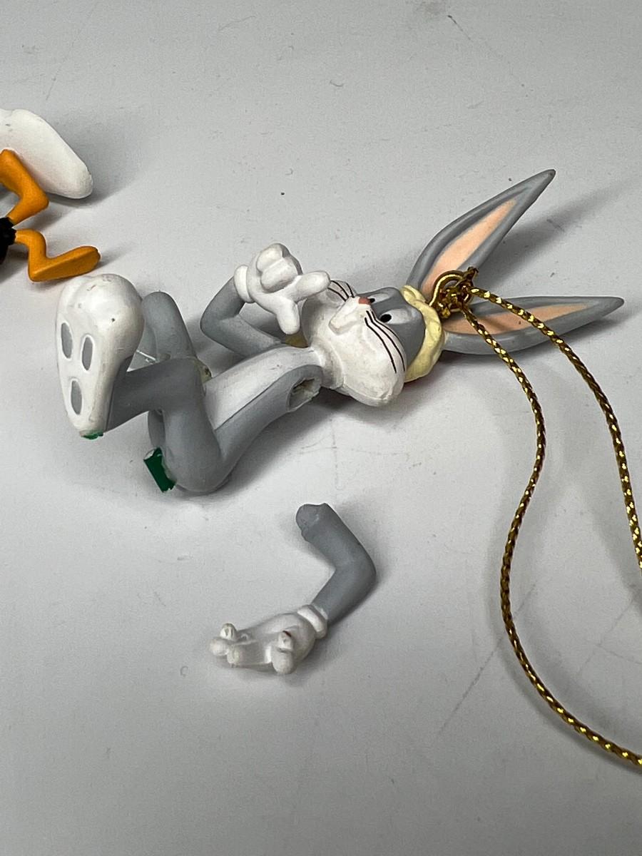 There is a Bugs Bunny ornament that is worn and there is some light wear to the rest of the ornaments, but there is no significant damage to the rest and is in overall good displayable condition. Check pictures for more details and for sizing.