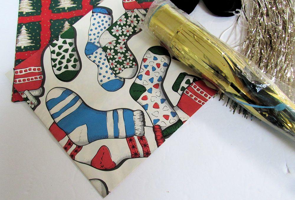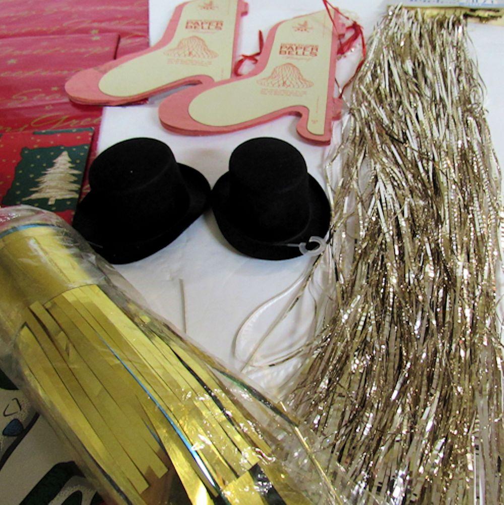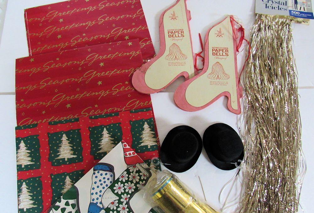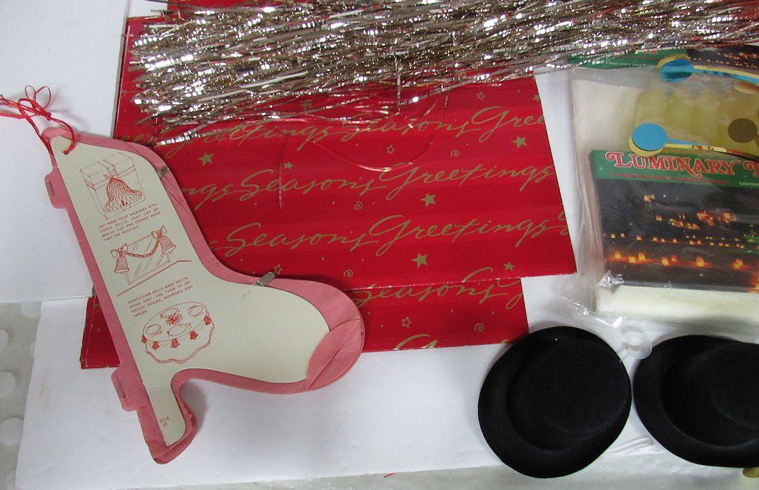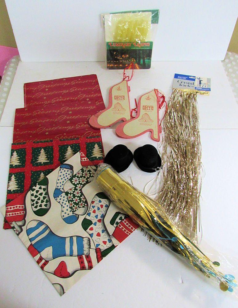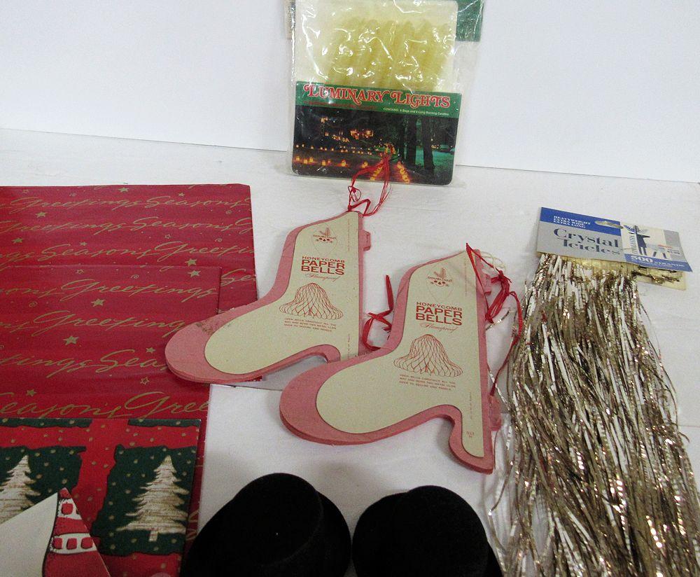 Lot of Christmas: Vintage Wrapping Paper, Honeycomb Bells, 2 Snowman Felt Hats, Candles Luminary Lights, More