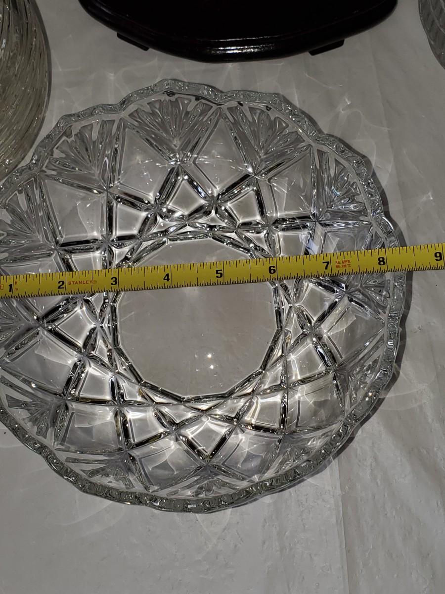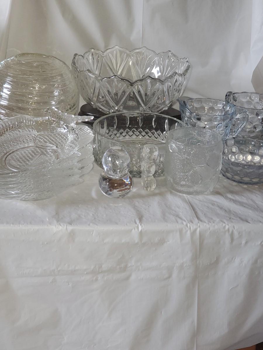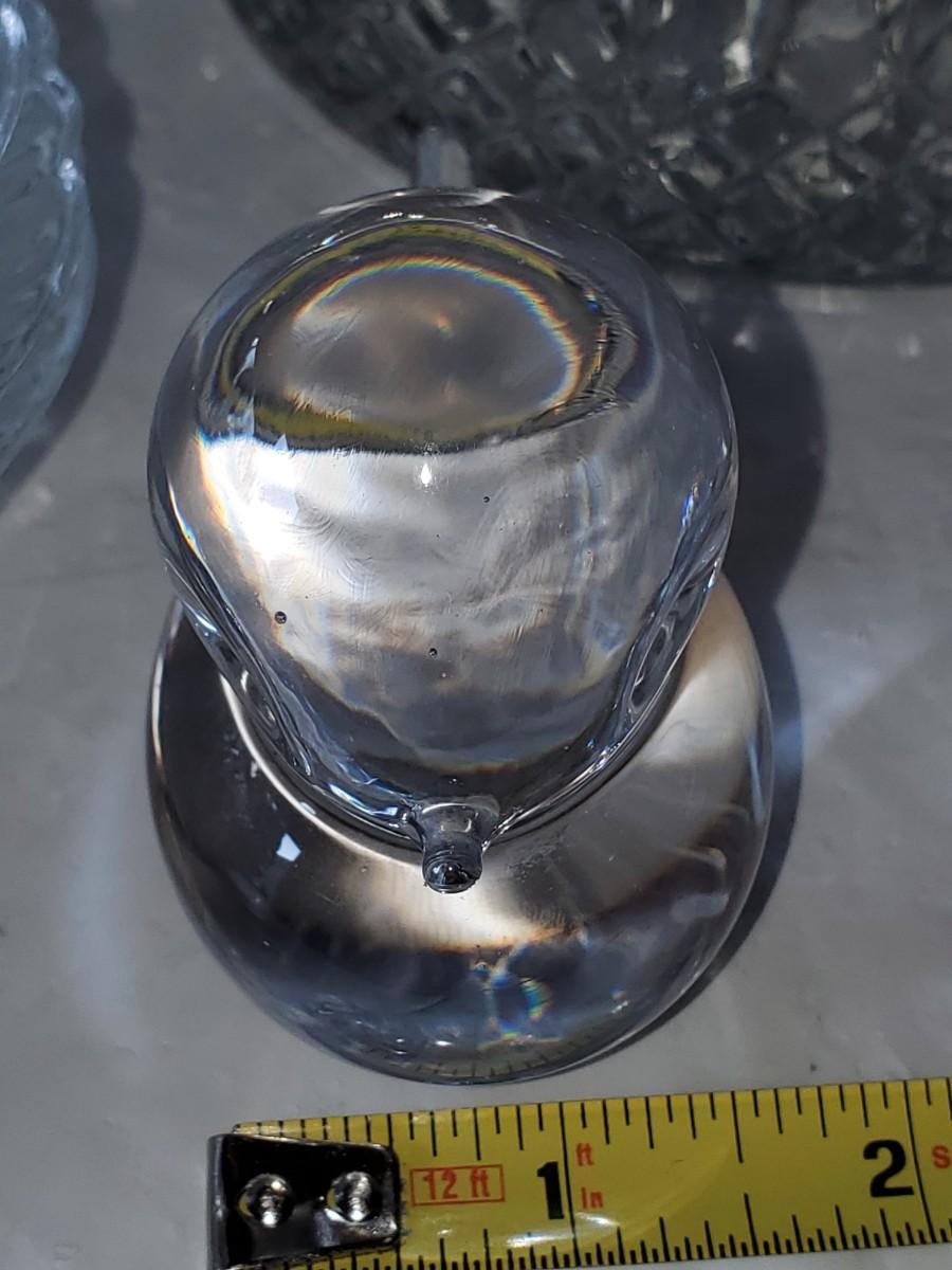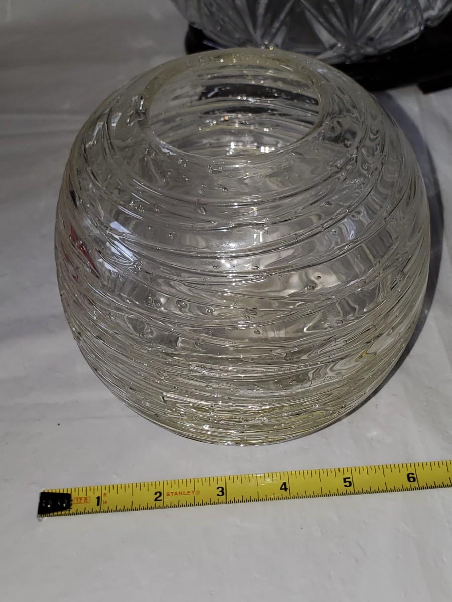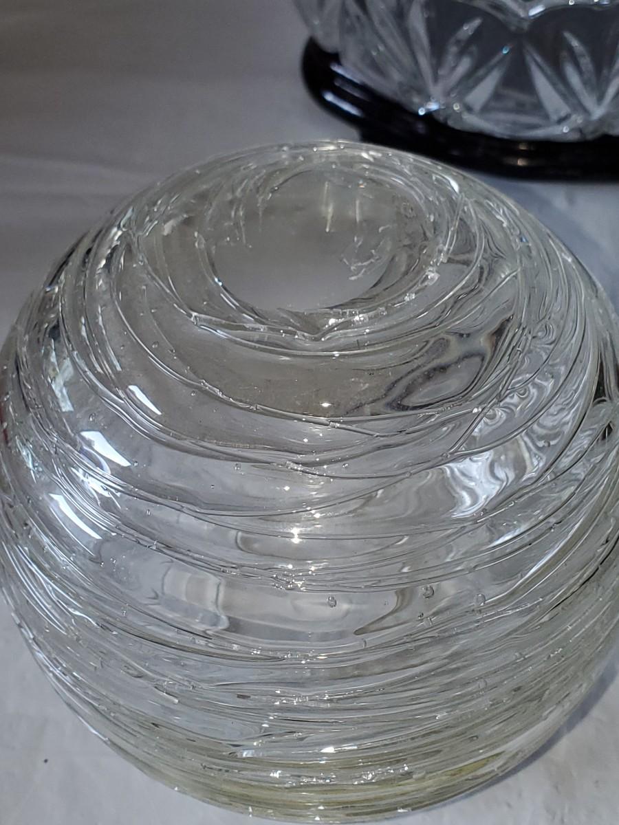 Off White clear glass hand-blown vase with strings of glass around outside.